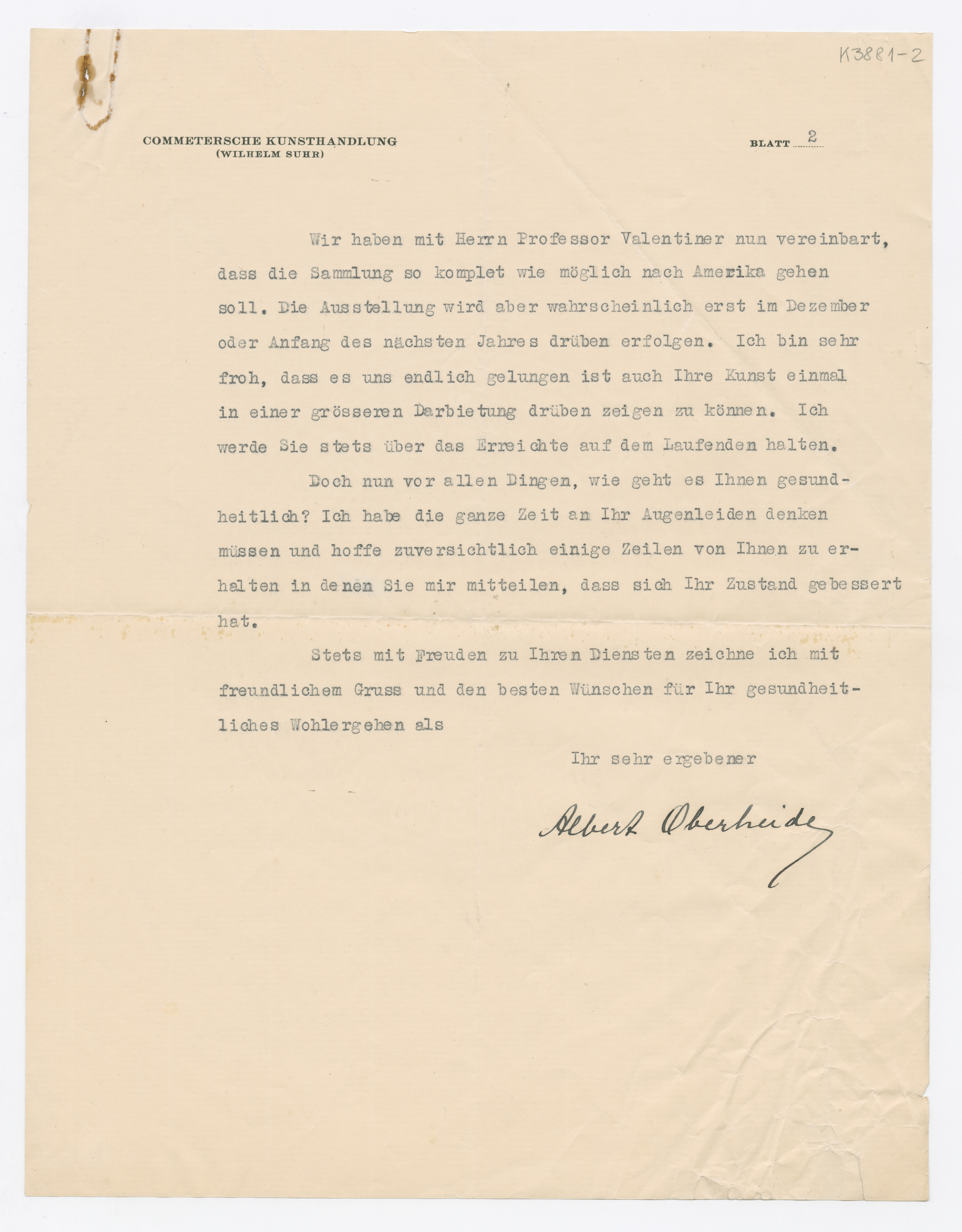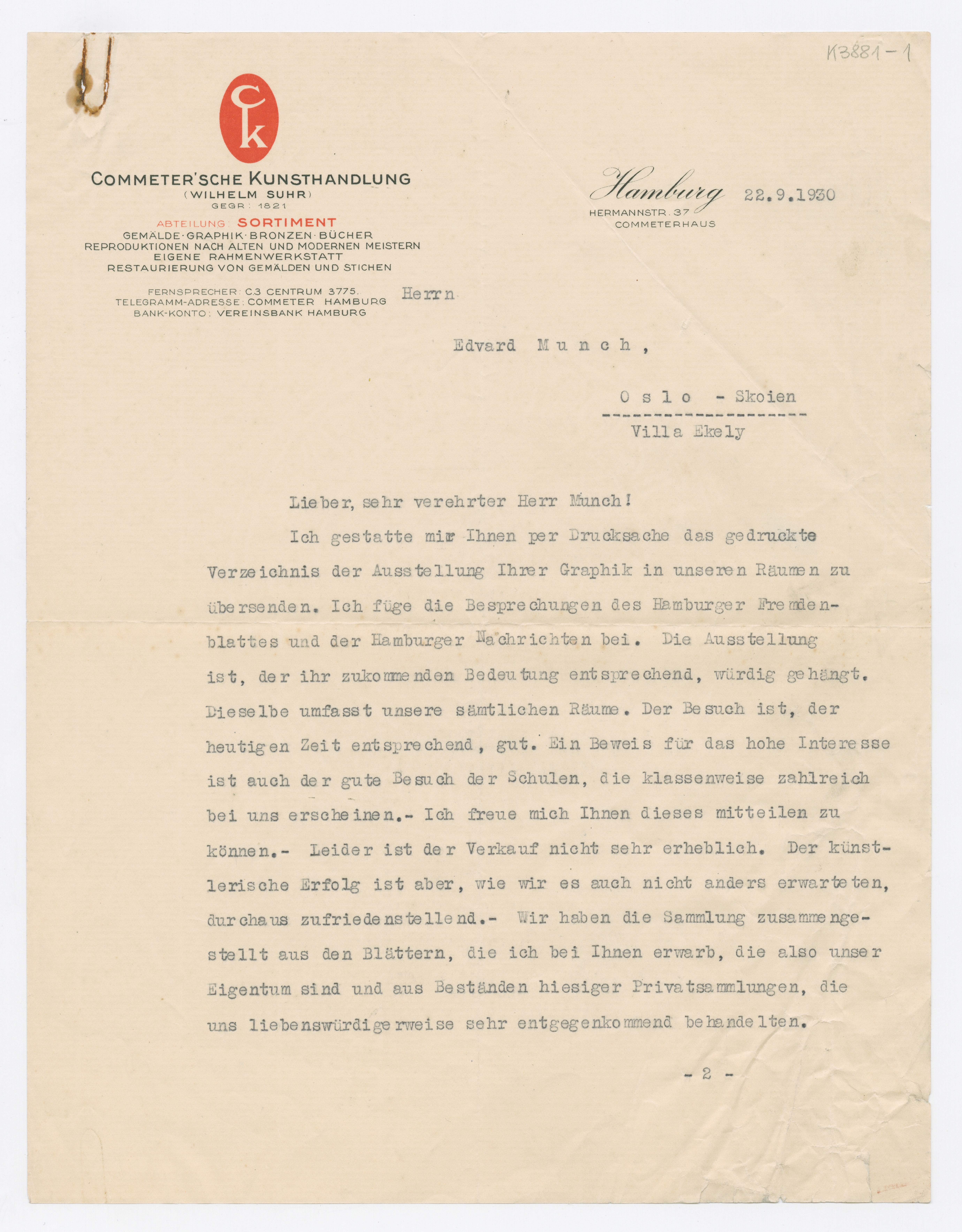 MM K 3881, Munchmuseet. Datert 22.09.1930. Brev fra Albert Oberheide, Commeter'sche Kunsthandlung.