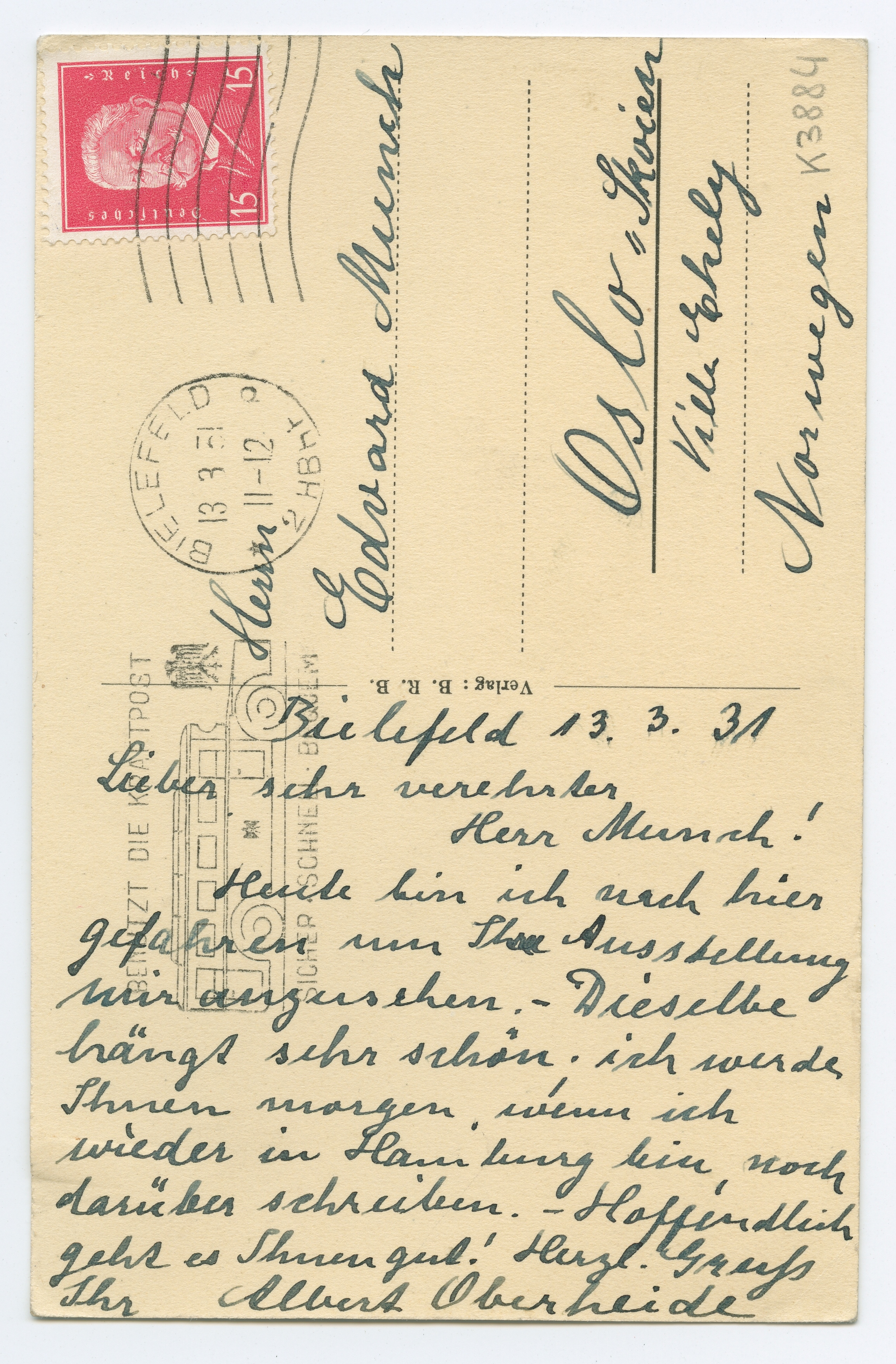 MM K 3884, Munchmuseet. Datert 13.03.1931. Brev fra Albert Oberheide, Commeter'sche Kunsthandlung.