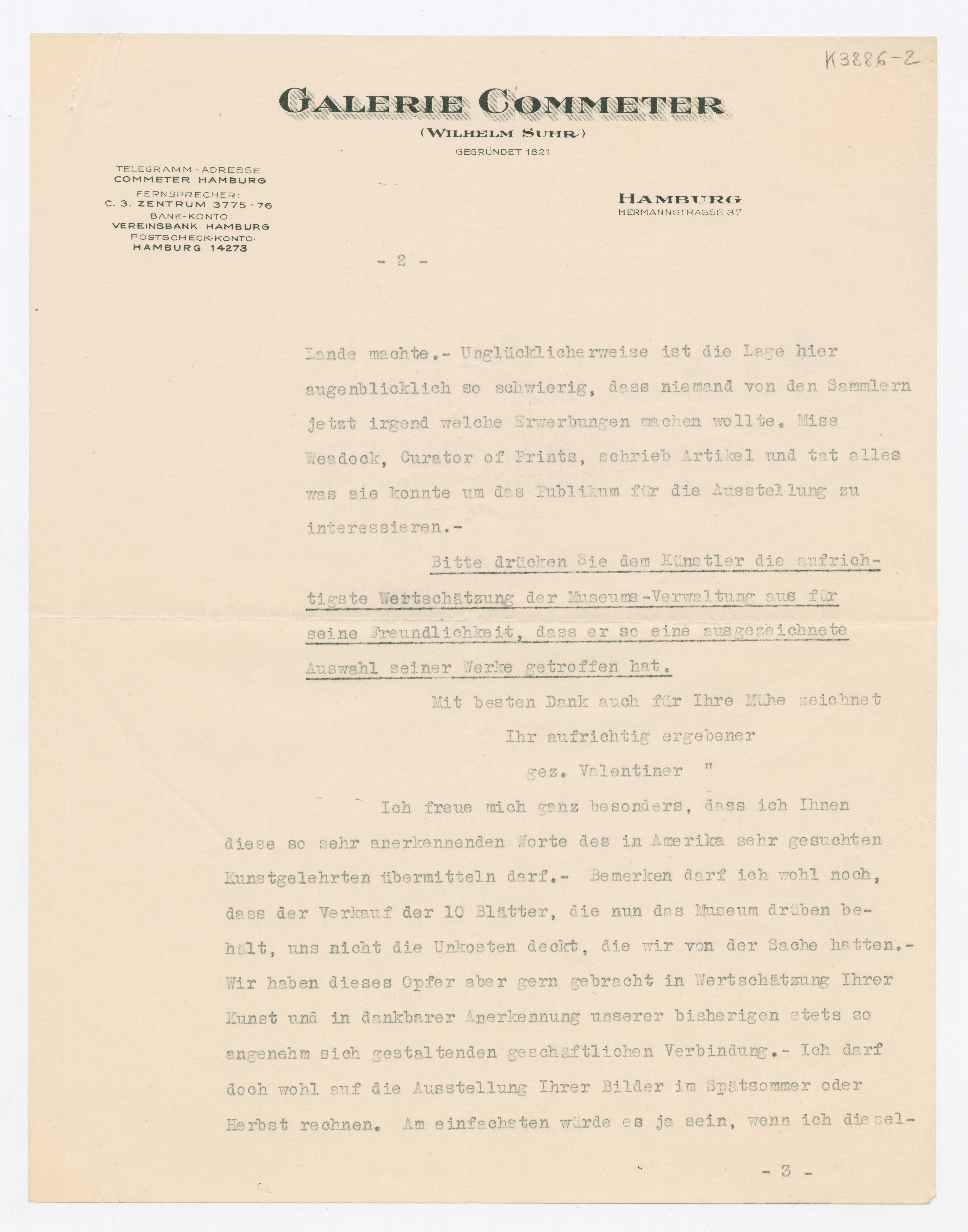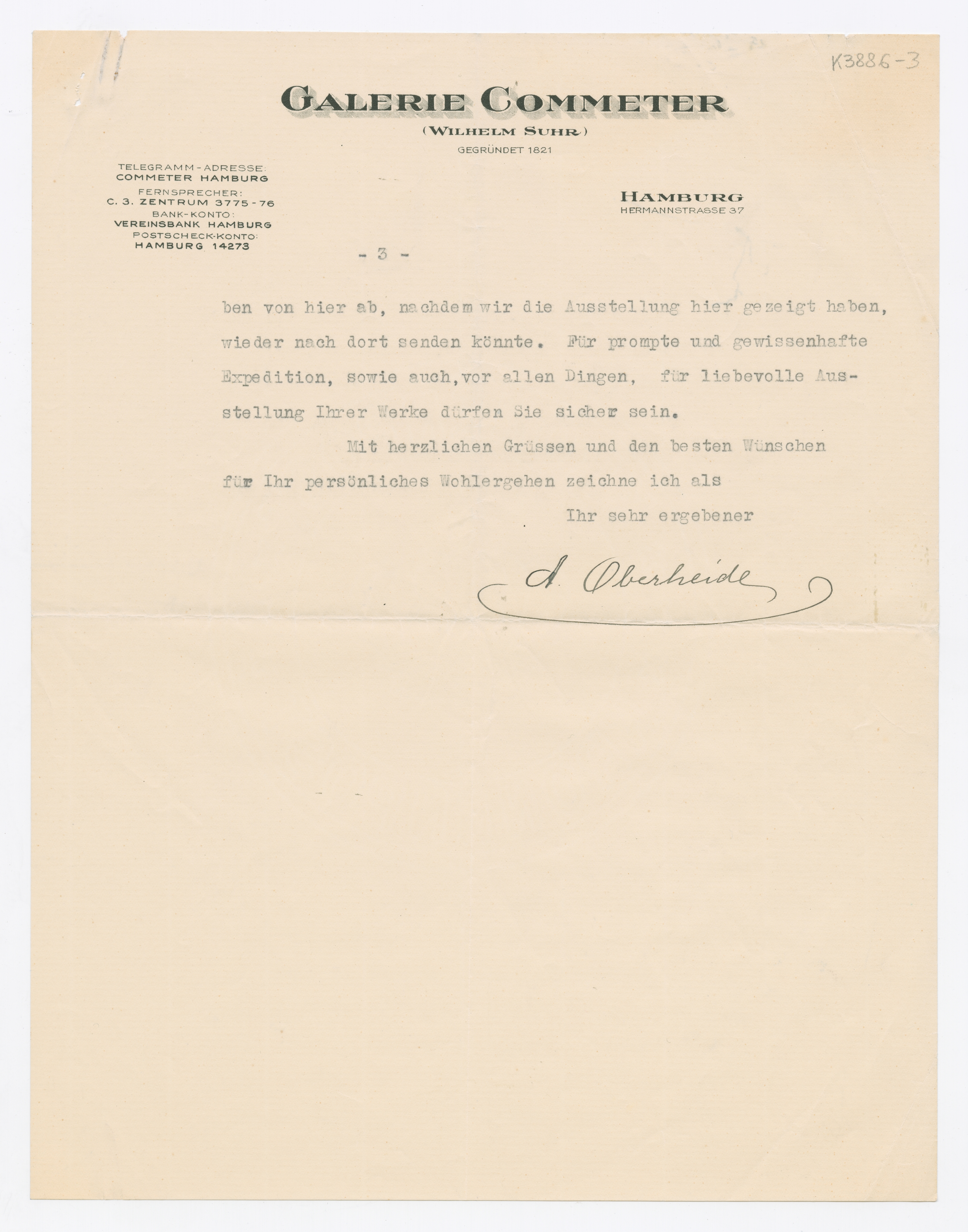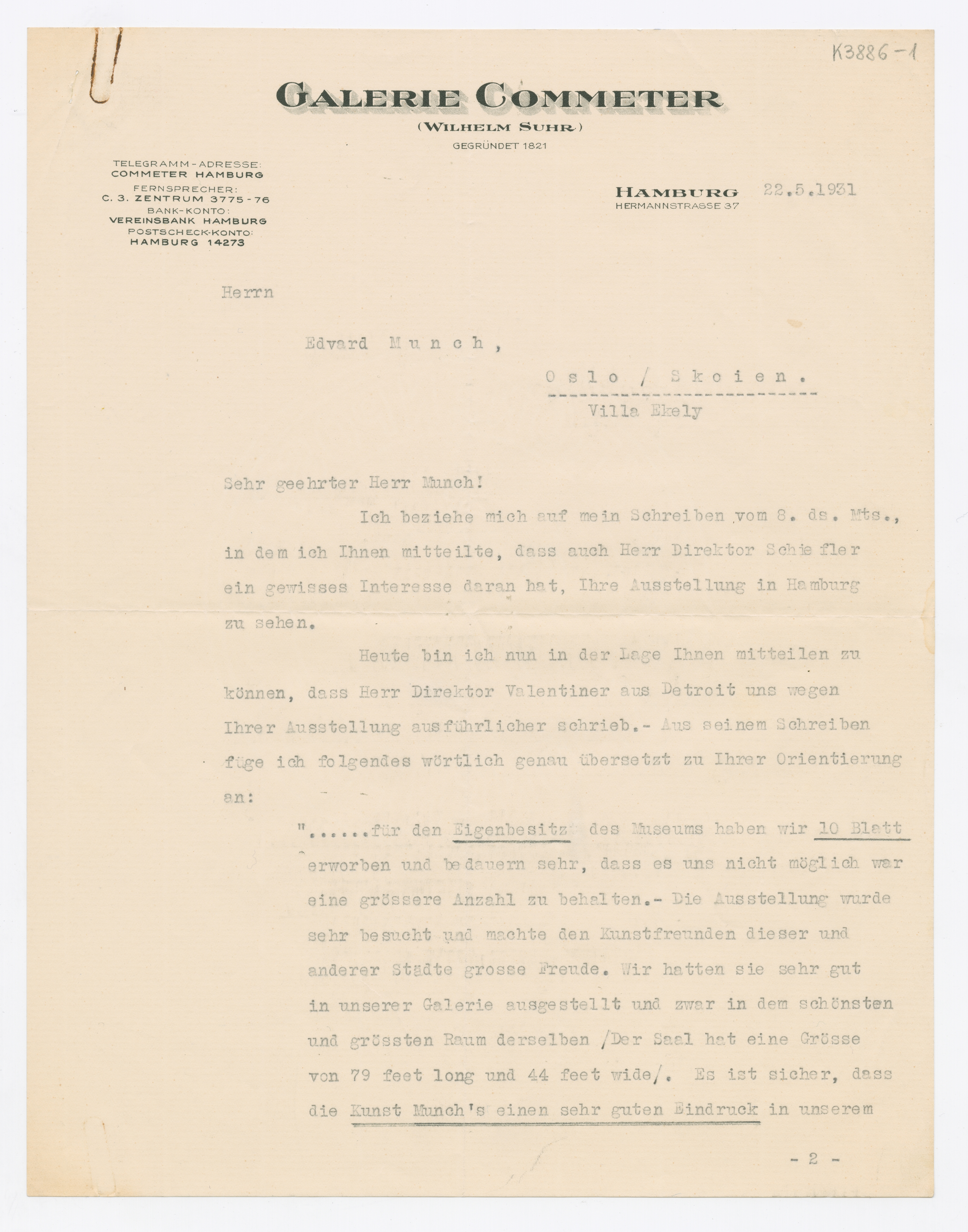 MM K 3886, Munchmuseet. Datert 22.05.1931. Brev fra Albert Oberheide, Commeter'sche Kunsthandlung.