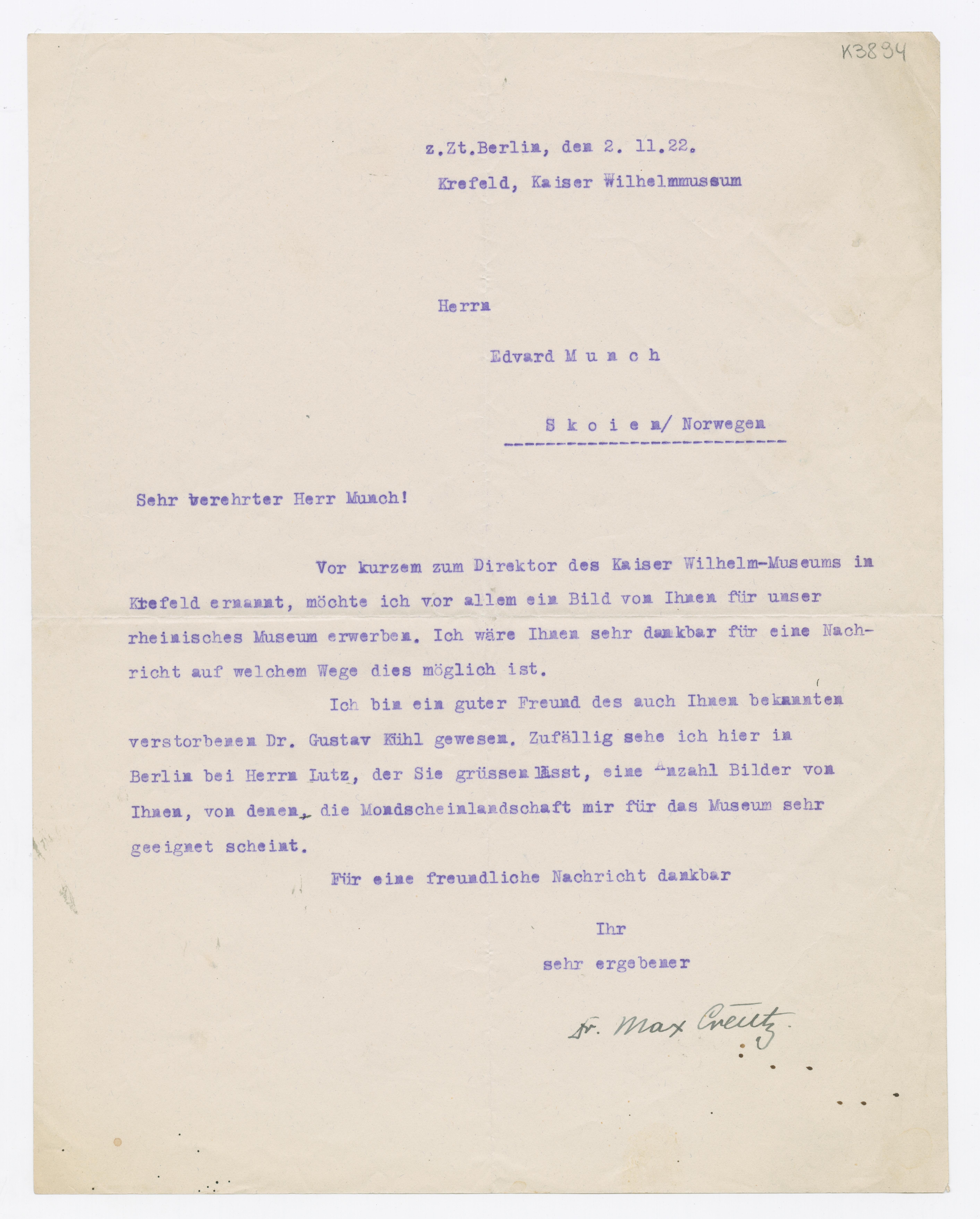 MM K 3894, Munchmuseet. Datert 02.11.1922. Brev fra Max Creutz, Kaiser Wilhelm Museum.