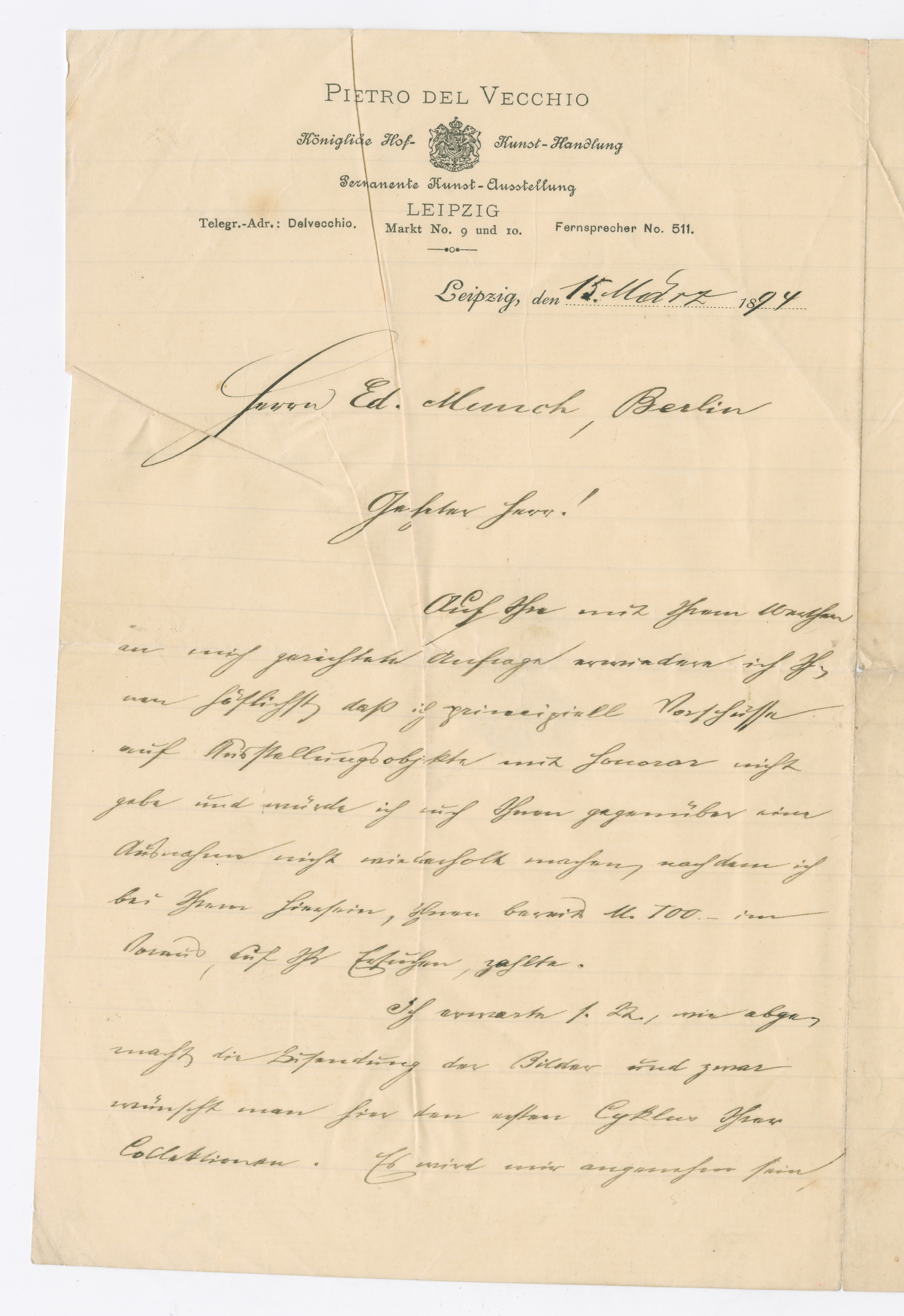 MM K 3909, Munchmuseet. Datert 15.03.1894. Brev fra Pietro Del Vecchio, Königliche Hof-Kunst-Handlung Permanente Kunst-Ausstellung.