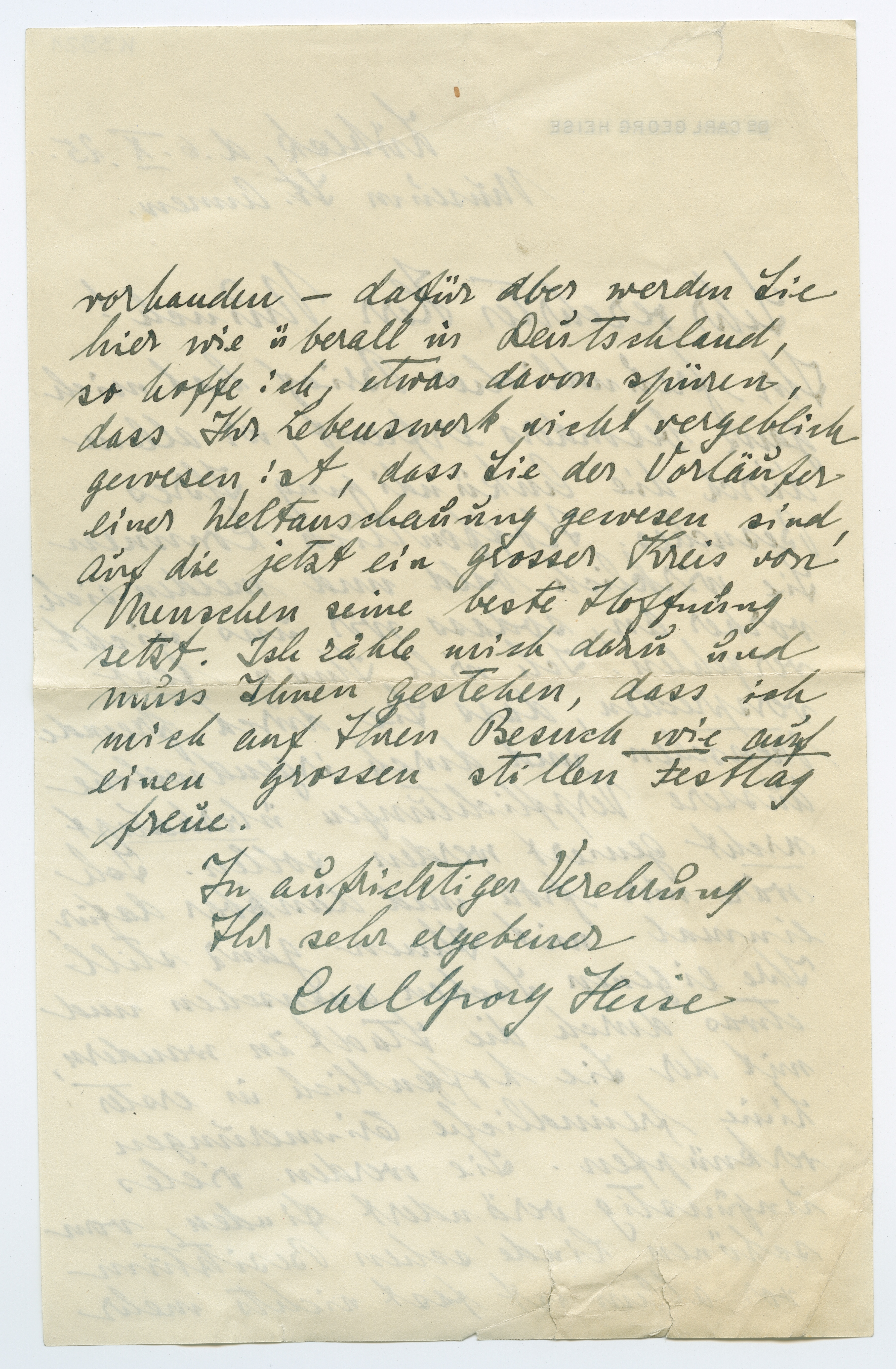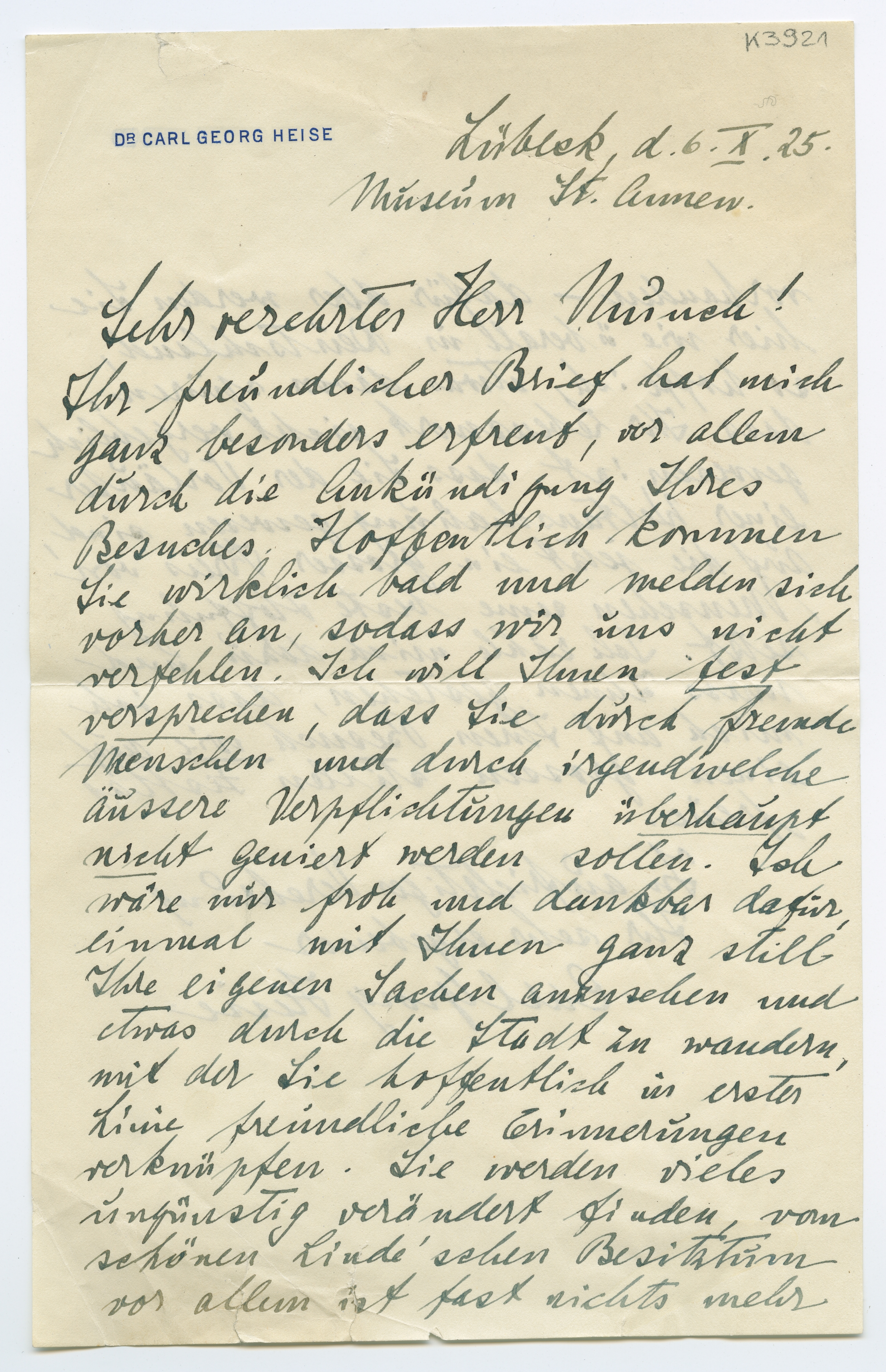 MM K 3921, Munchmuseet. Datert 06.10.1925. Brev fra Carl Georg Heise, Museum für Kunst- und Kulturgeschichte.