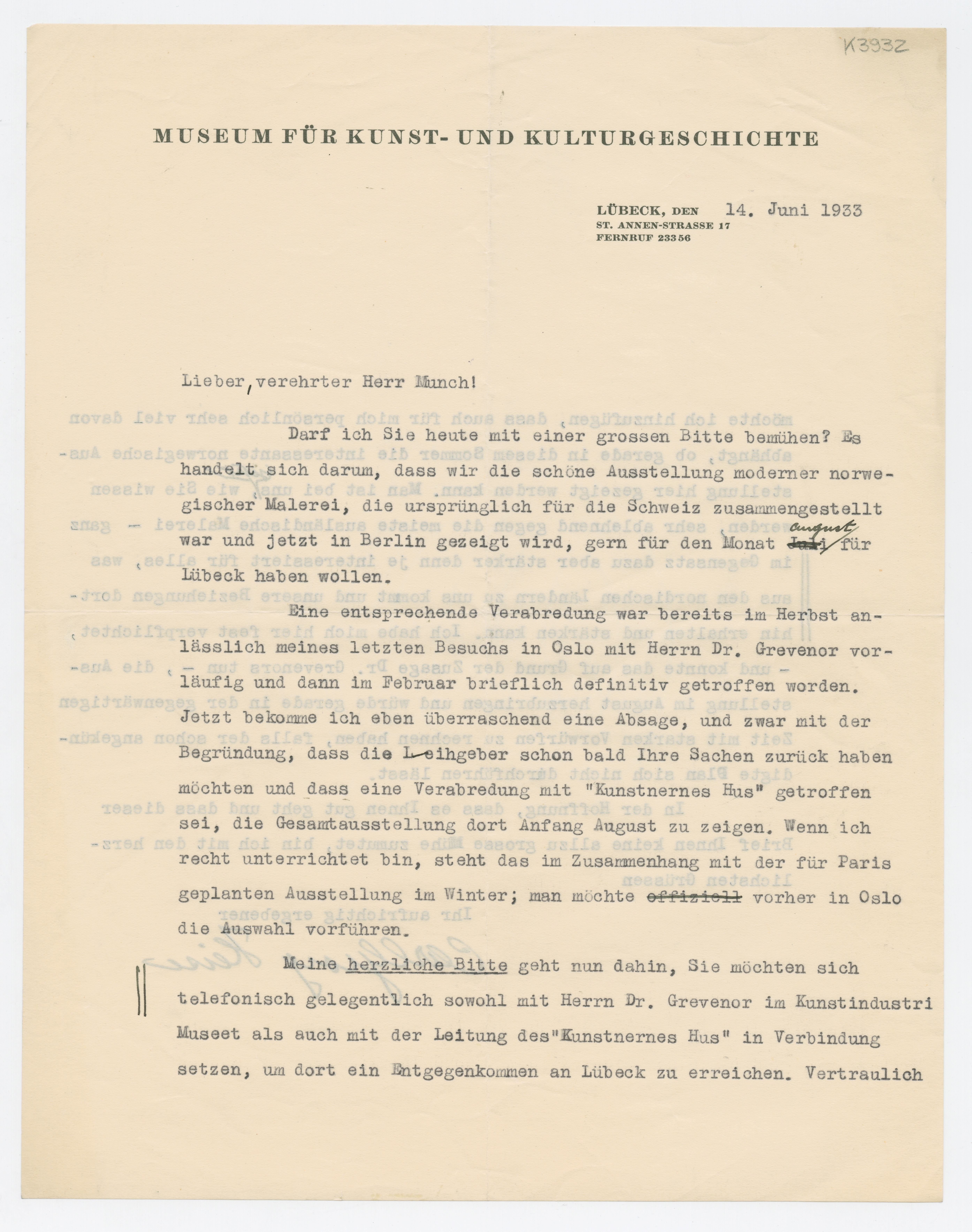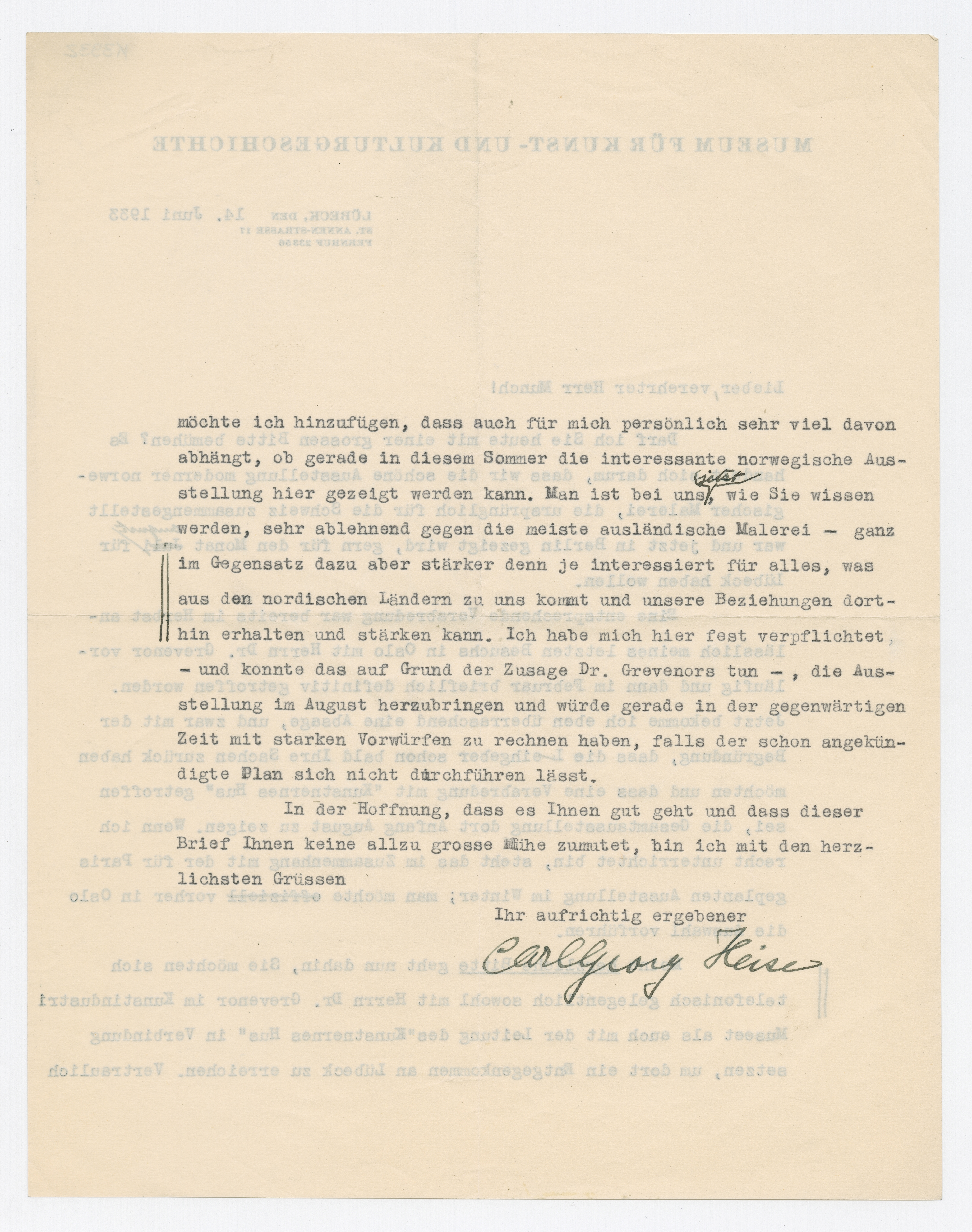 MM K 3932, Munchmuseet. Datert 14.06.1933. Brev fra Carl Georg Heise, Museum für Kunst- und Kulturgeschichte.