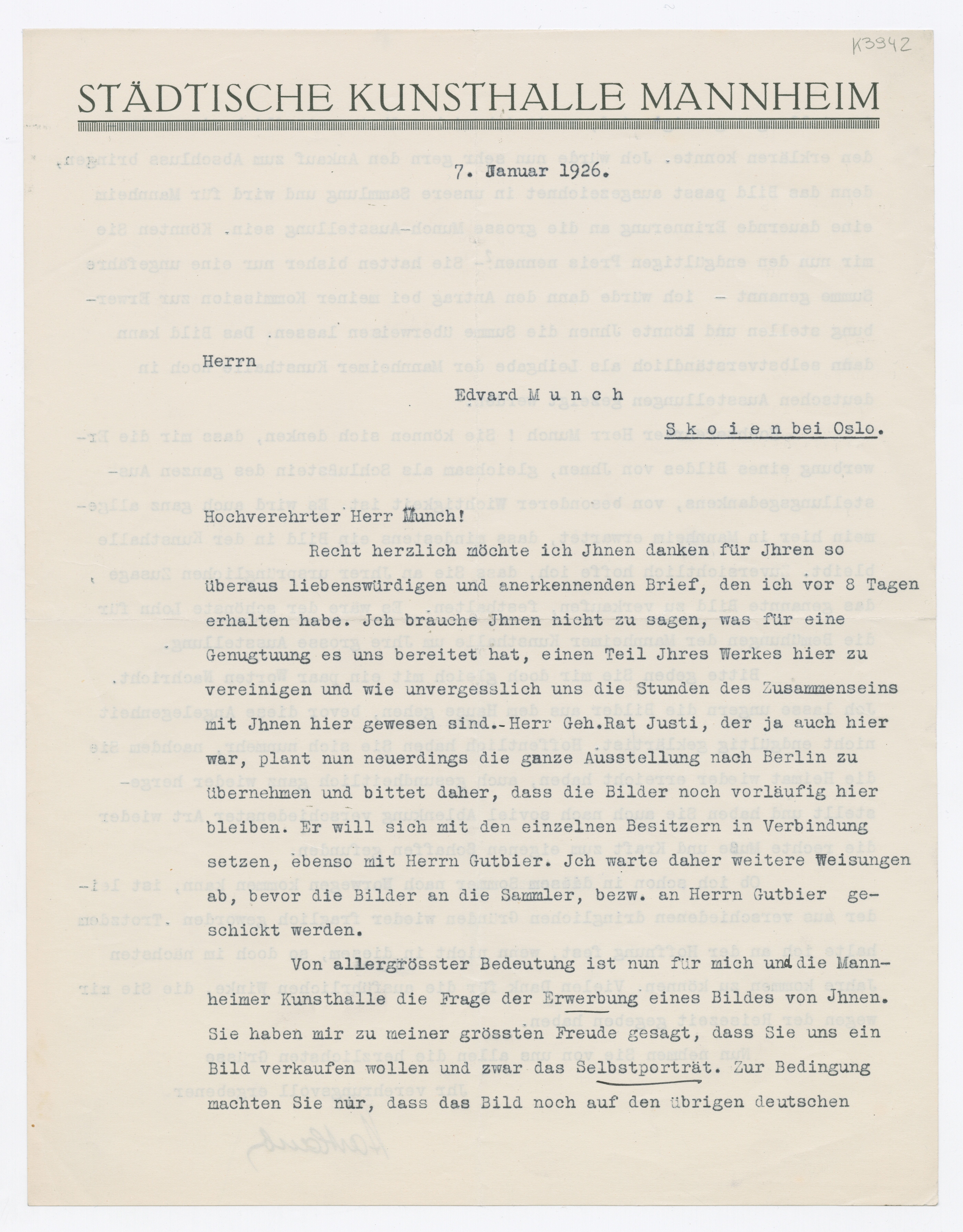 MM K 3942, Munchmuseet. Datert 07.01.1926. Brev fra Gustav Hartlaub, Stadtische Kunsthalle Mannheim.