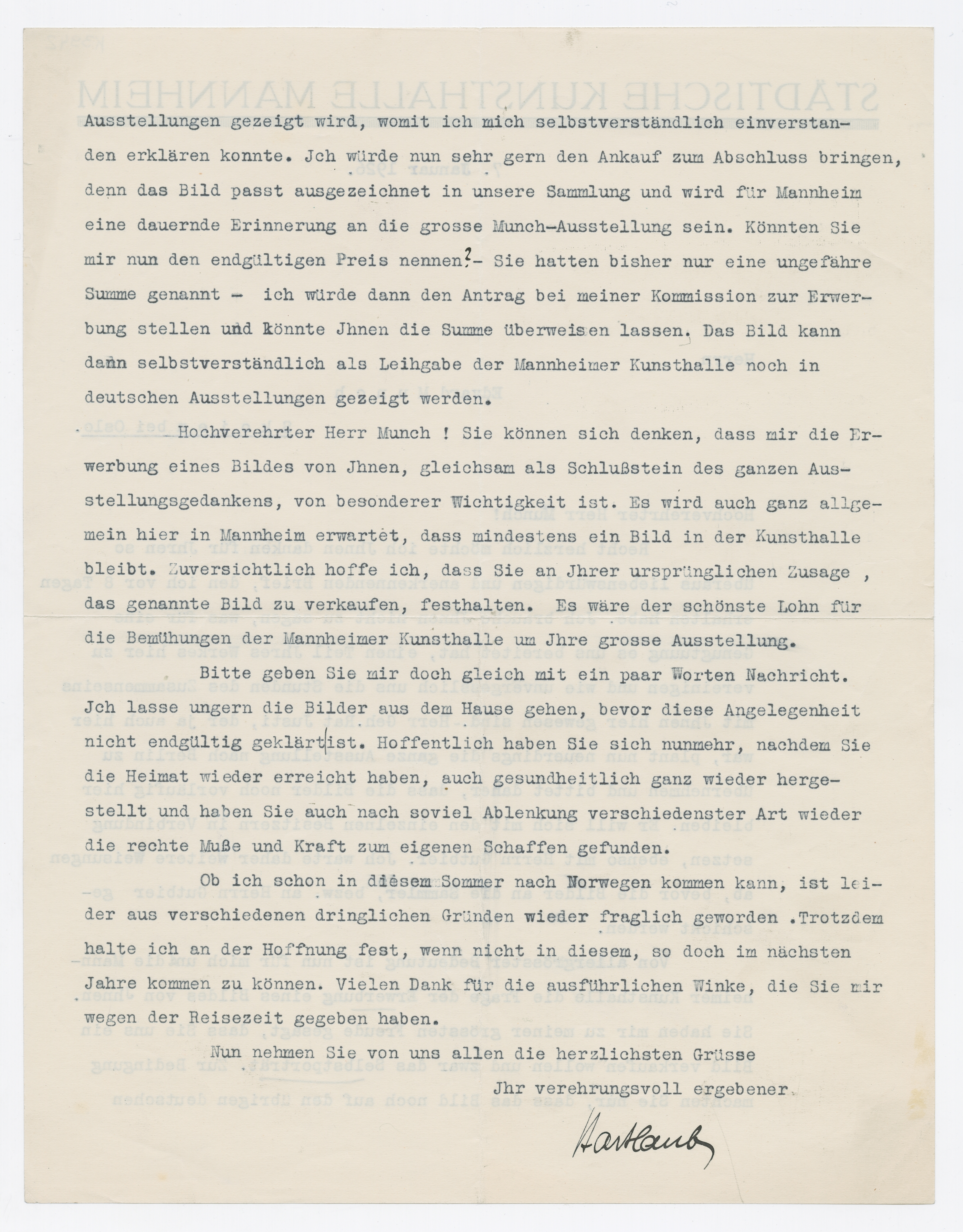 Brev fra Gustav Hartlaub, Stadtische Kunsthalle Mannheim.