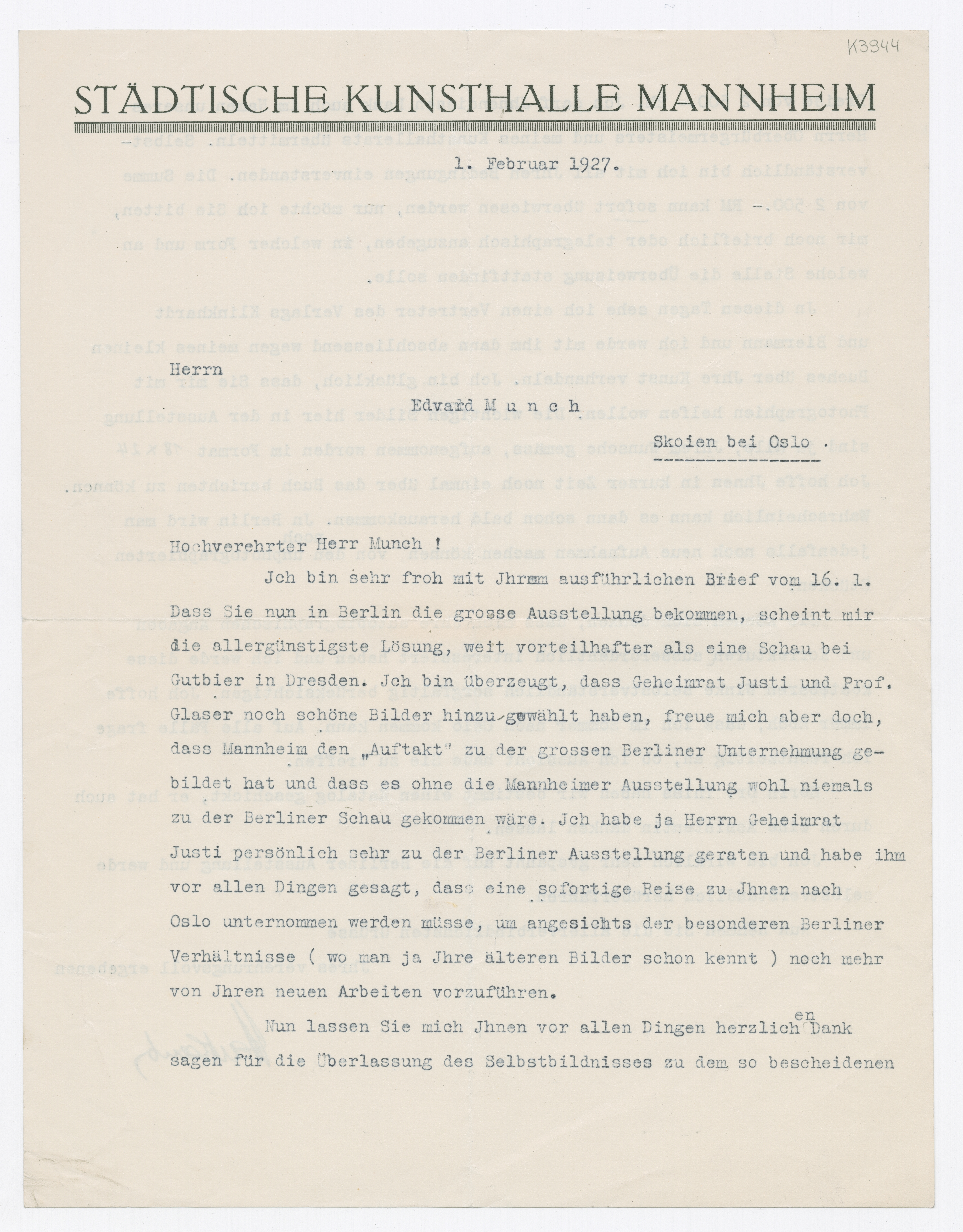 MM K 3944, Munchmuseet. Datert 01.02.1927. Brev fra Gustav Hartlaub, Stadtische Kunsthalle Mannheim.