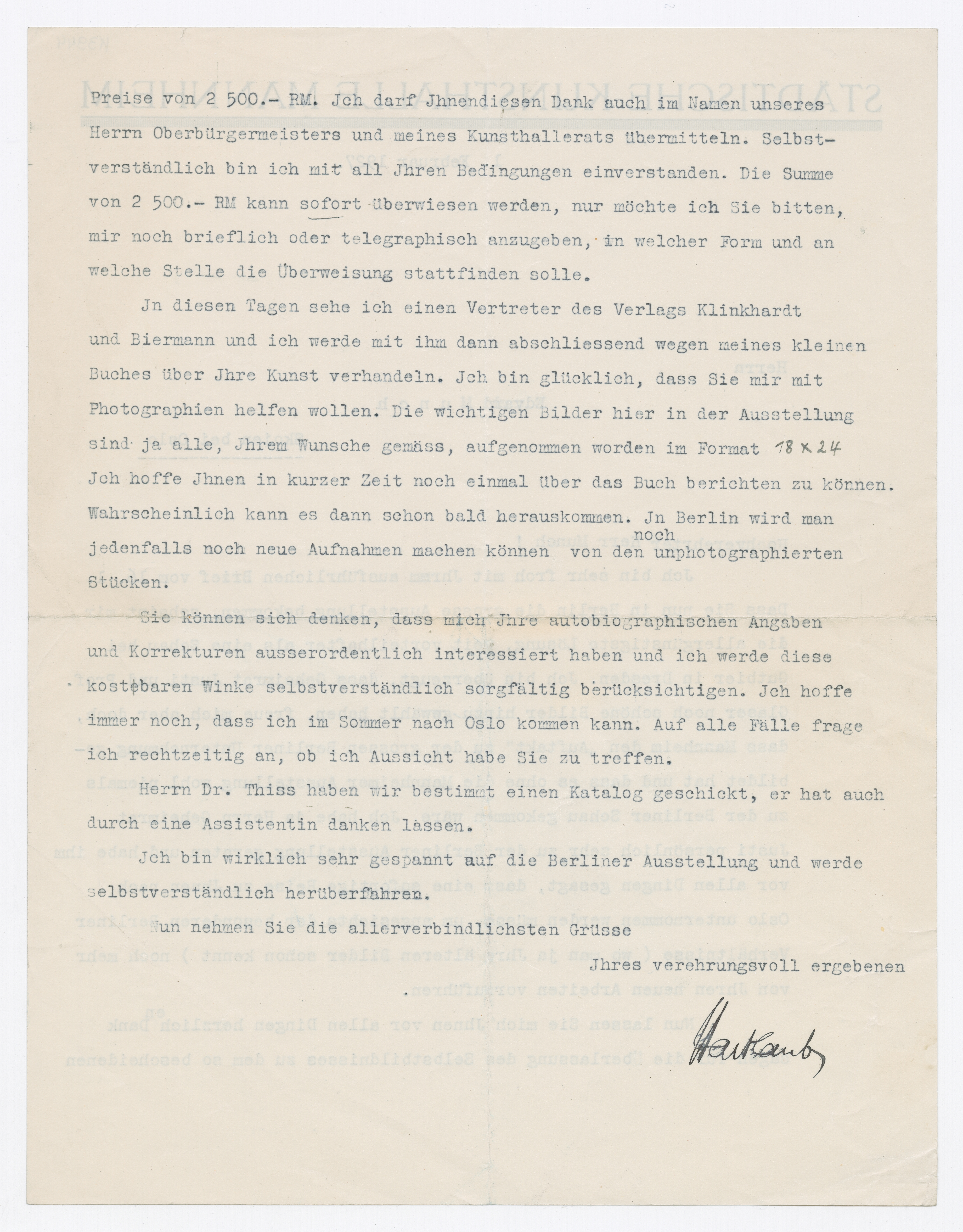 Brev fra Gustav Hartlaub, Stadtische Kunsthalle Mannheim.
