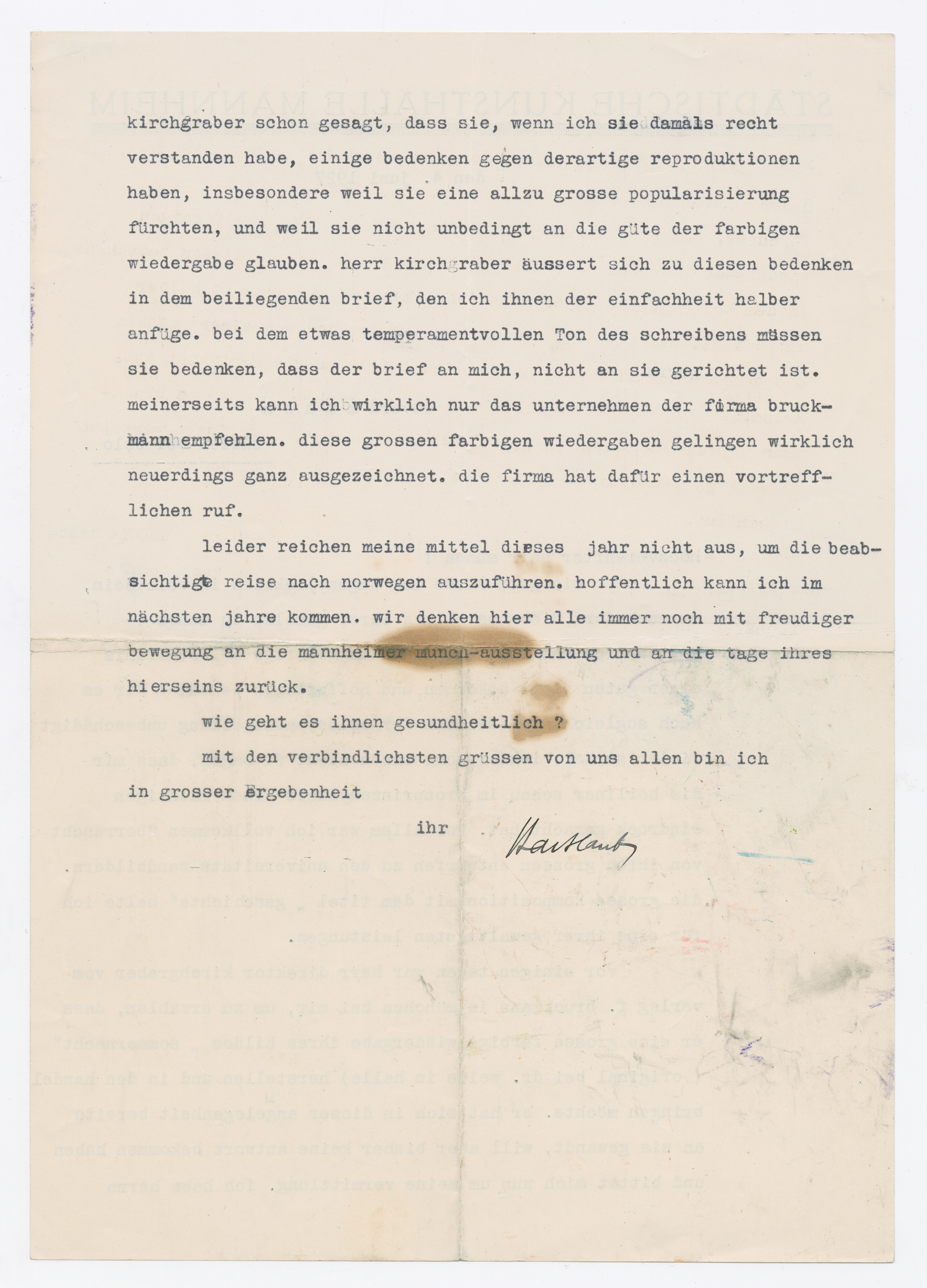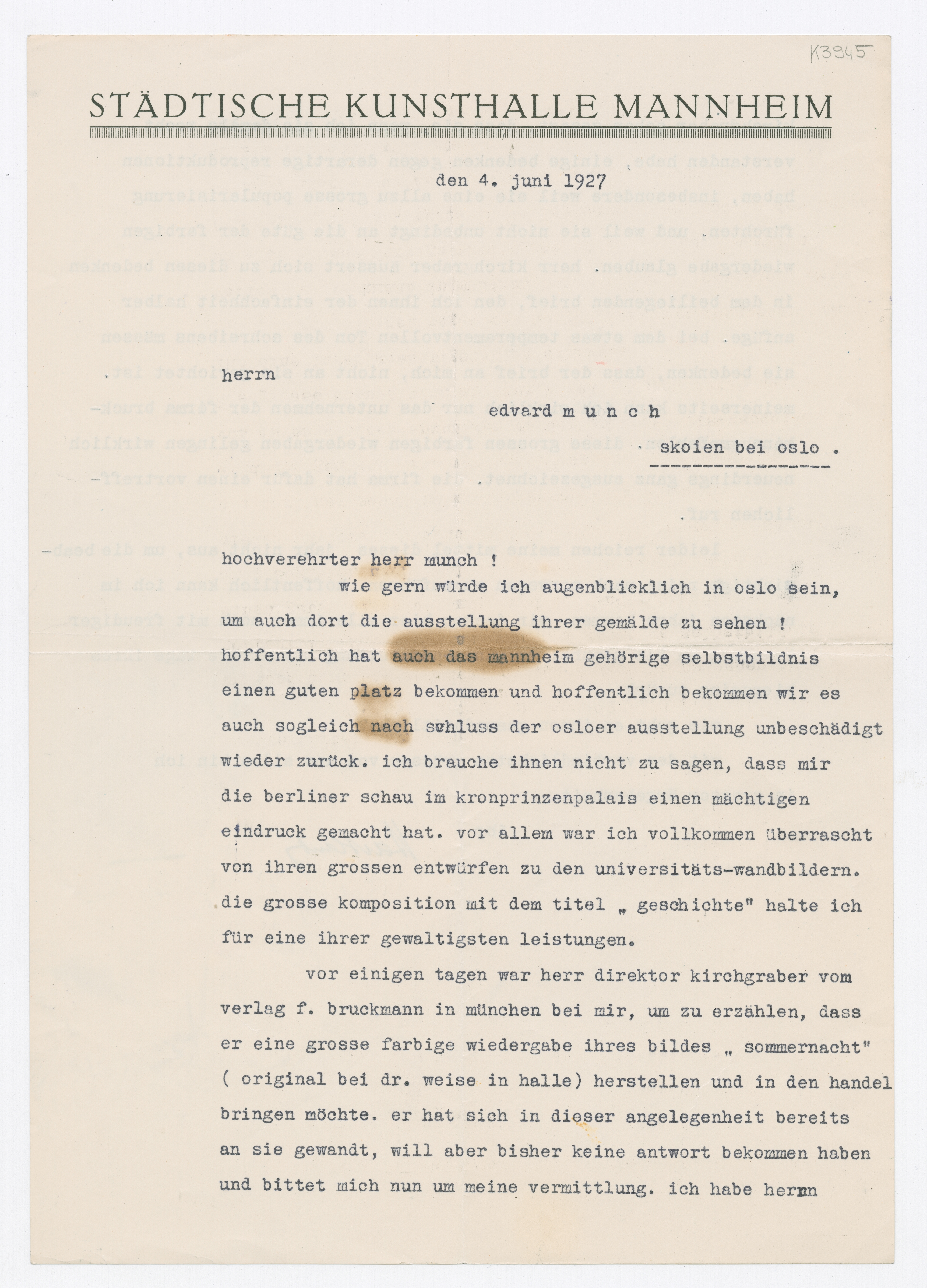 MM K 3945, Munchmuseet. Datert 04.06.1927. Brev fra Gustav Hartlaub, Stadtische Kunsthalle Mannheim.