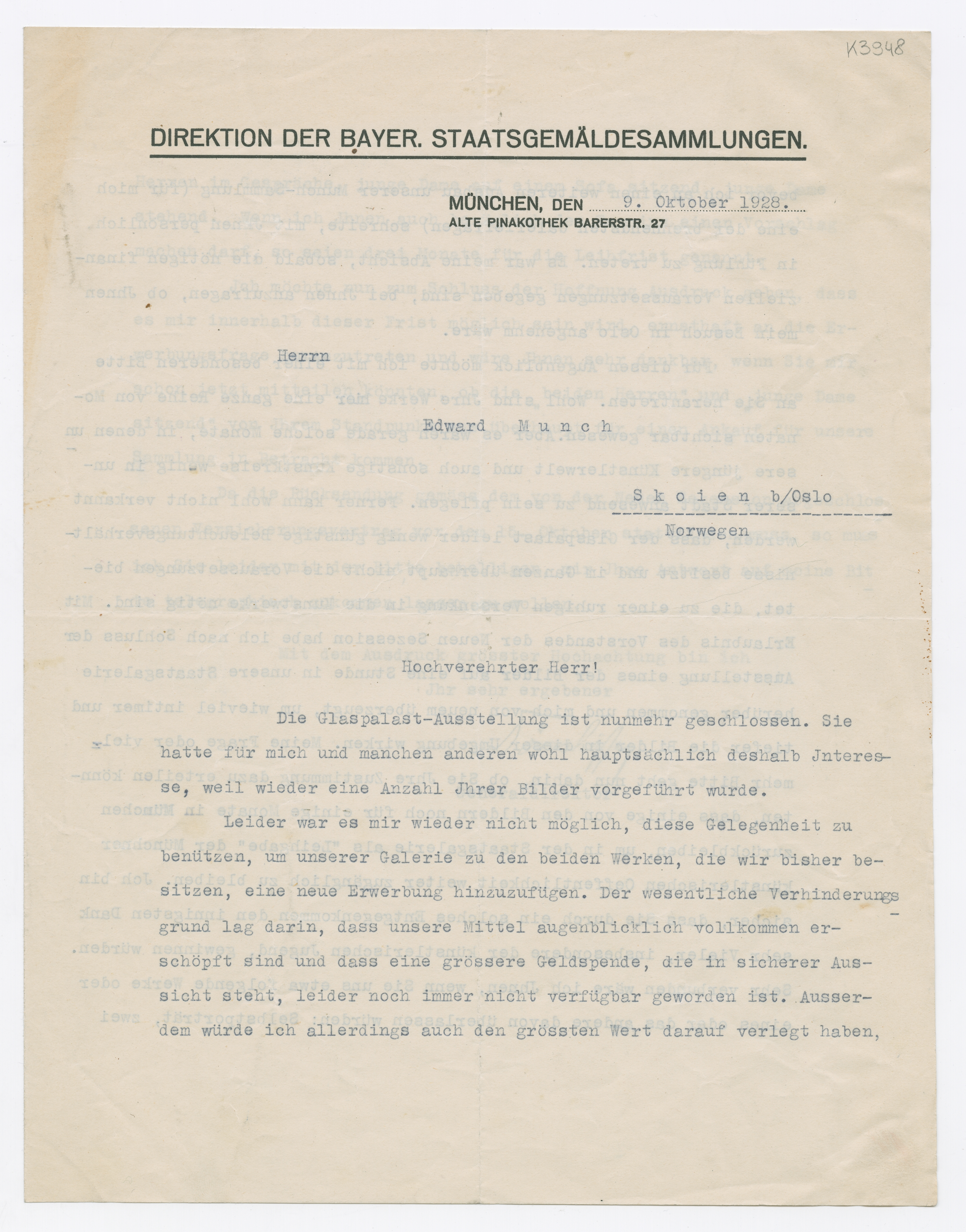 MM K 3948, Munchmuseet. Datert 09.10.1928. Brev fra Friedrich Dörnhöffer, Bayerischen Staatsgemäldesammlungen.