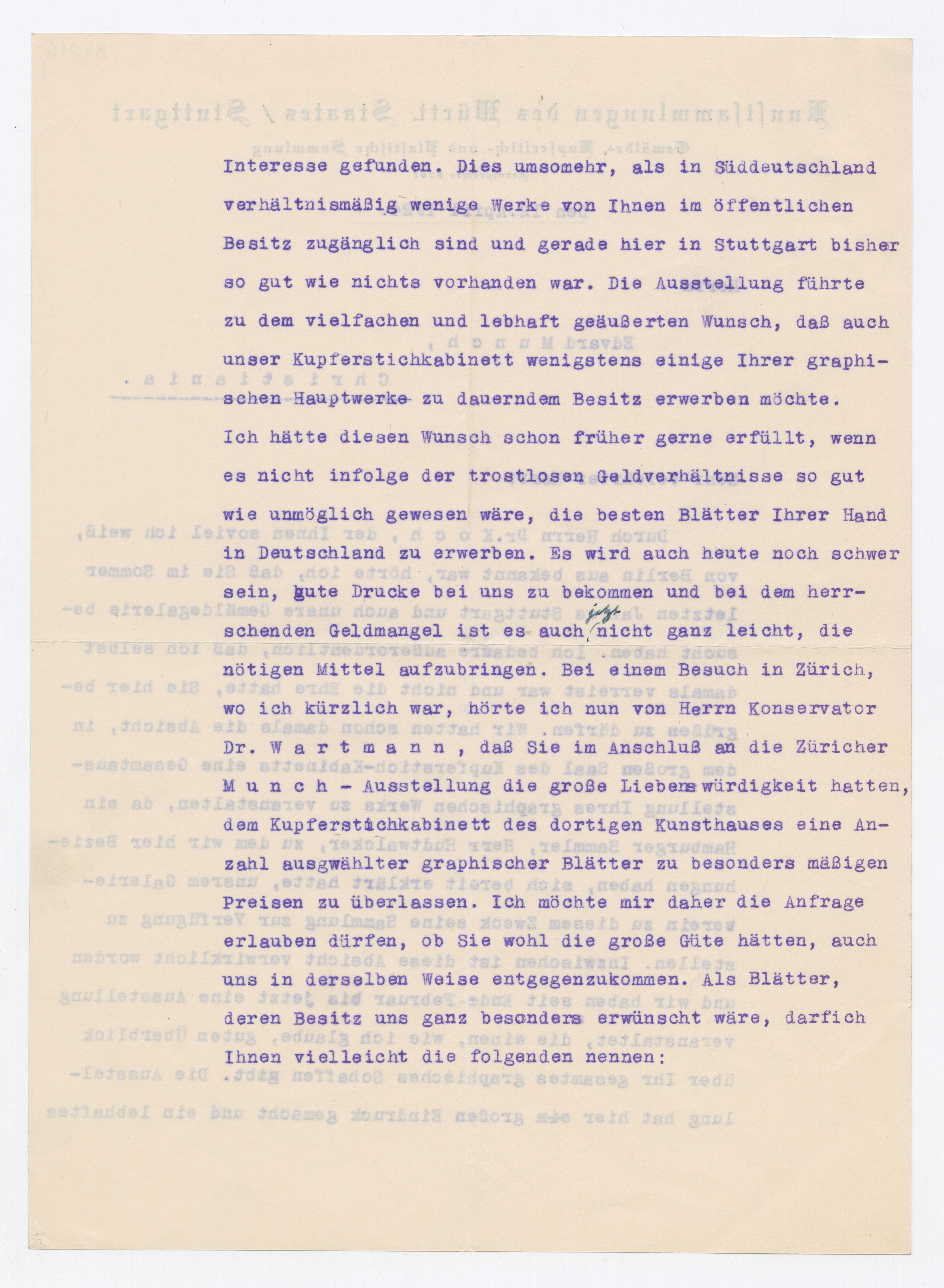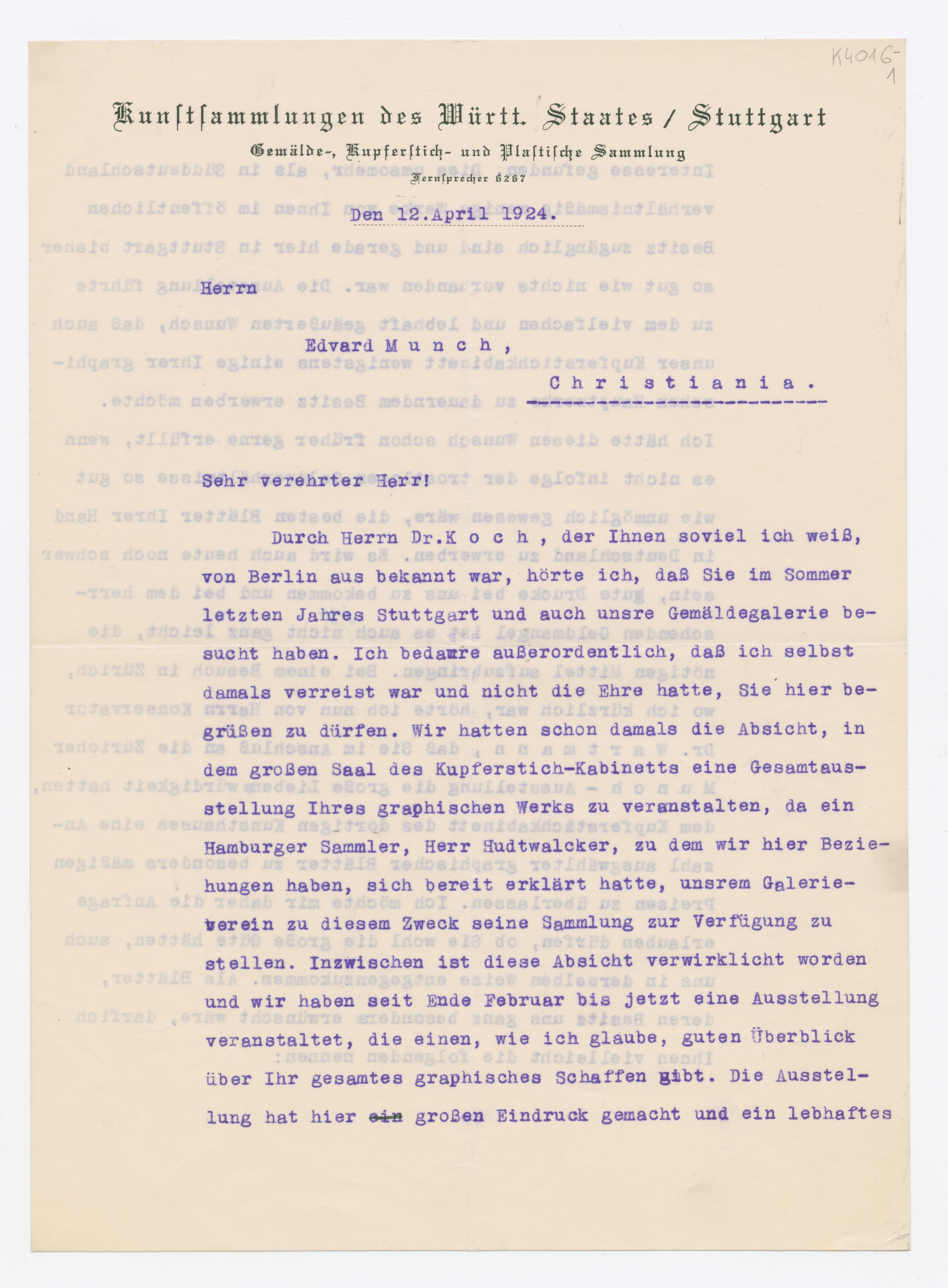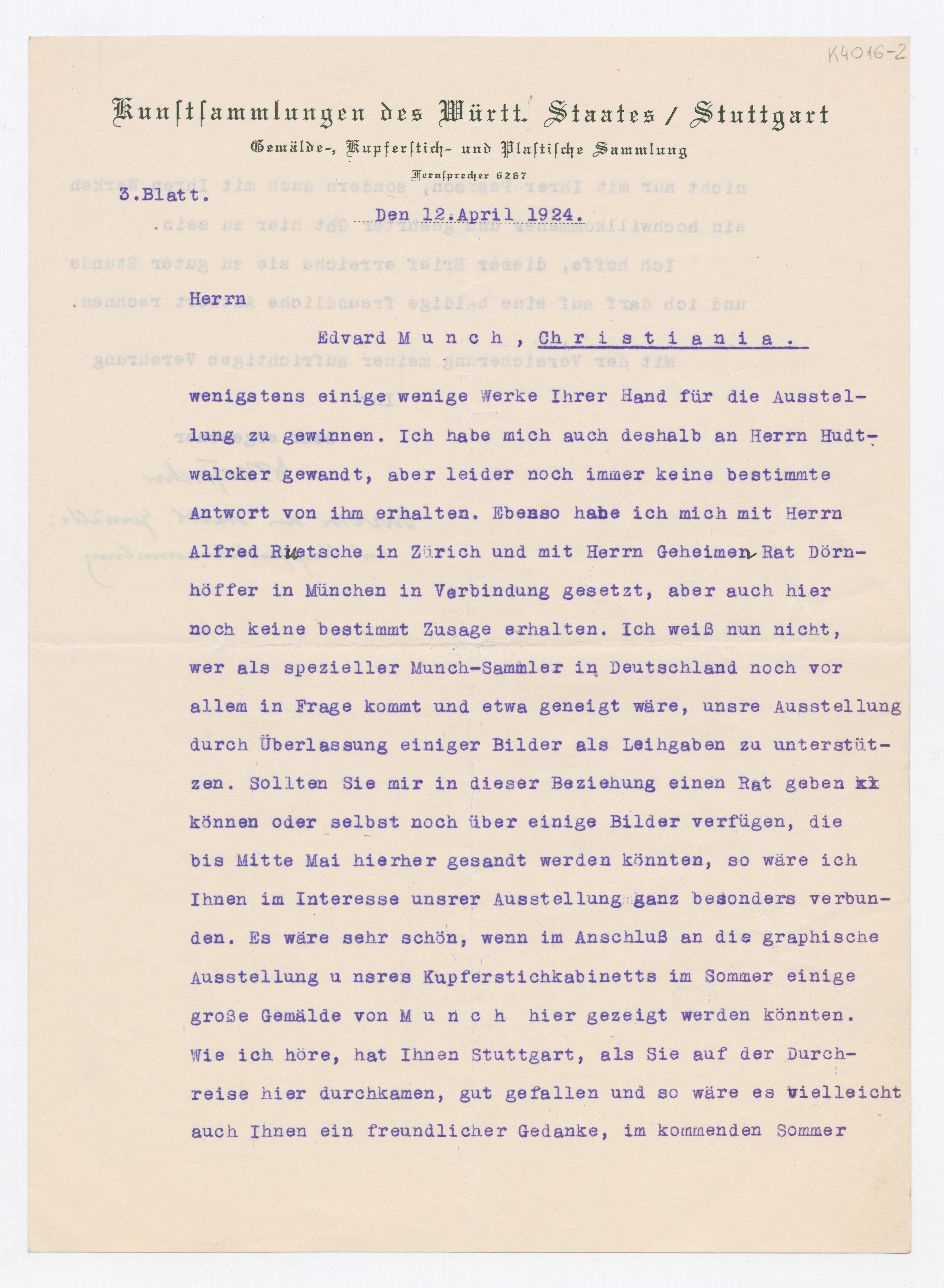 MM K 4016, Munchmuseet. Datert 12.04.1925. Brev fra Otto Fischer, Kunstsammlungen Des Württ. Staates.