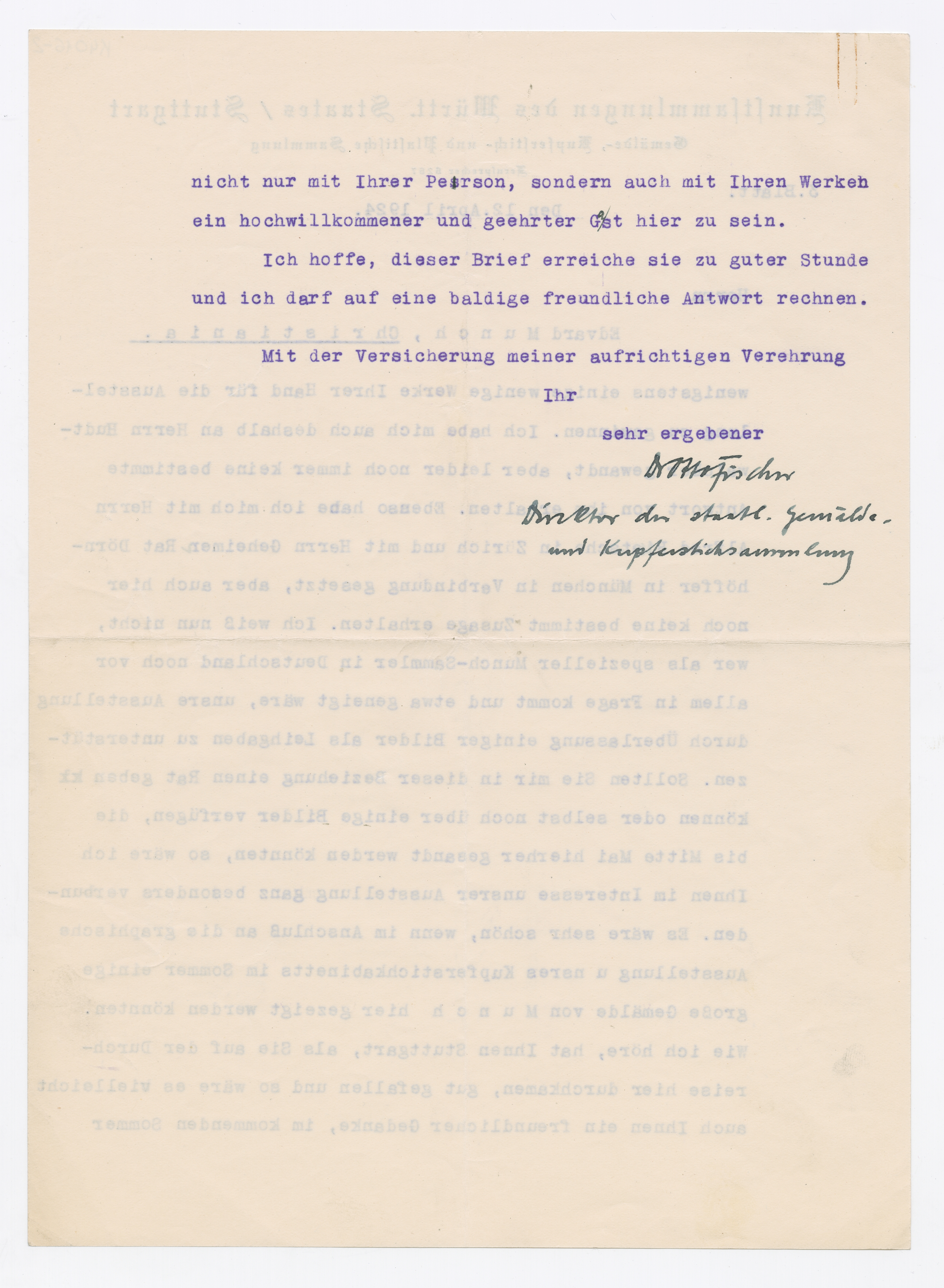 Brev fra Otto Fischer, Kunstsammlungen Des Württ. Staates.