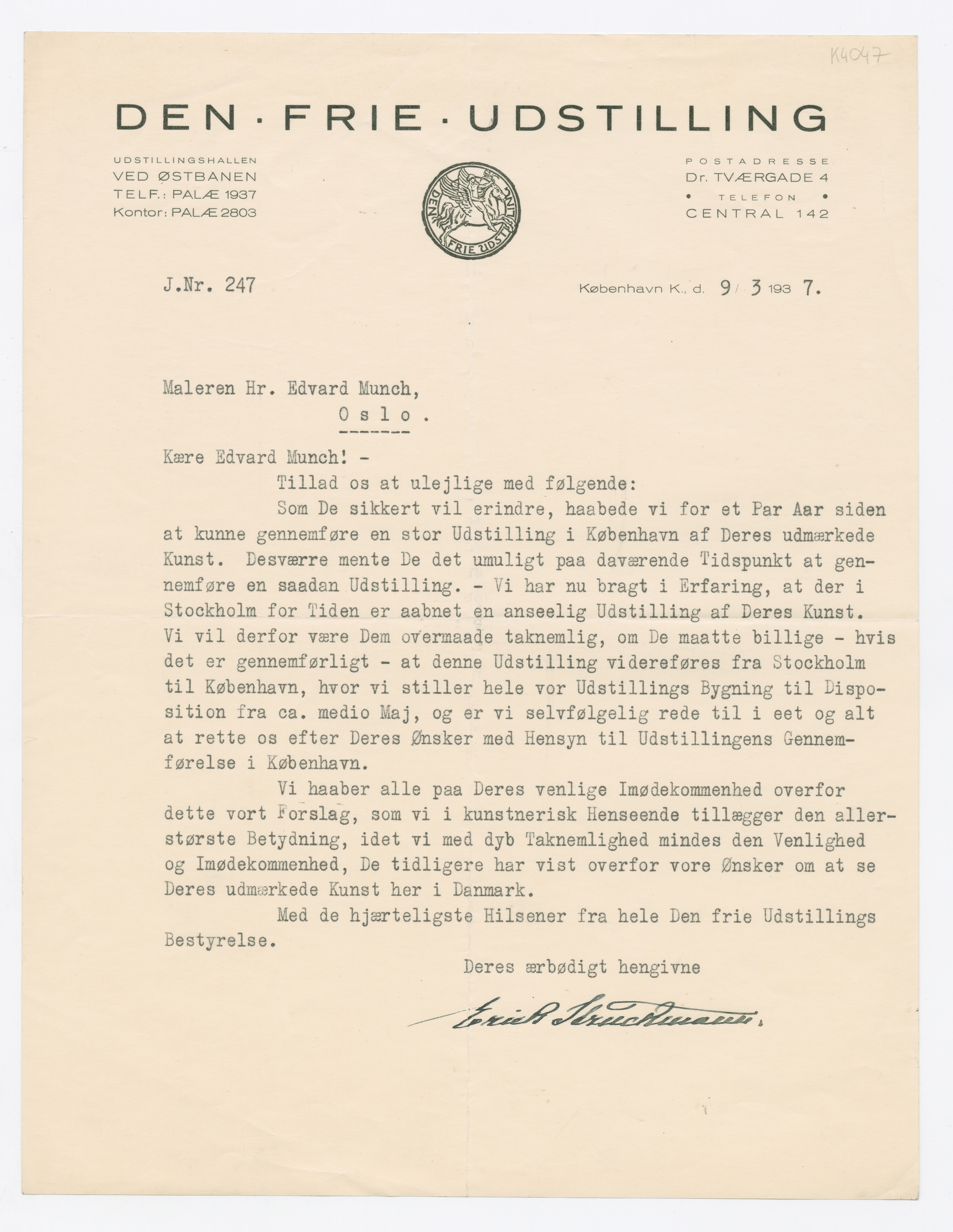 MM K 4047, Munchmuseet. Datert 09.03.1937. Brev fra Den Frie Udstilling.