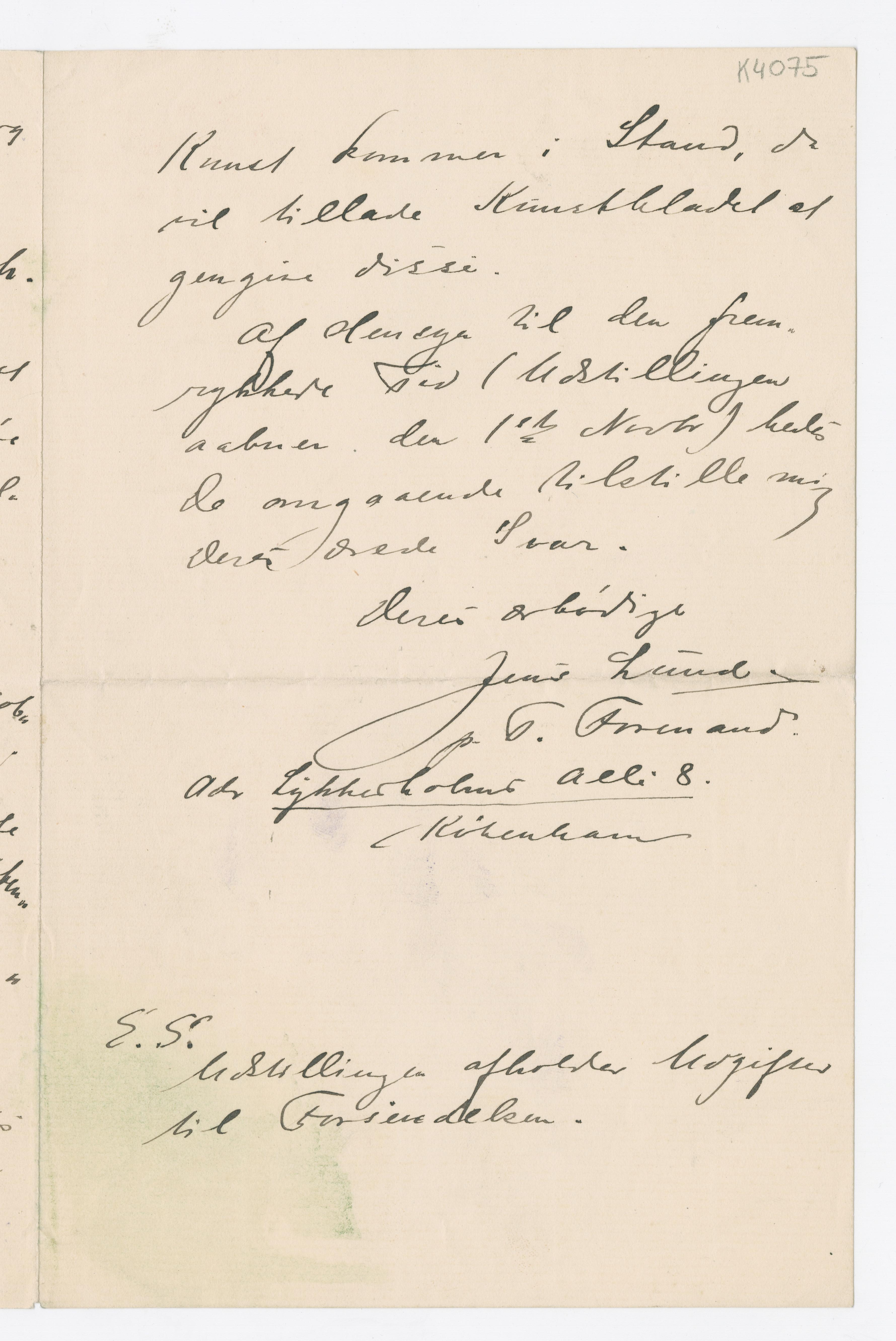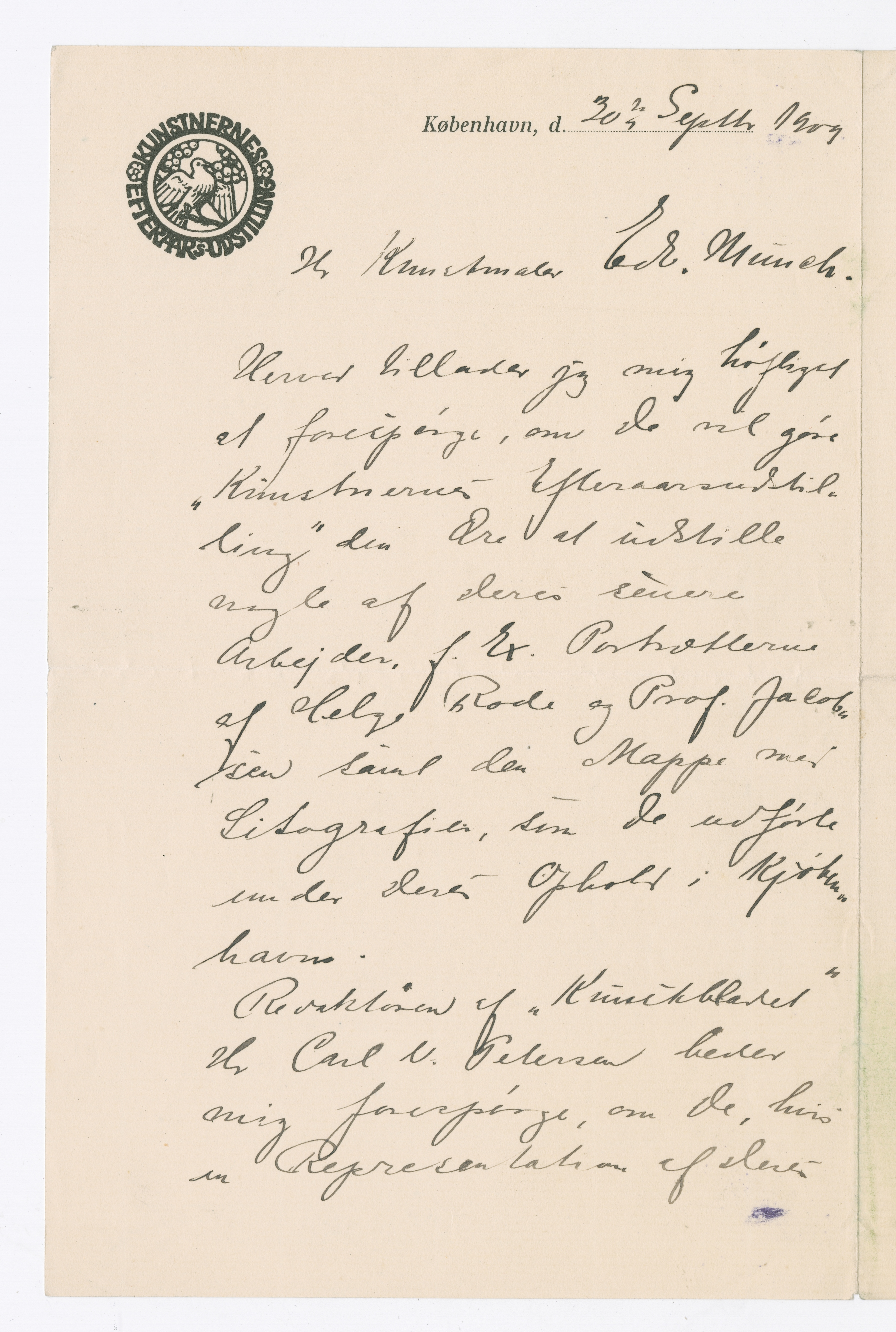 MM K 4075, Munchmuseet. Datert 30.09.1909. Brev fra Jens Lund, Kunstnernes Efteraarsudstilling.