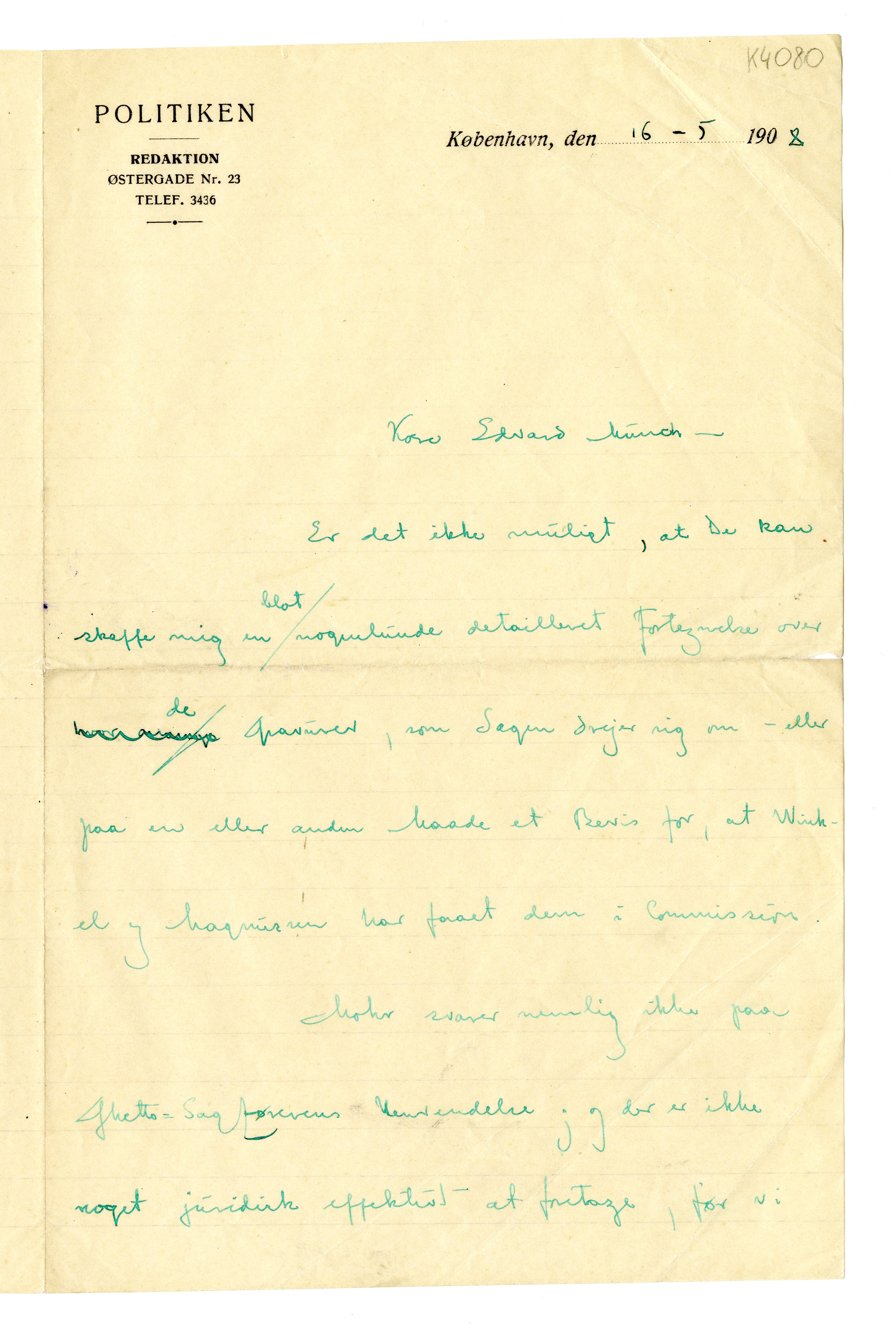 MM K 4080, Munchmuseet. Datert 16.05.1908. Brev fra Sten Drewsen.