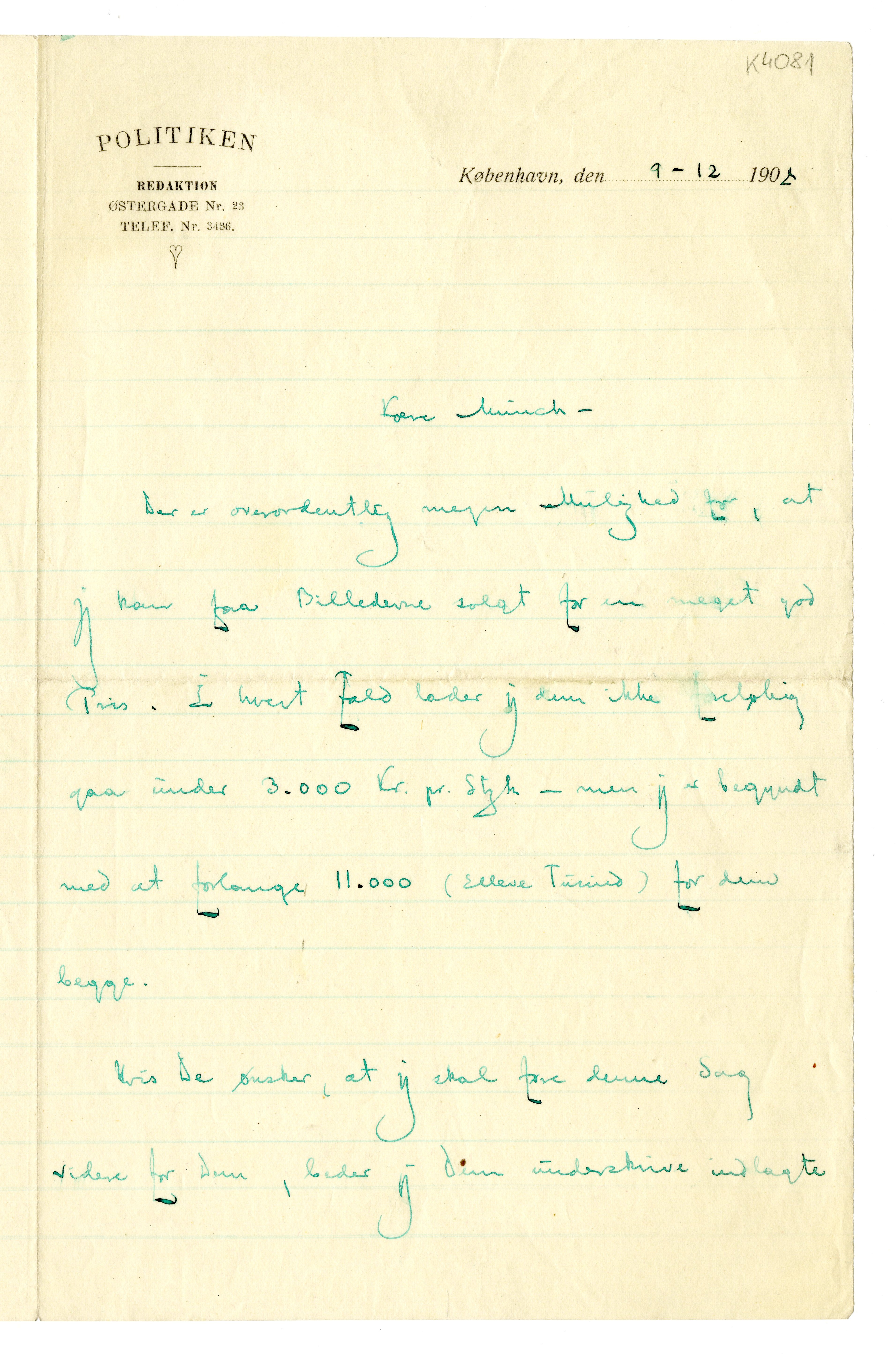 MM K 4081, Munchmuseet. Datert 09.12.1908. Brev fra Sten Drewsen.