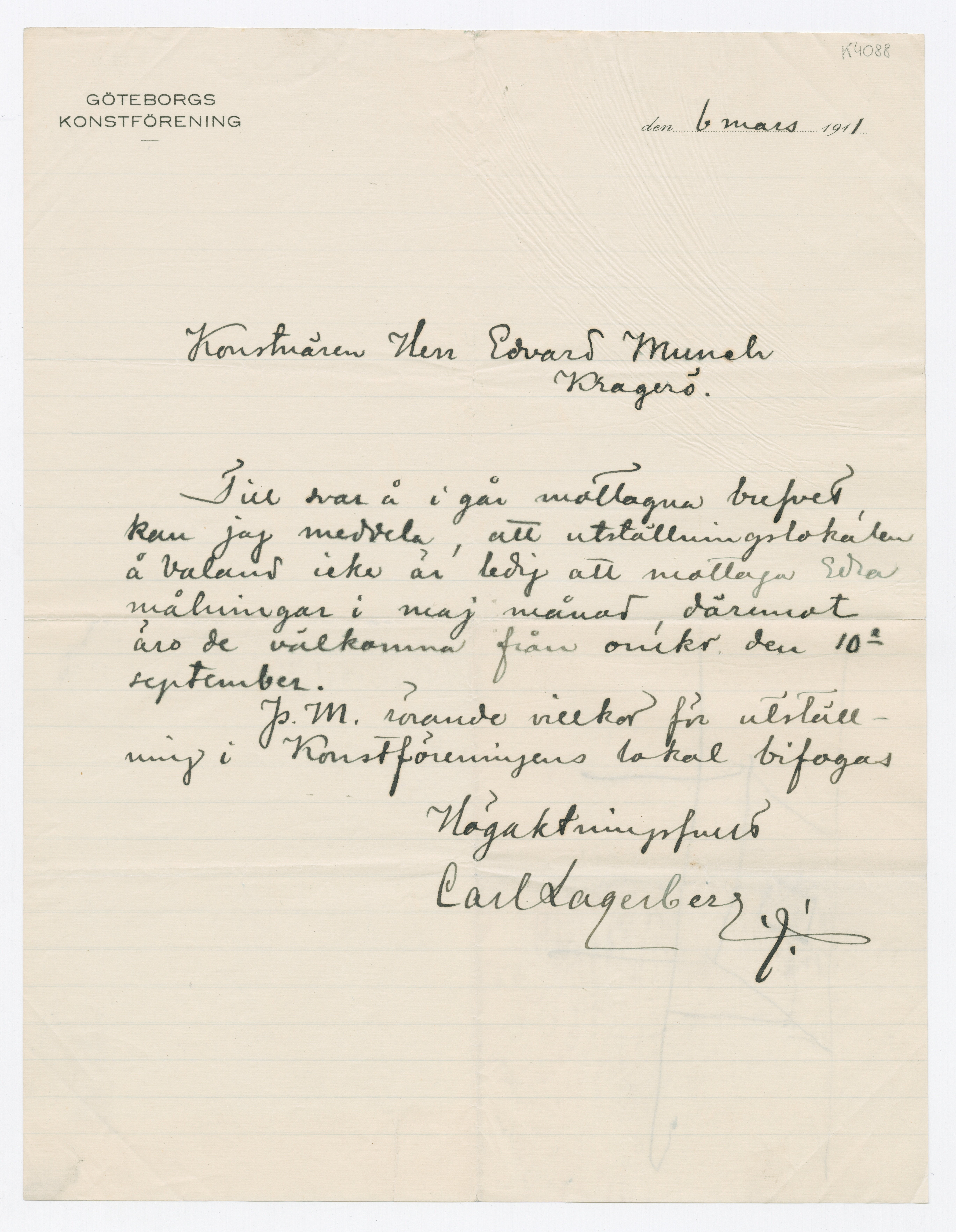 MM K 4088, Munchmuseet. Datert 06.03.1911. Brev fra Carl Lagerberg, Göteborgs Konstförening.