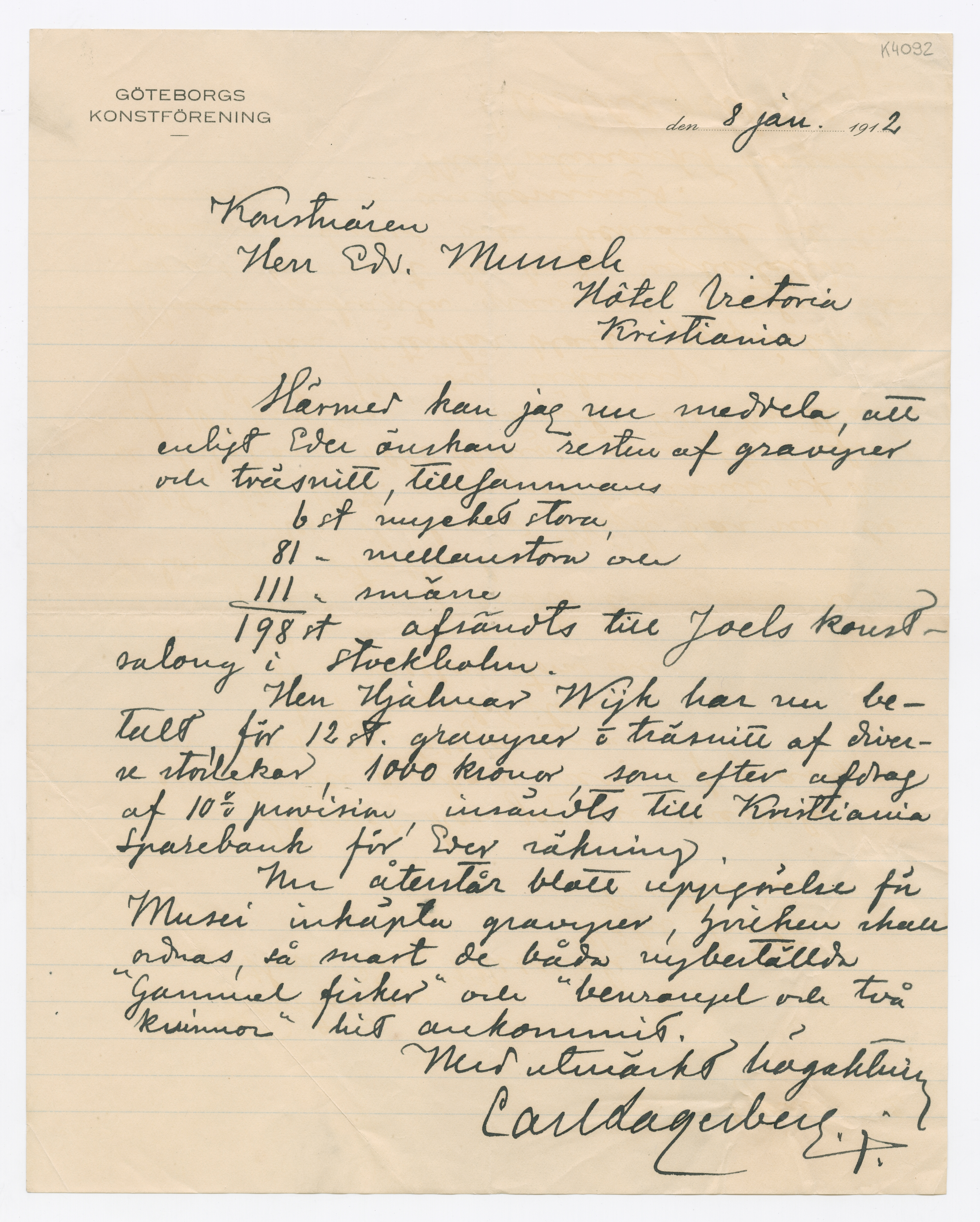 MM K 4092, Munchmuseet. Datert 08.01.1912. Brev fra Carl Lagerberg, Göteborgs Konstförening.