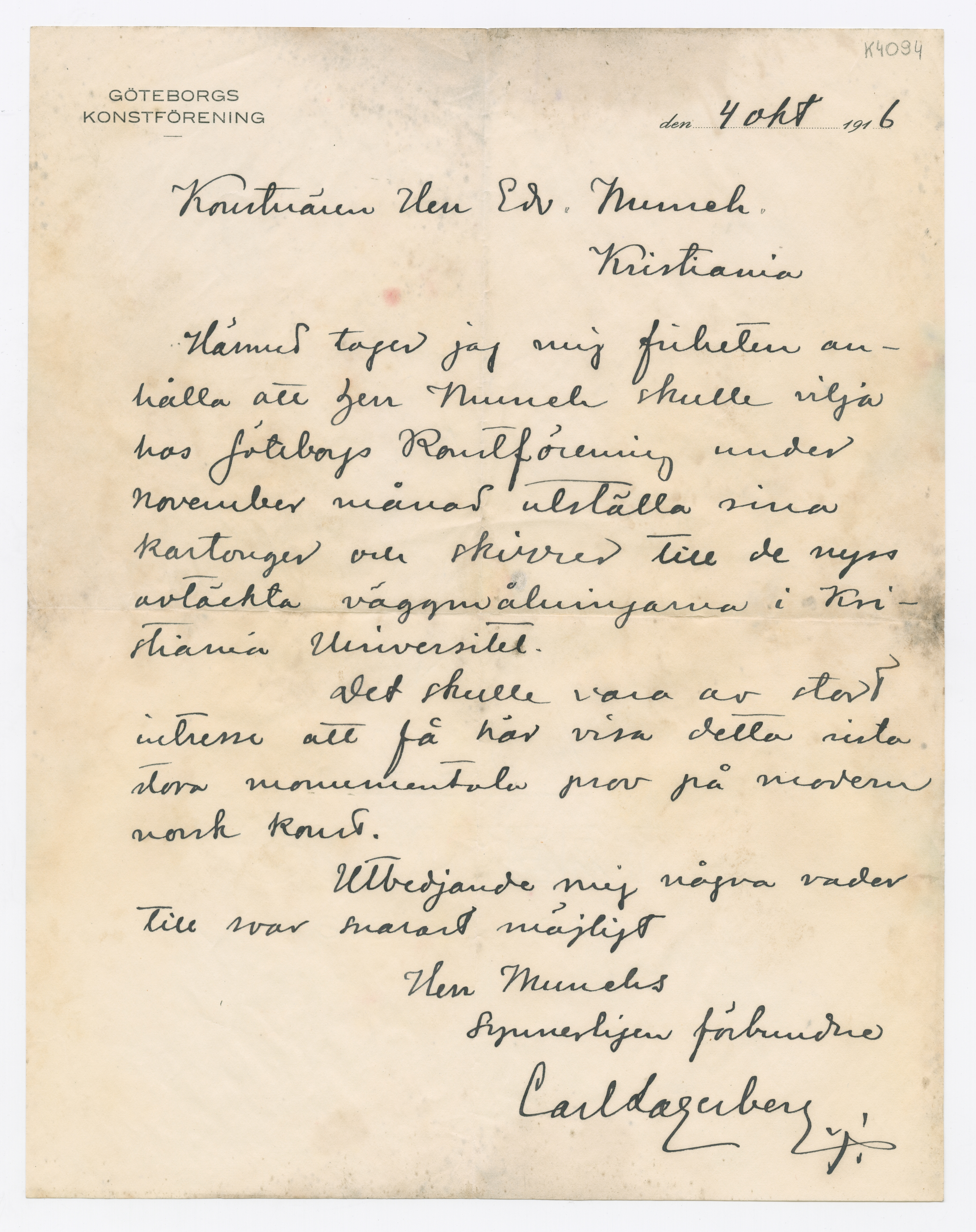 MM K 4094, Munchmuseet. Datert 04.10.1916. Brev fra Carl Lagerberg, Göteborgs Konstförening.