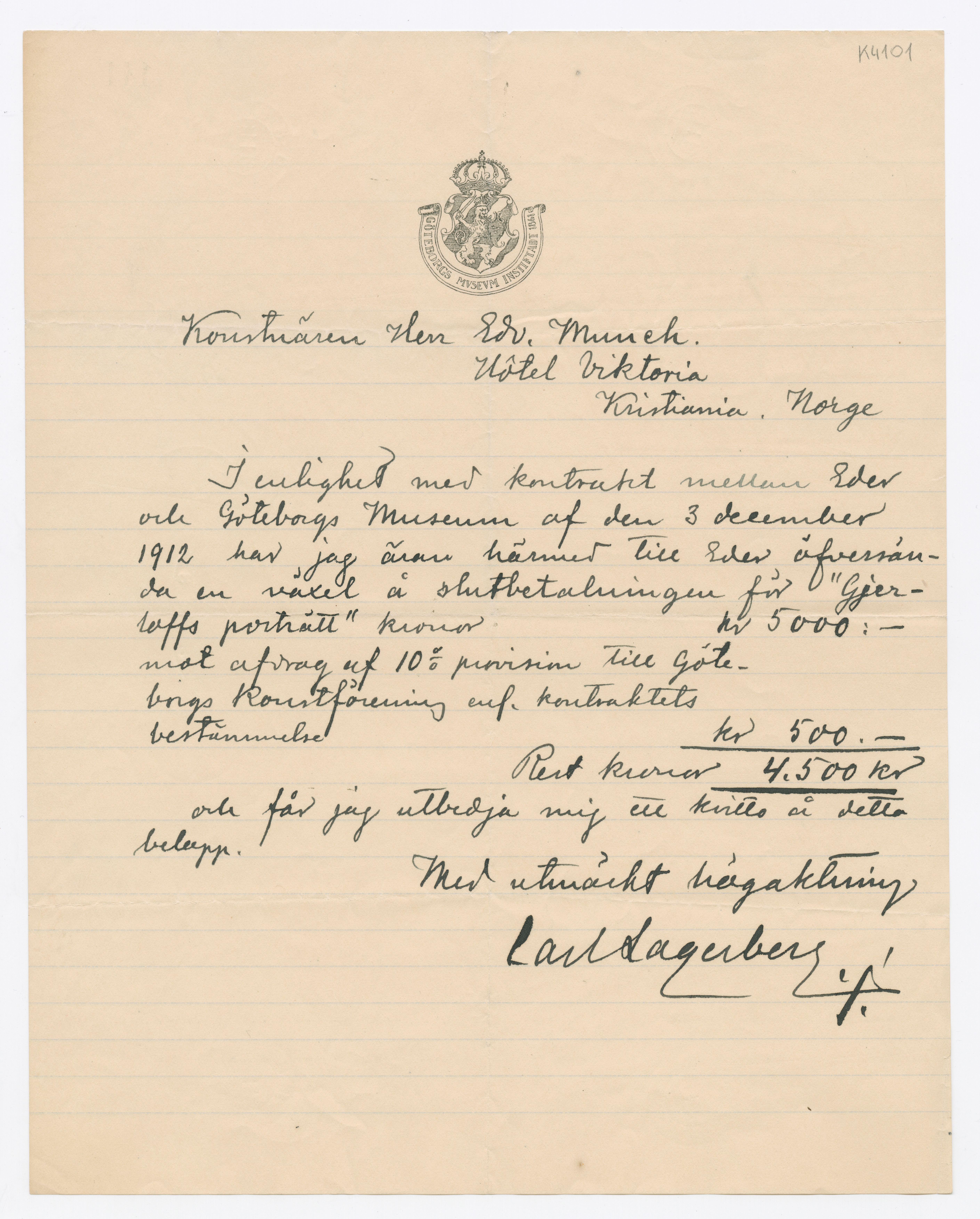 MM K 4101, Munchmuseet. Ikke datert. Brev fra Carl Lagerberg, Göteborgs Konstmuseum.