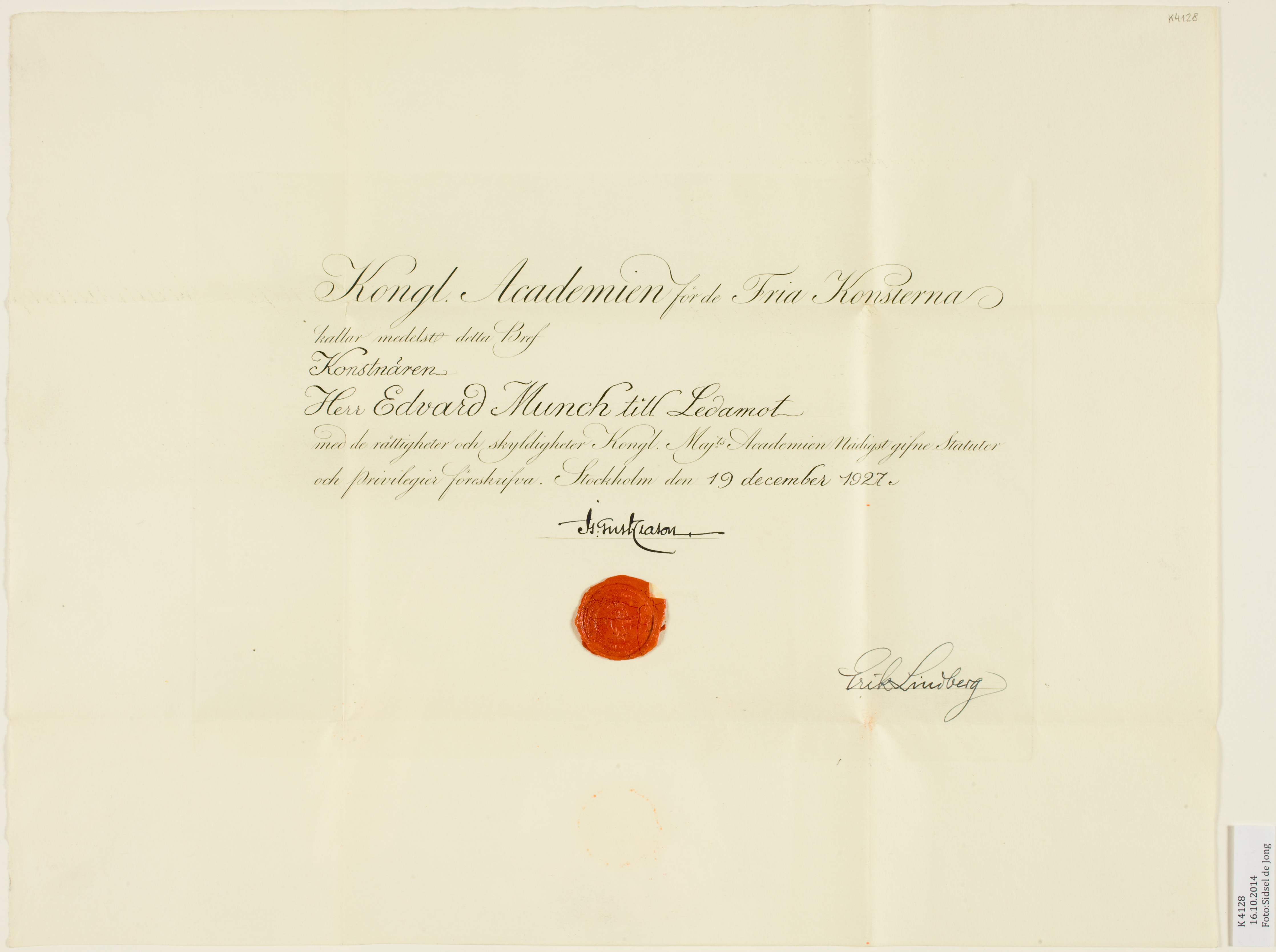 MM K 4128, Munchmuseet. Datert 19.12.1927. Brev fra Erik Lindberg, G. Gust. Clason, Kongl. Akademien för de Fria Konsterna.