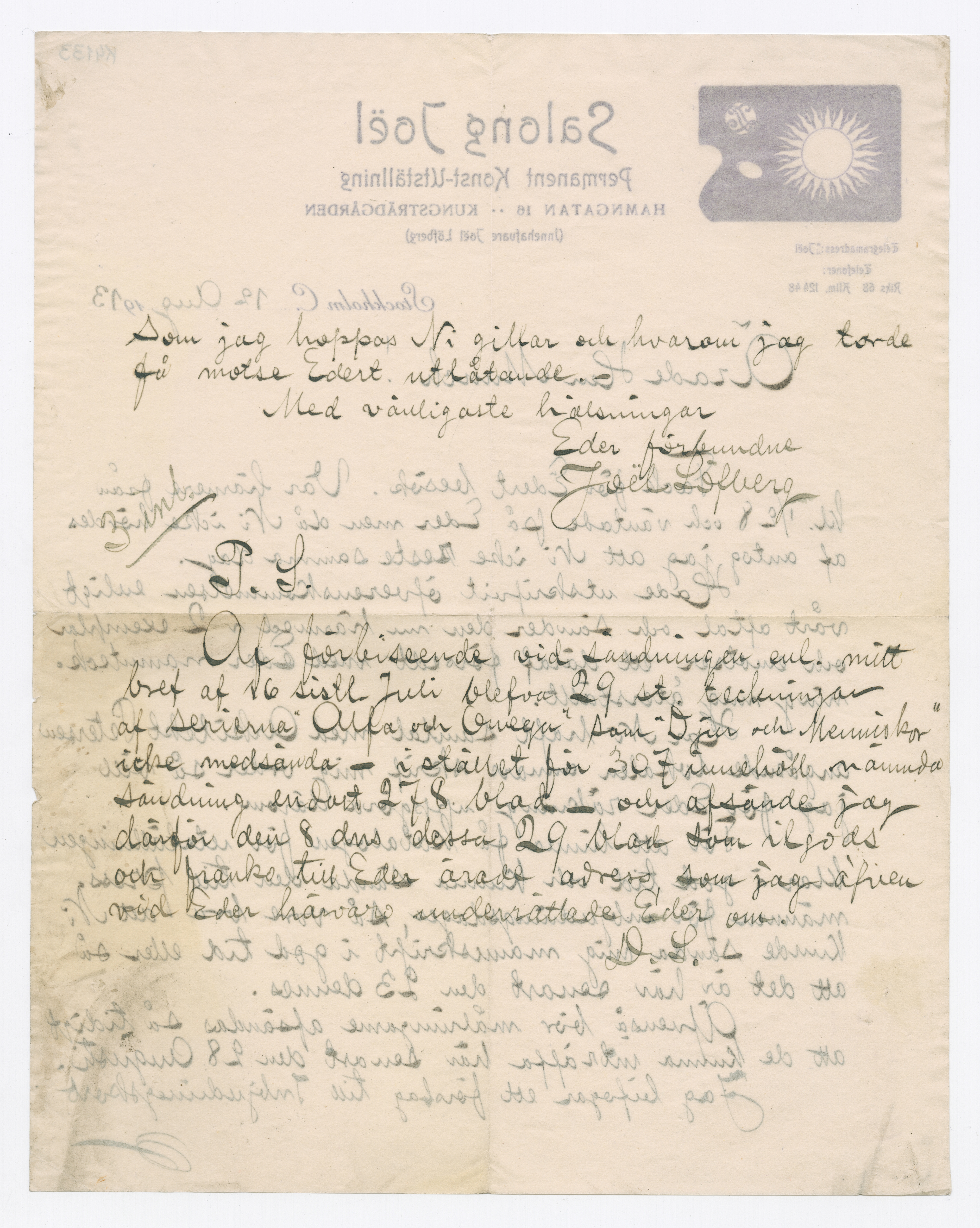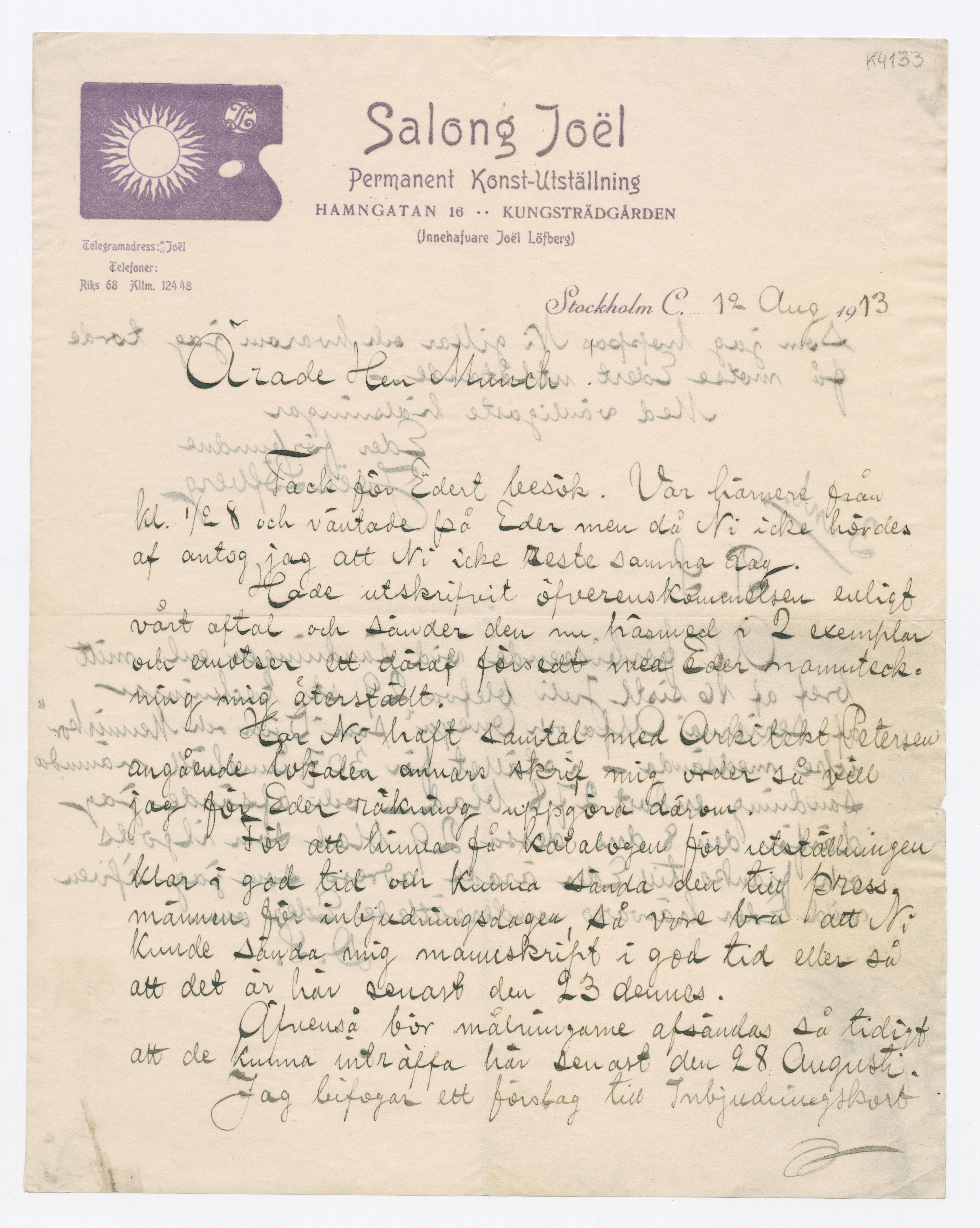 MM K 4133, Munchmuseet. Datert 12.08.1913. Brev fra Salong Joël Permanent Konst-Utställning, Joël Löfberg.