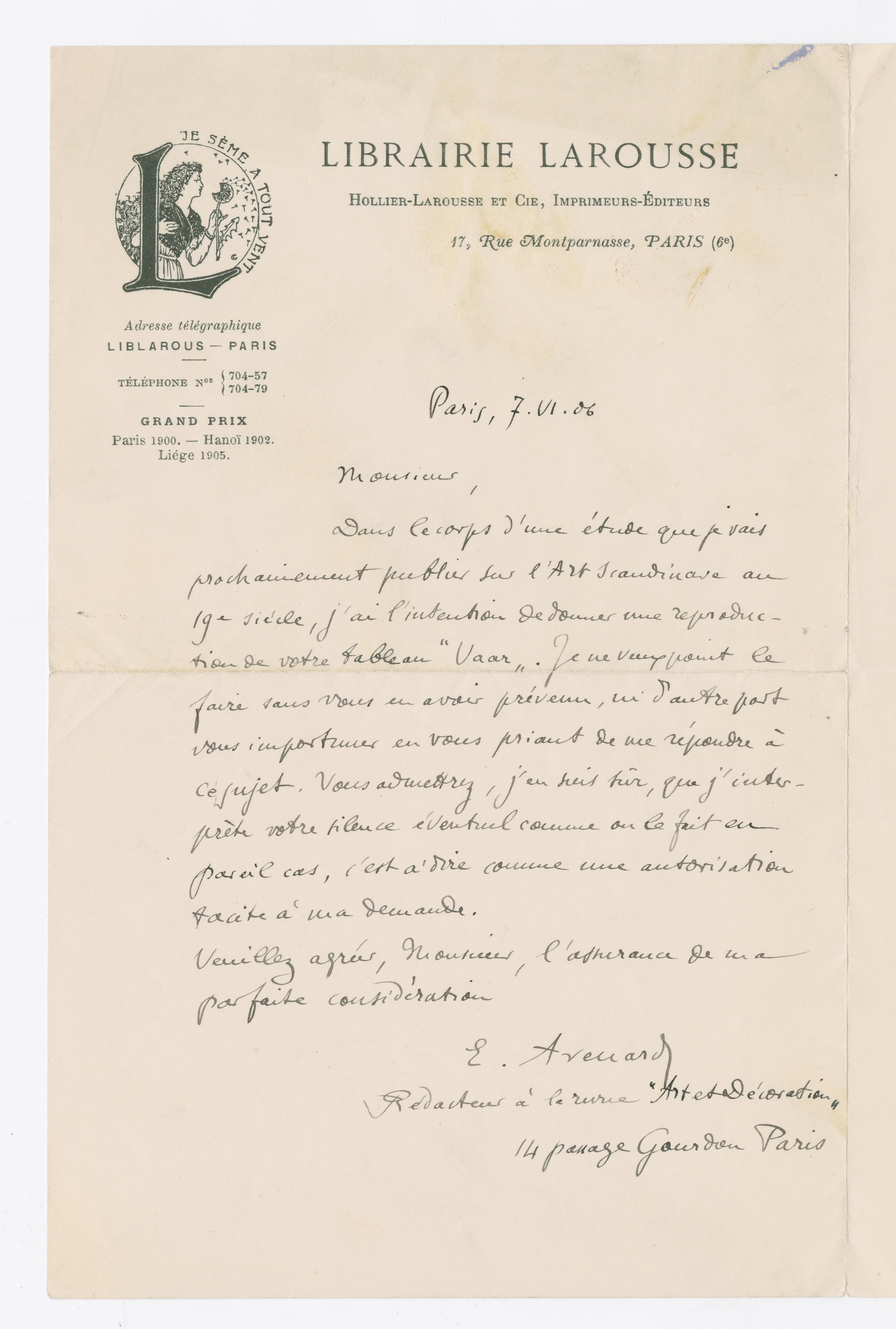 MM K 4174, Munchmuseet. Datert 07.06.1906. Brev fra Etienne Avenard, Art et Décoration.