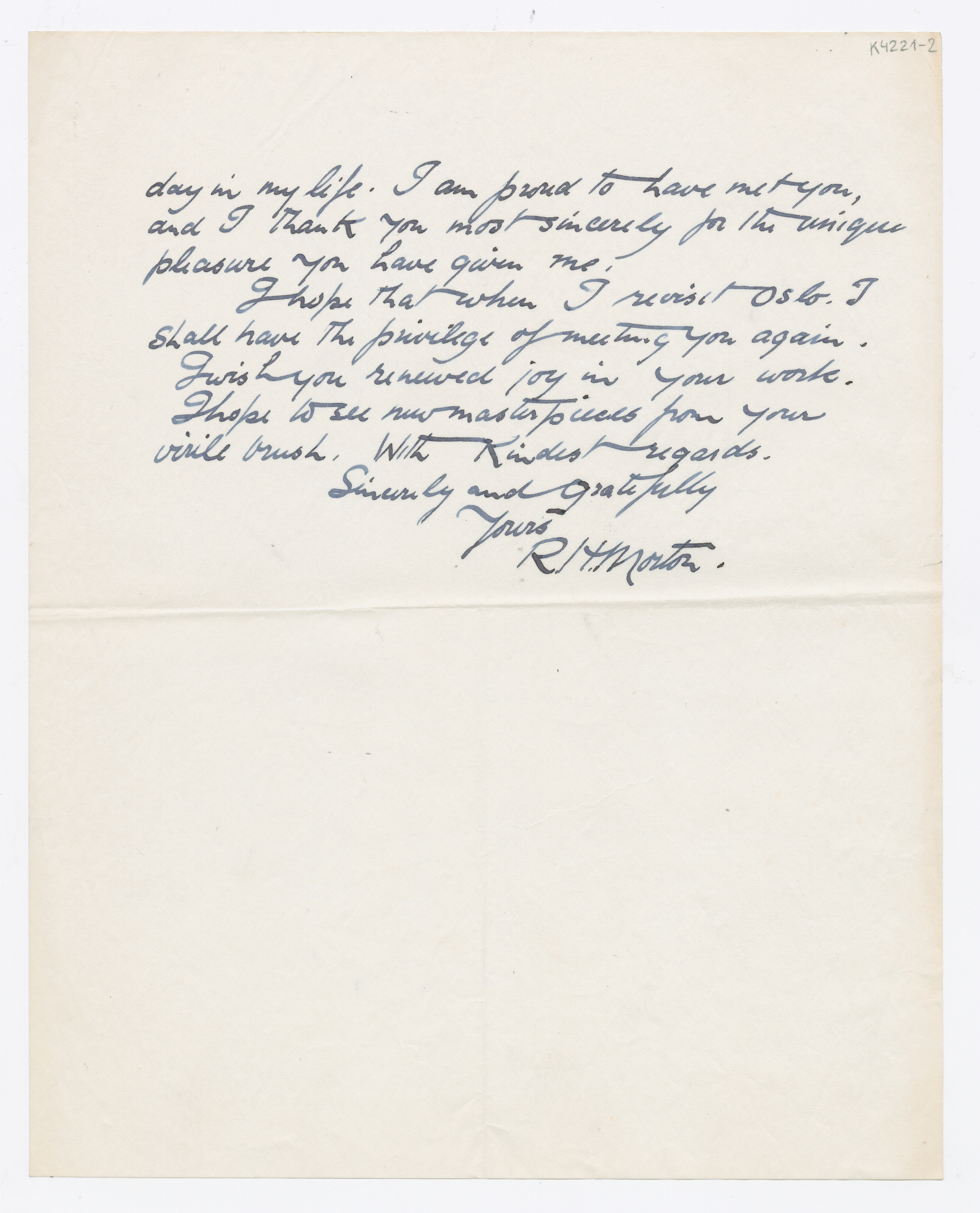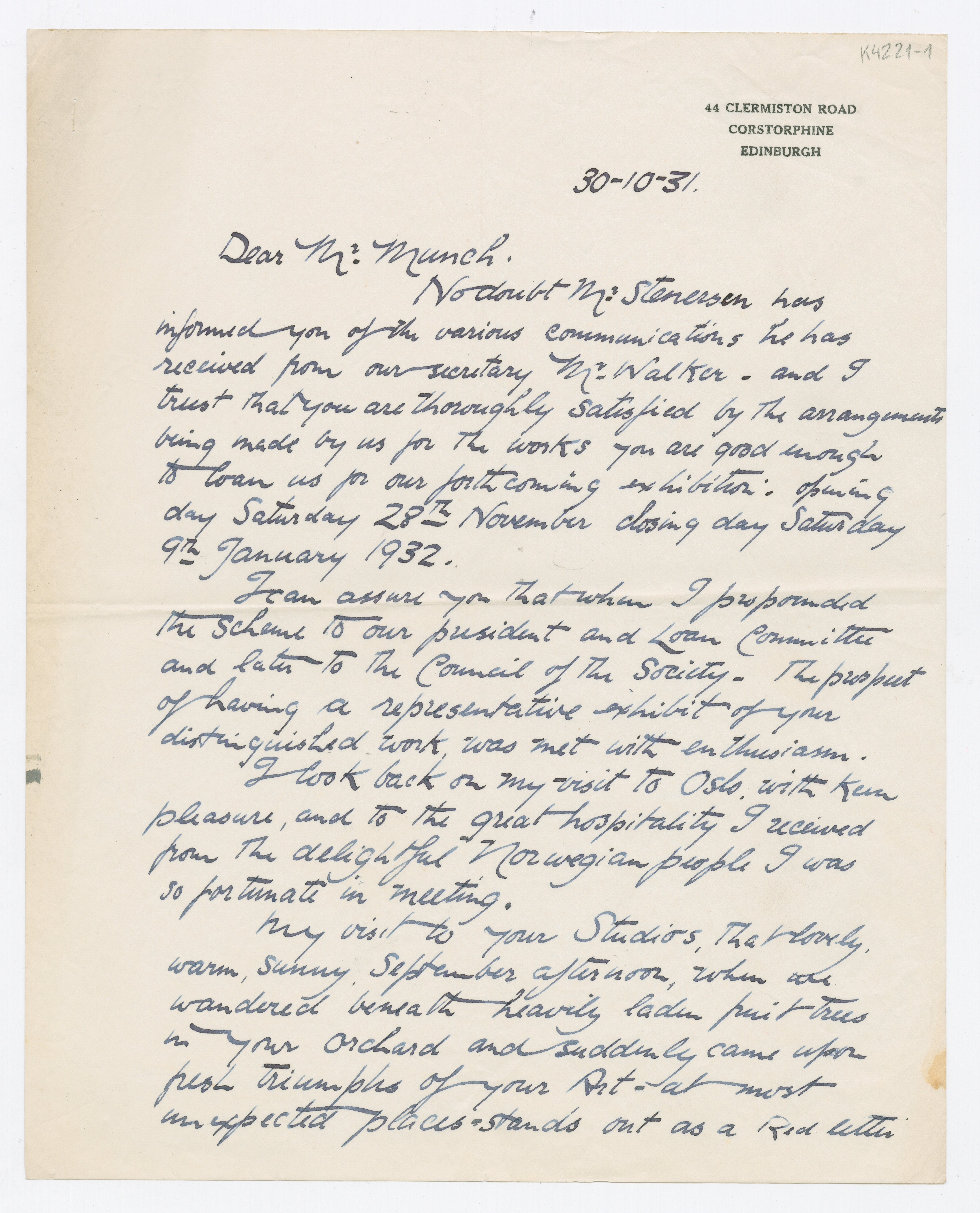 MM K 4221, Munchmuseet. Datert 30.10.1931. Brev fra R. H. Morton, The Society of Scottish Artists.
