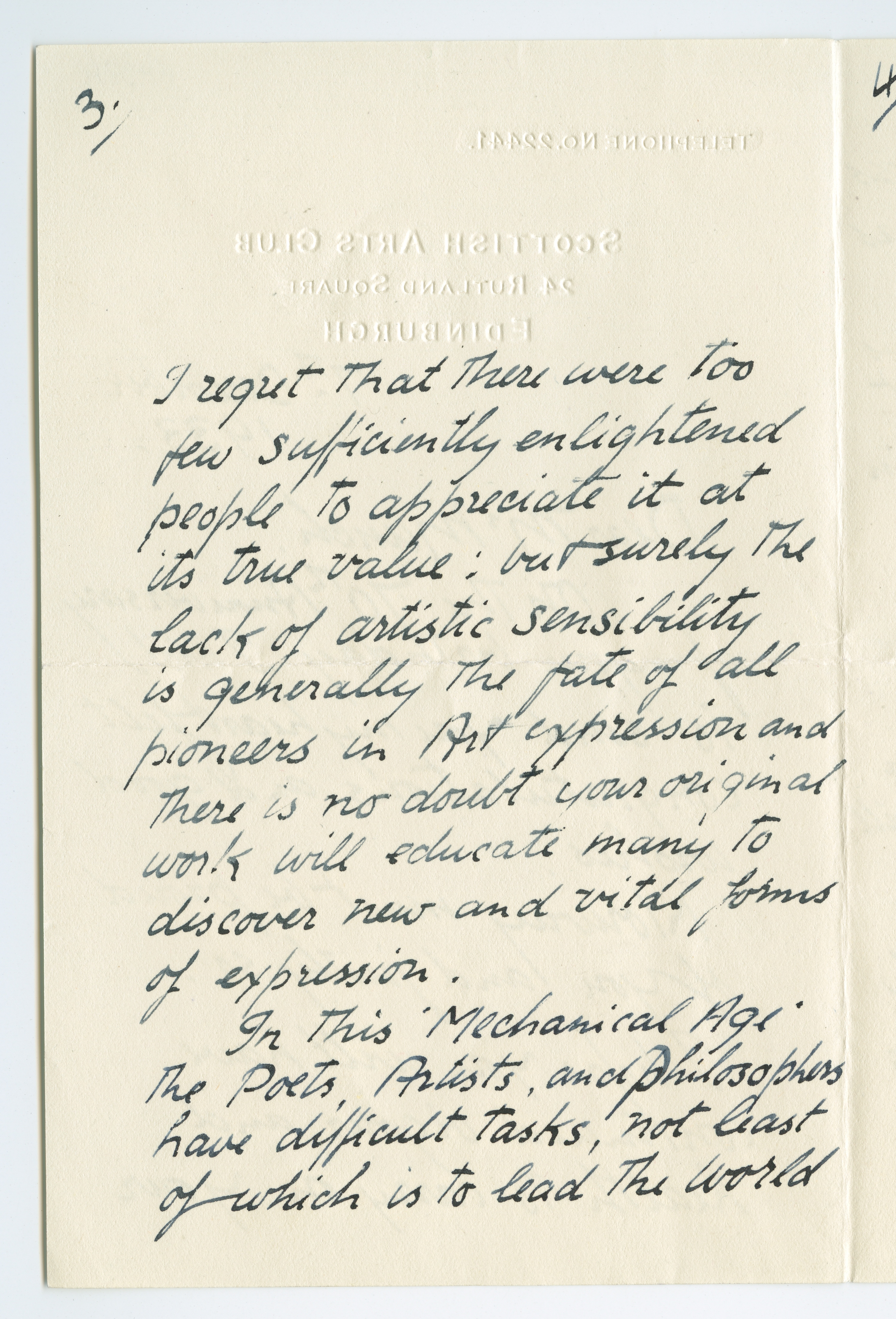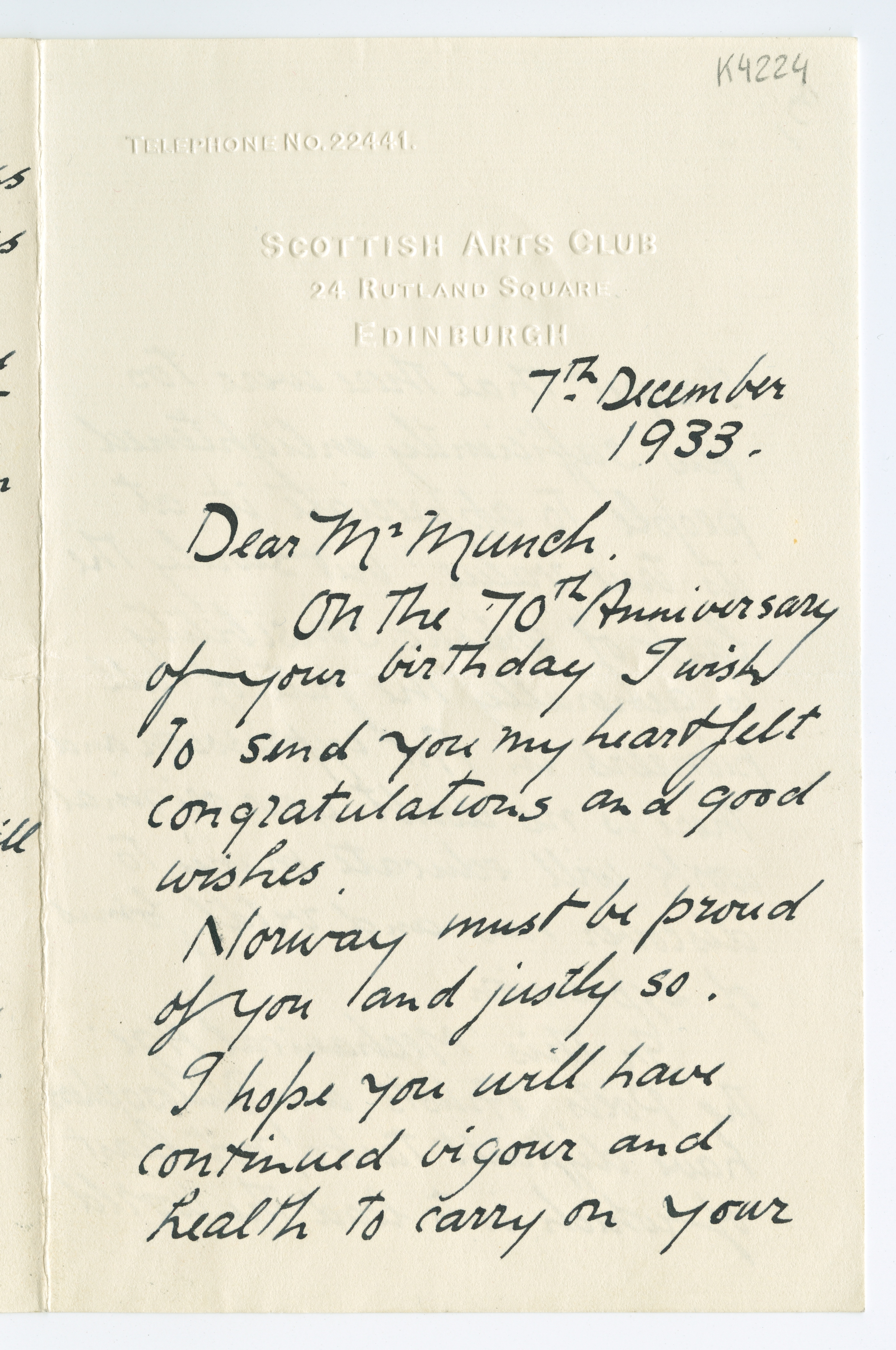 MM K 4224, Munchmuseet. Datert 07.12.1933. Brev fra R. H. Morton, The Society of Scottish Artists (Scottish arts Club).
