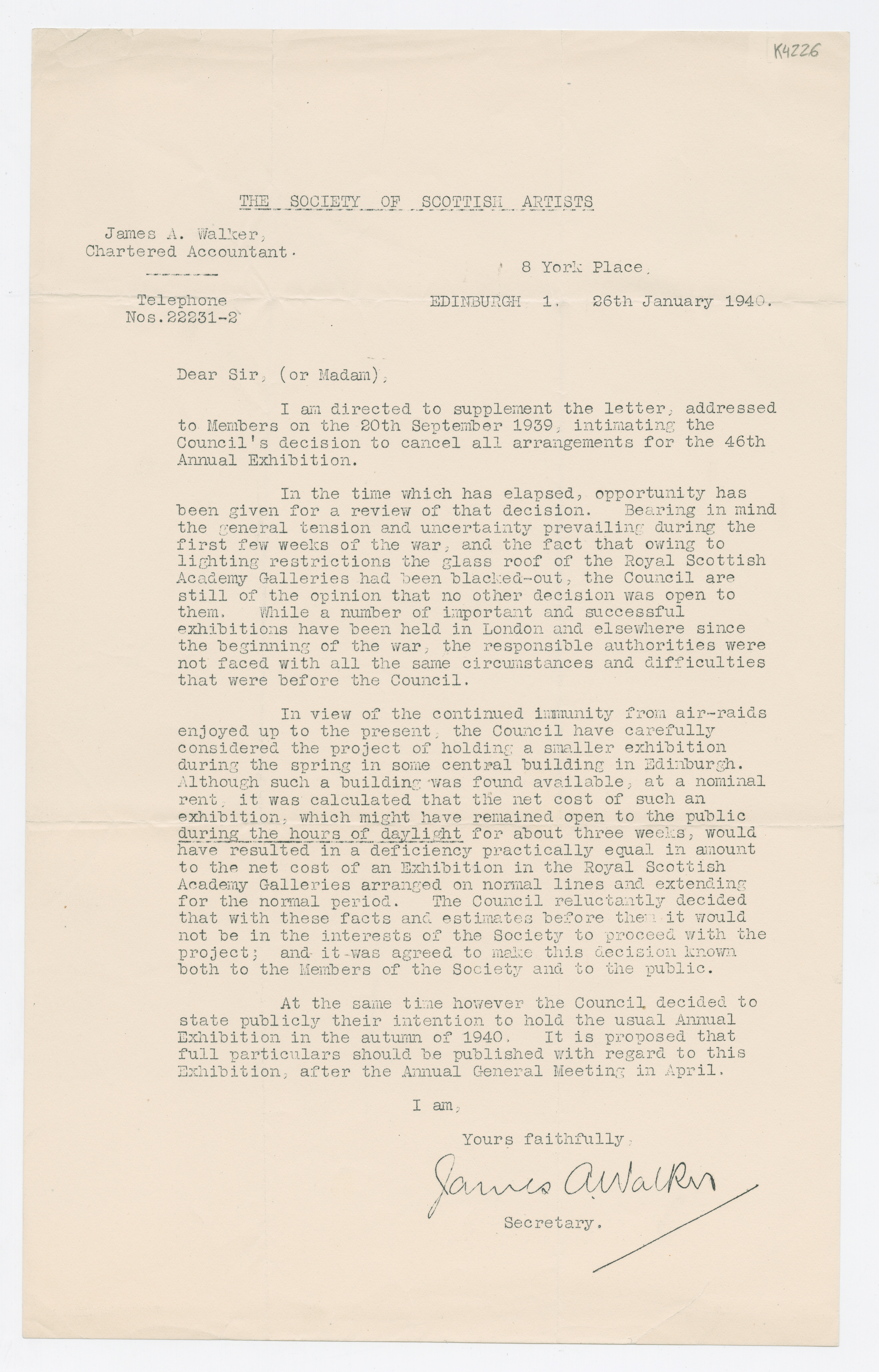 MM K 4226, Munchmuseet. Datert 26.01.1940. Brev fra The Society of Scottish Artists.