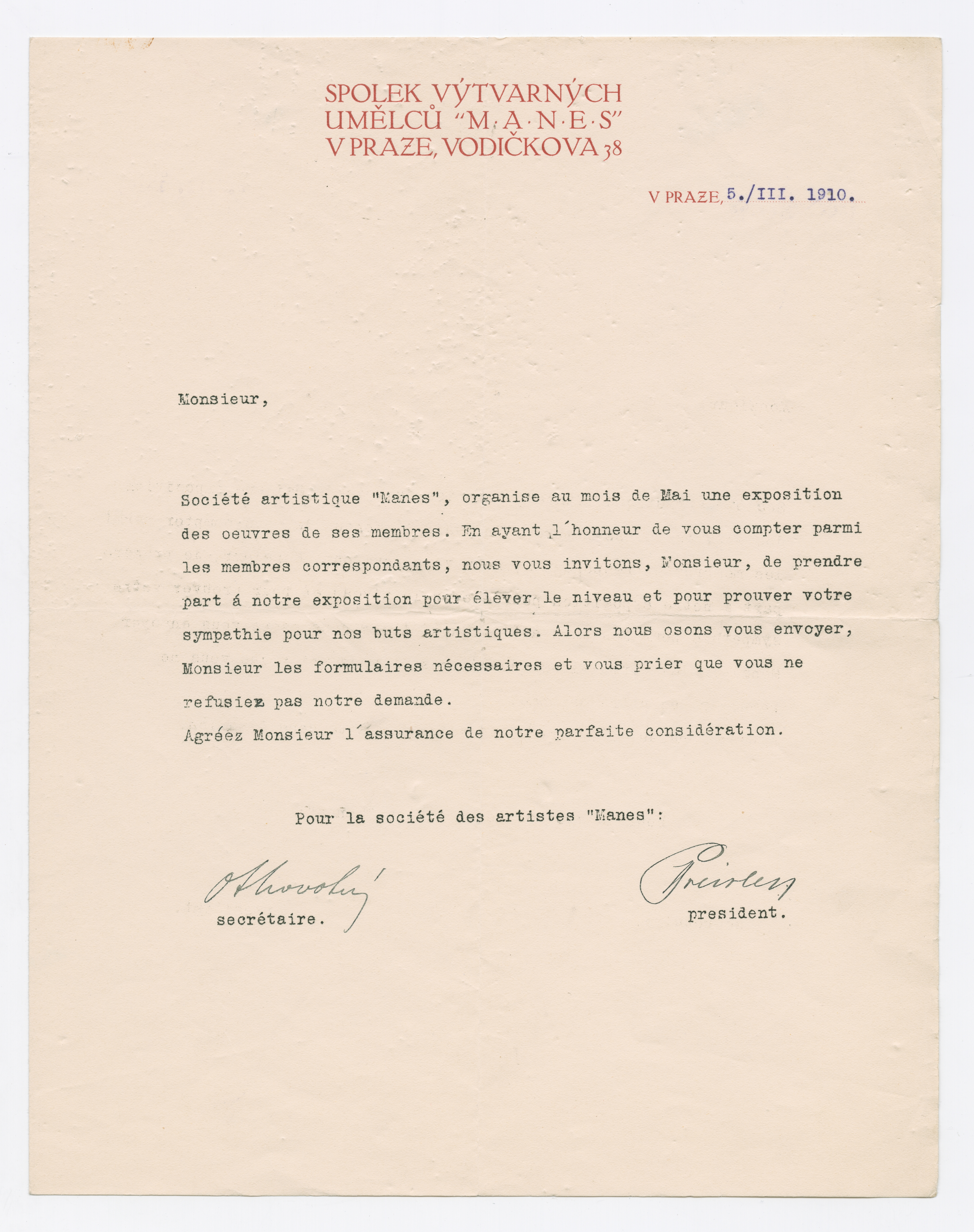 MM K 4330, Munchmuseet. Datert 05.03.1910. Brev fra Kunsterklubben "MANES", Otakar Novotný, Jan Preisler.