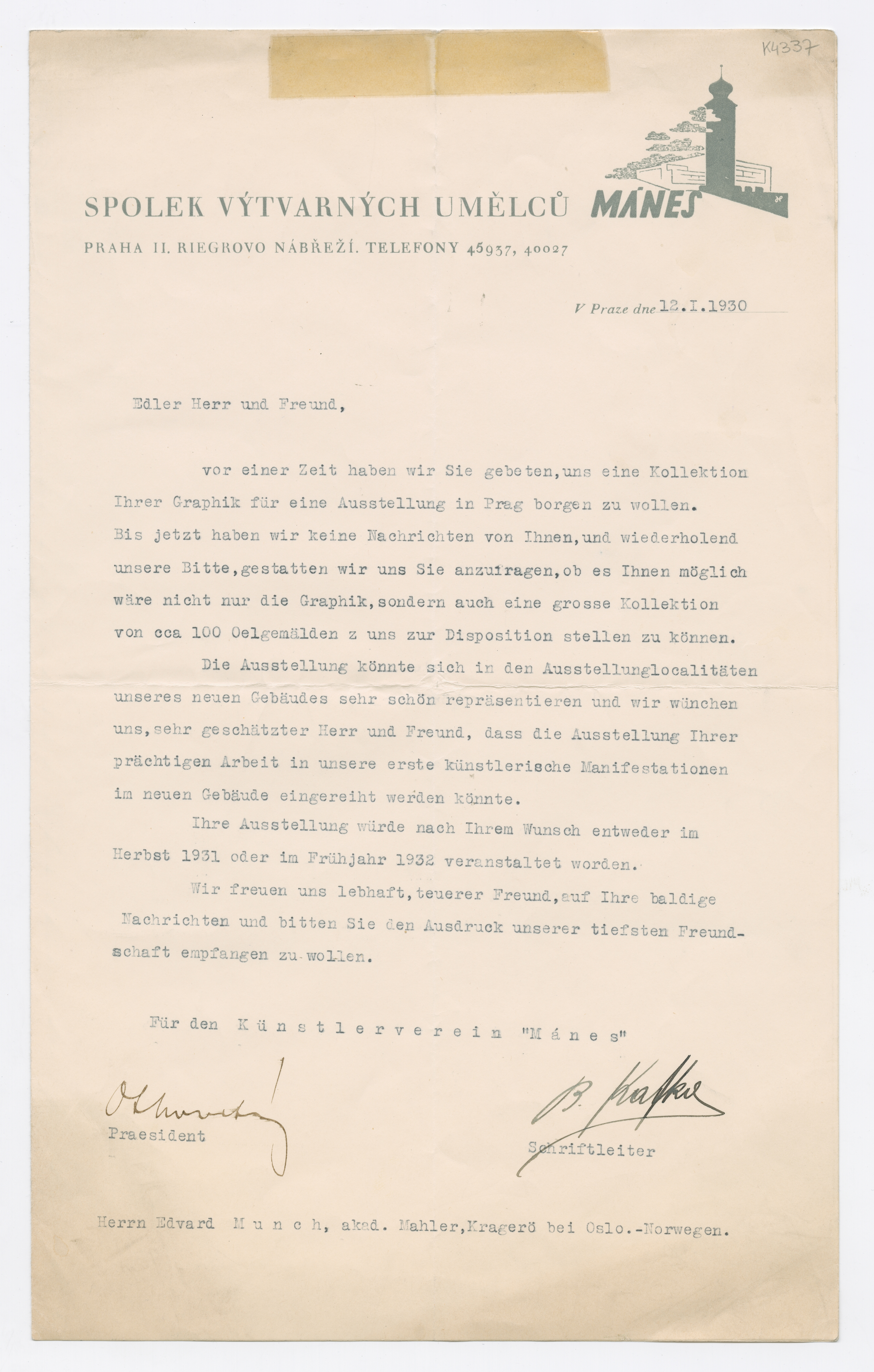 MM K 4337, Munchmuseet. Datert 12.01.1930. Brev fra Kunsterklubben "MANES", Otakar Novotný, Bohumil Kafka.