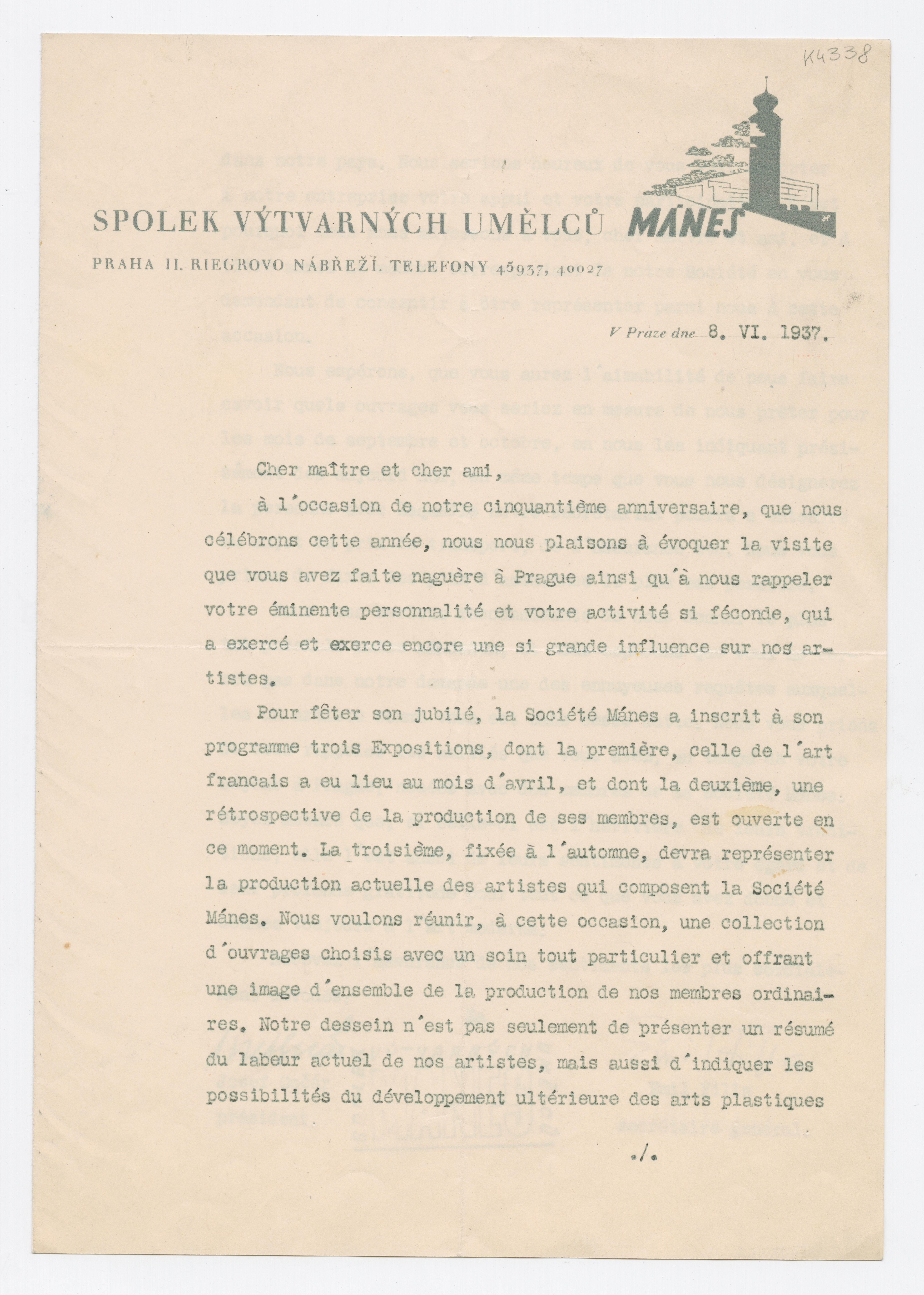 MM K 4338, Munchmuseet. Datert 08.06.1937. Brev fra Kunsterklubben "MANES", Josef Gočár, Emil Filla.