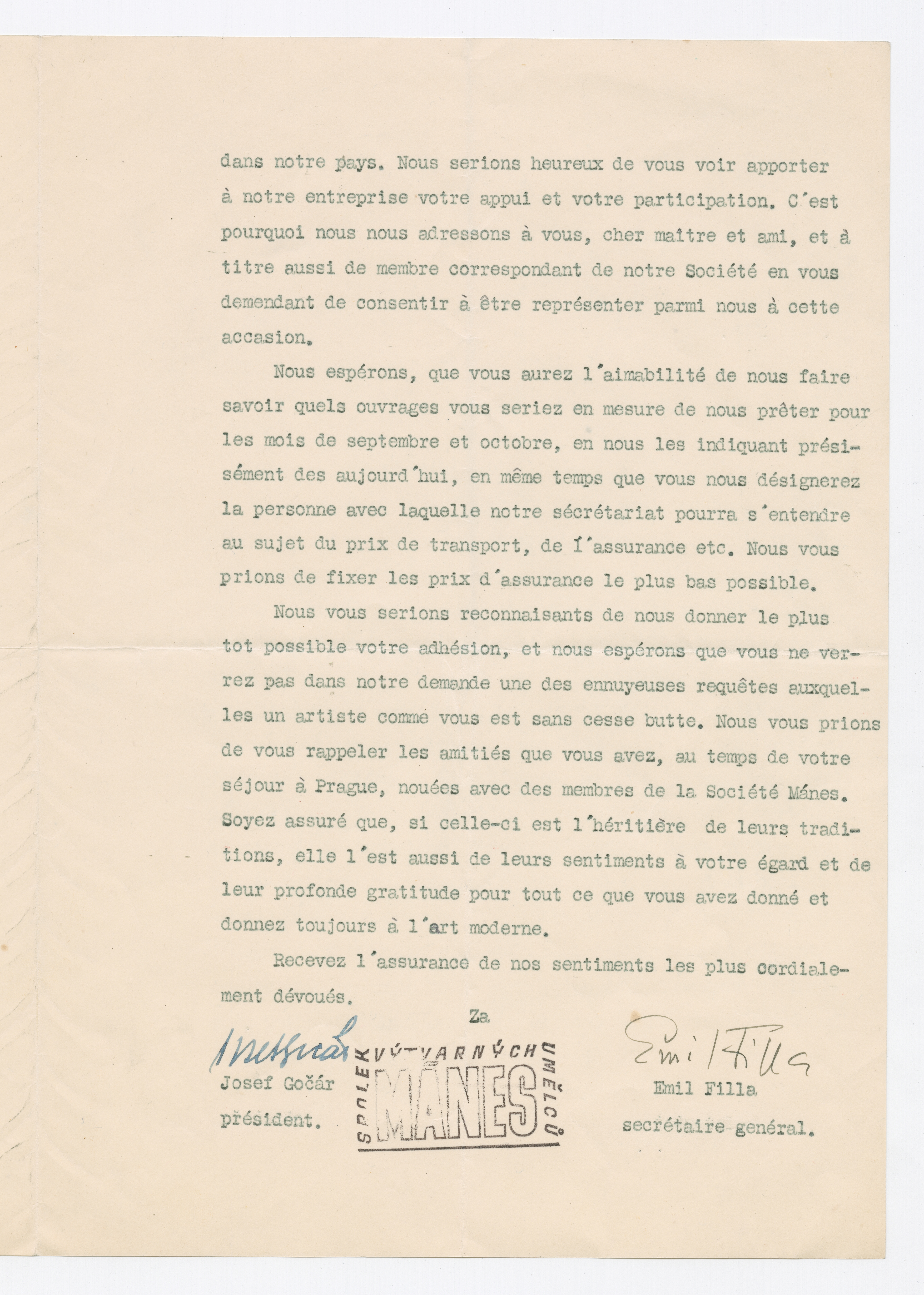 Brev fra Kunsterklubben "MANES", Josef Gočár, Emil Filla.