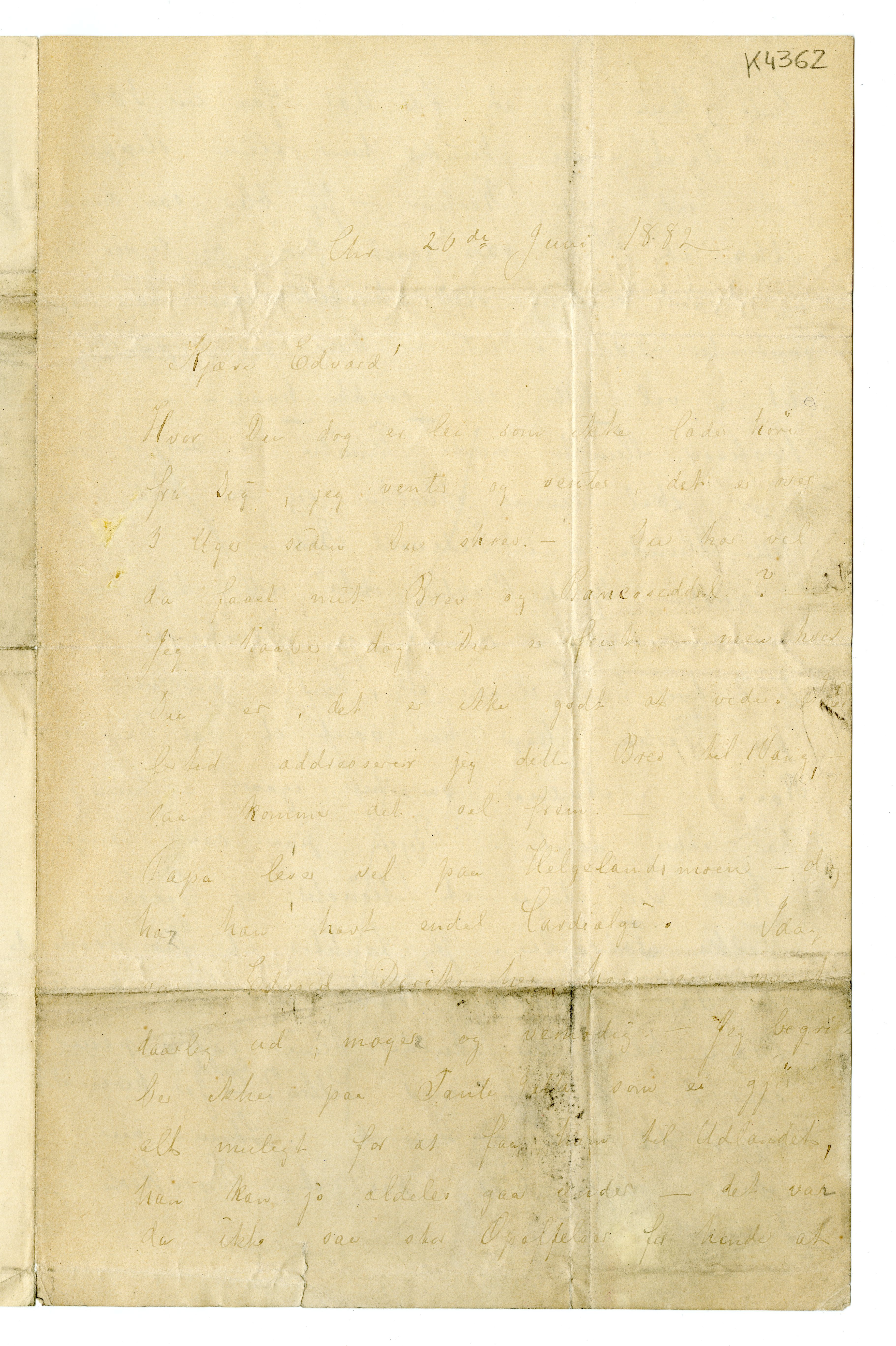 MM K 4362, Munchmuseet. Datert 20.06.1882. Brev fra Karen Bjølstad.