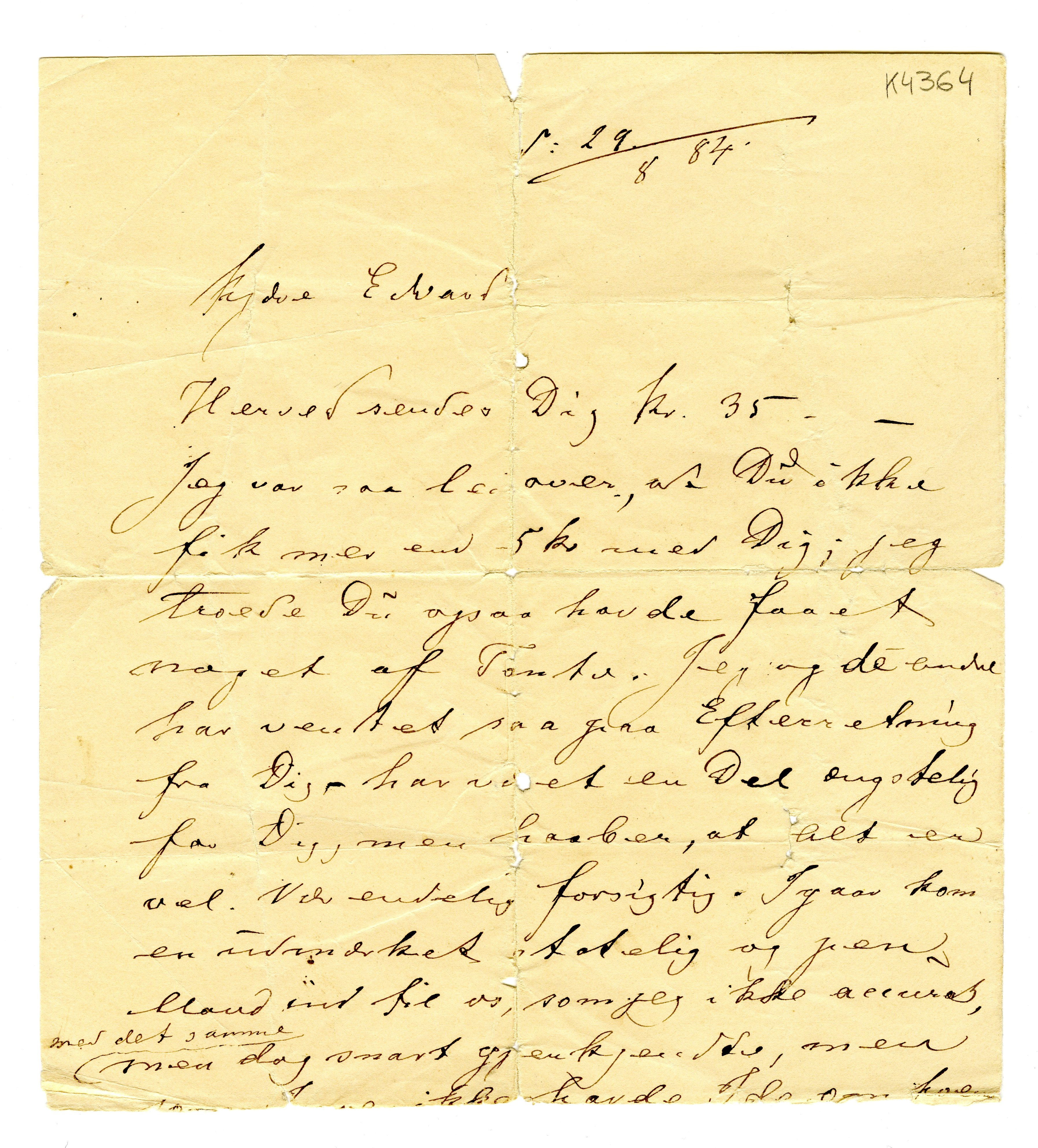 MM K 4364, Munchmuseet. Datert 29.08.1884. Brev fra Christian Munch.
