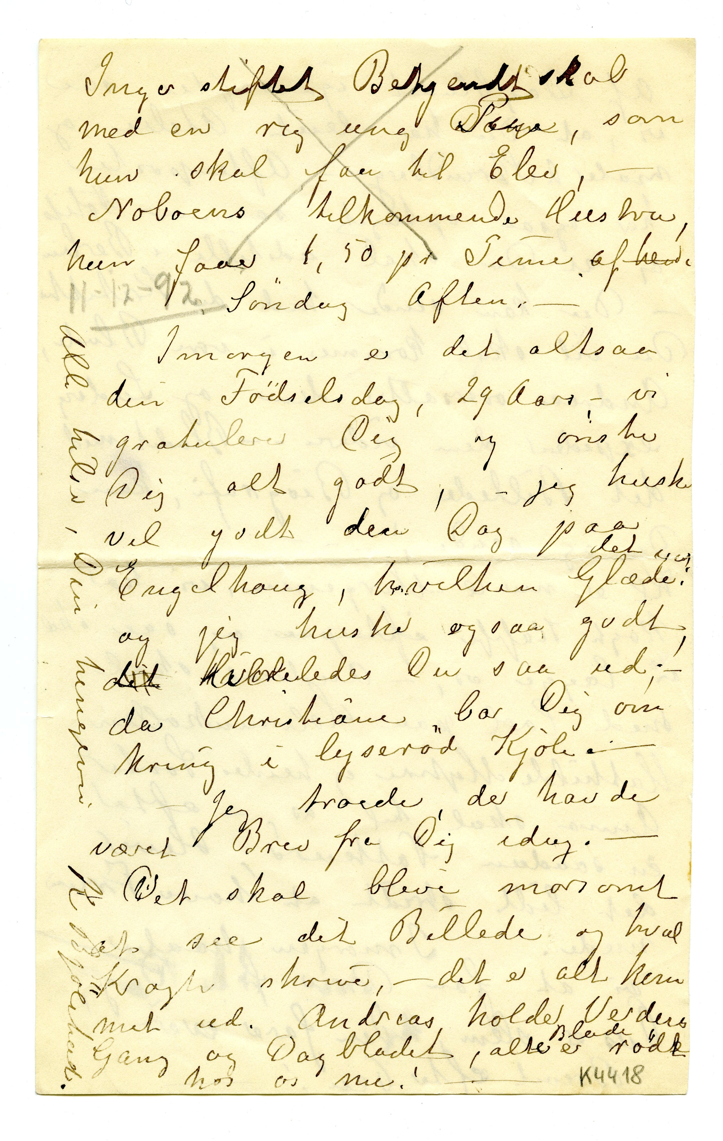 MM K 4418, Munchmuseet. Datert 28.11.1892. Brev fra Karen Bjølstad.