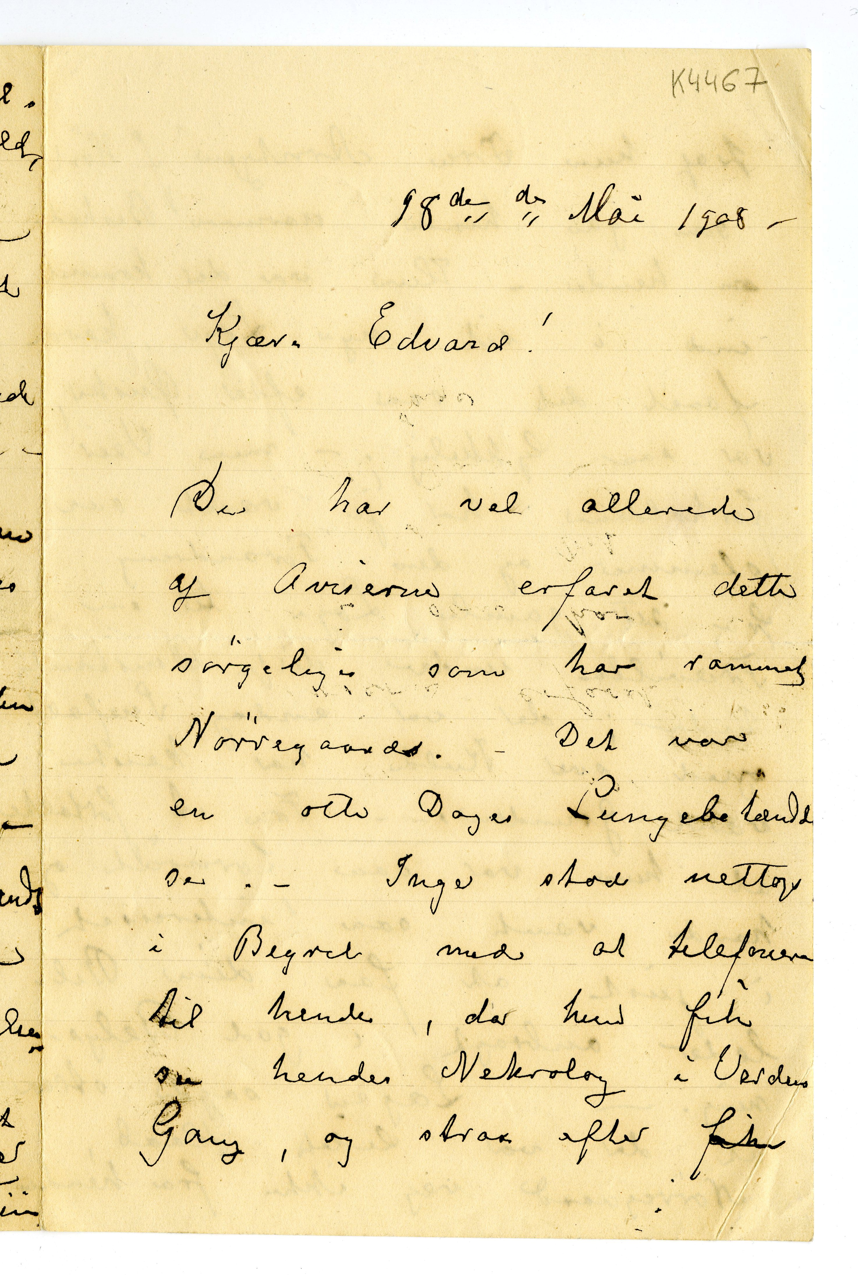 MM K 4467, Munchmuseet. Datert 18.05.1908. Brev fra Karen Bjølstad.