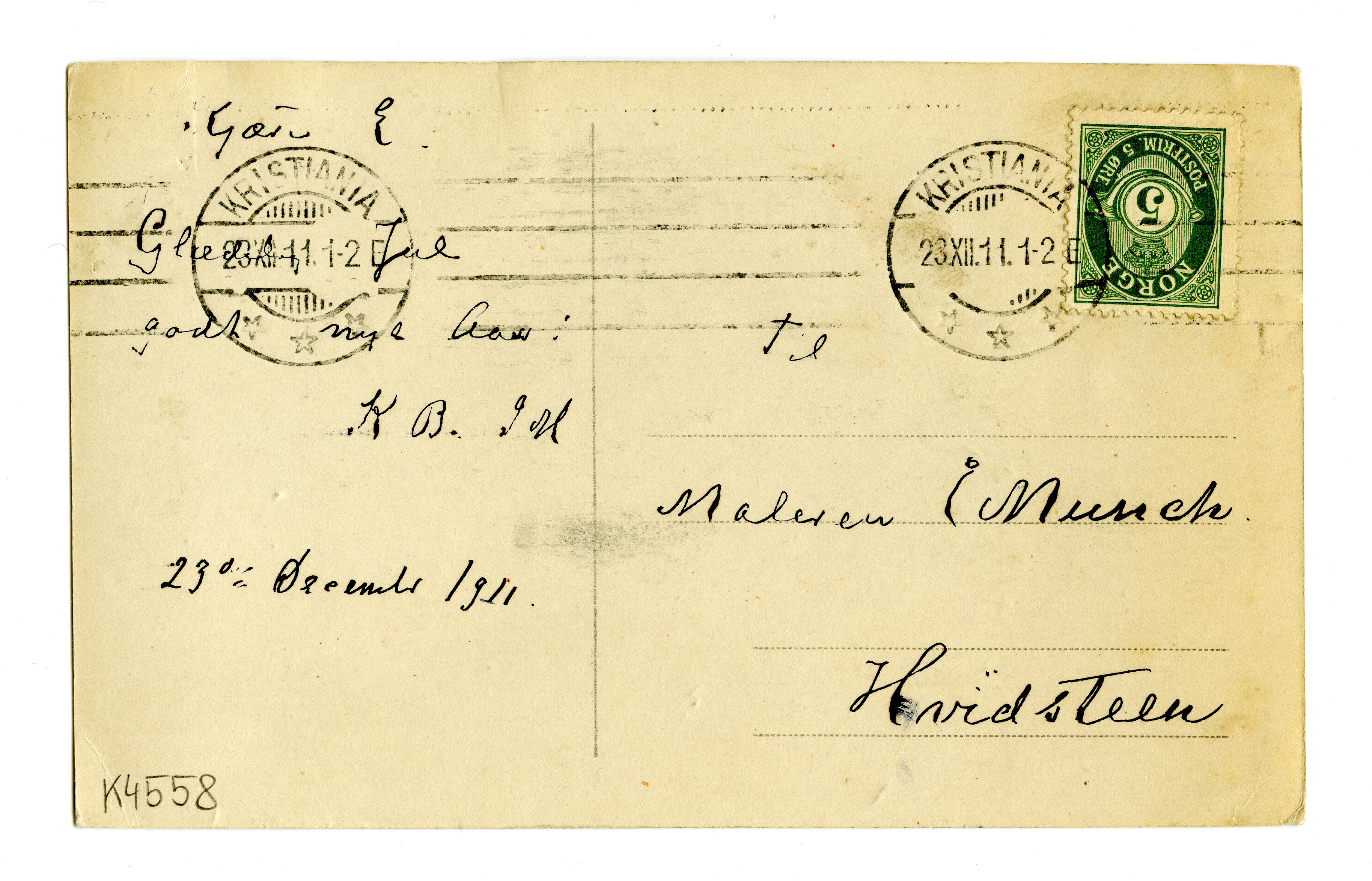 MM K 4558, Munchmuseet. Datert 23.12.1911. Brev fra Karen Bjølstad.