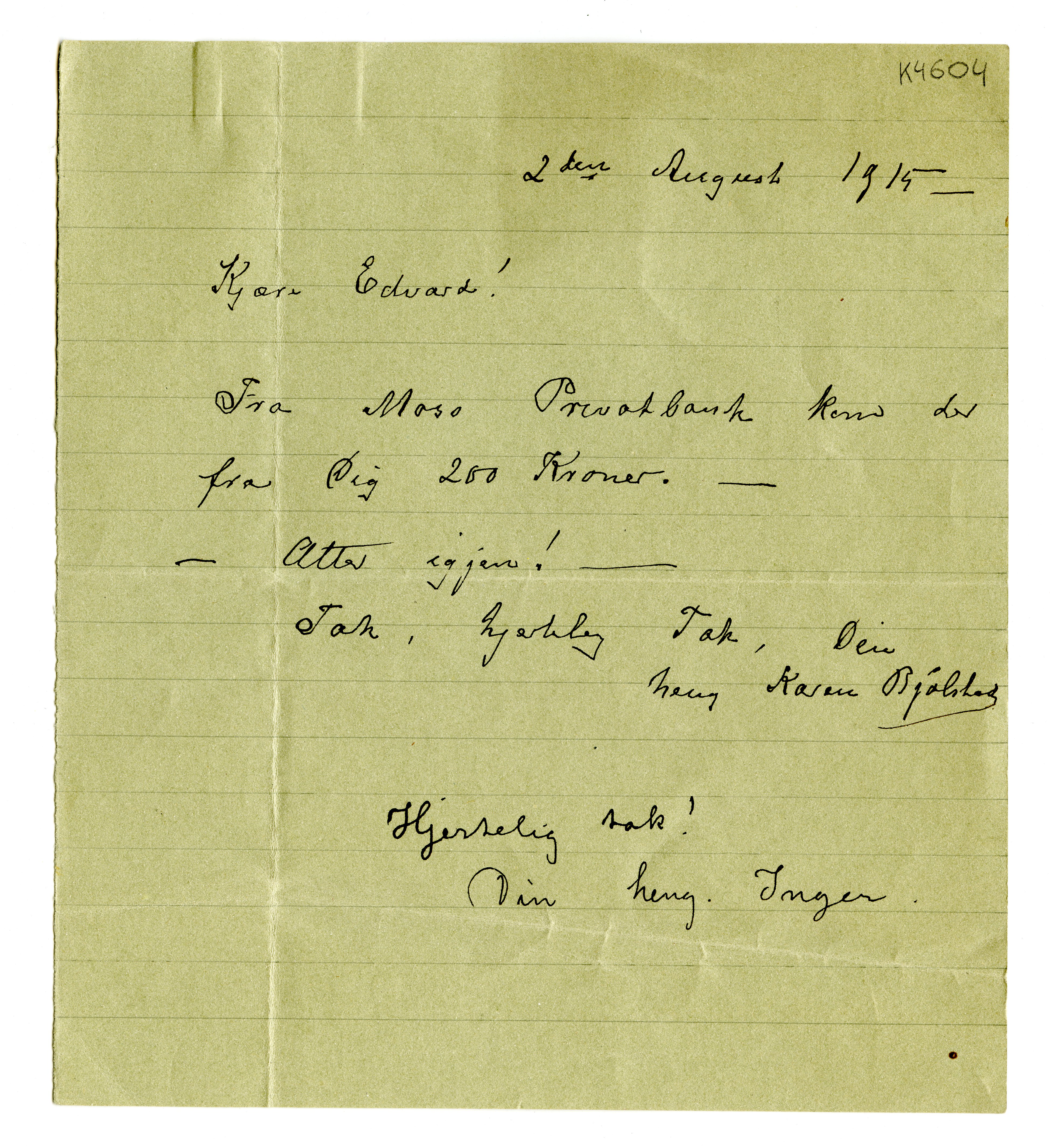 MM K 4604, Munchmuseet. Datert 02.08.1915. Brev fra Karen Bjølstad.