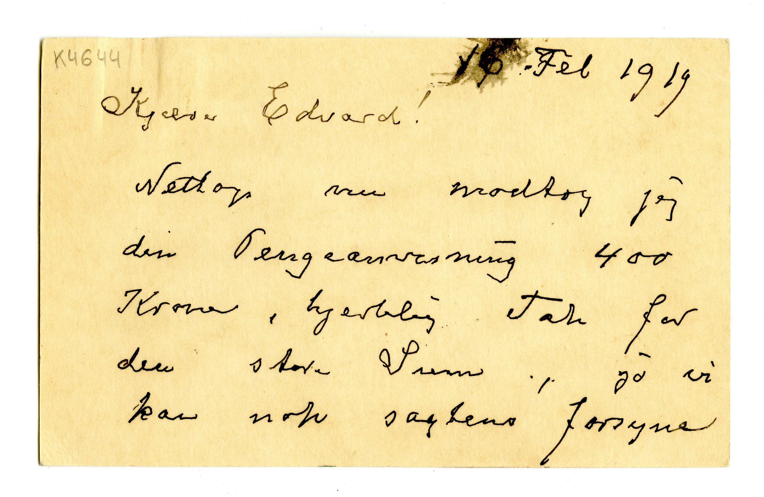 MM K 4644, Munchmuseet. Datert 16.02.1919. Brev fra Karen Bjølstad.
