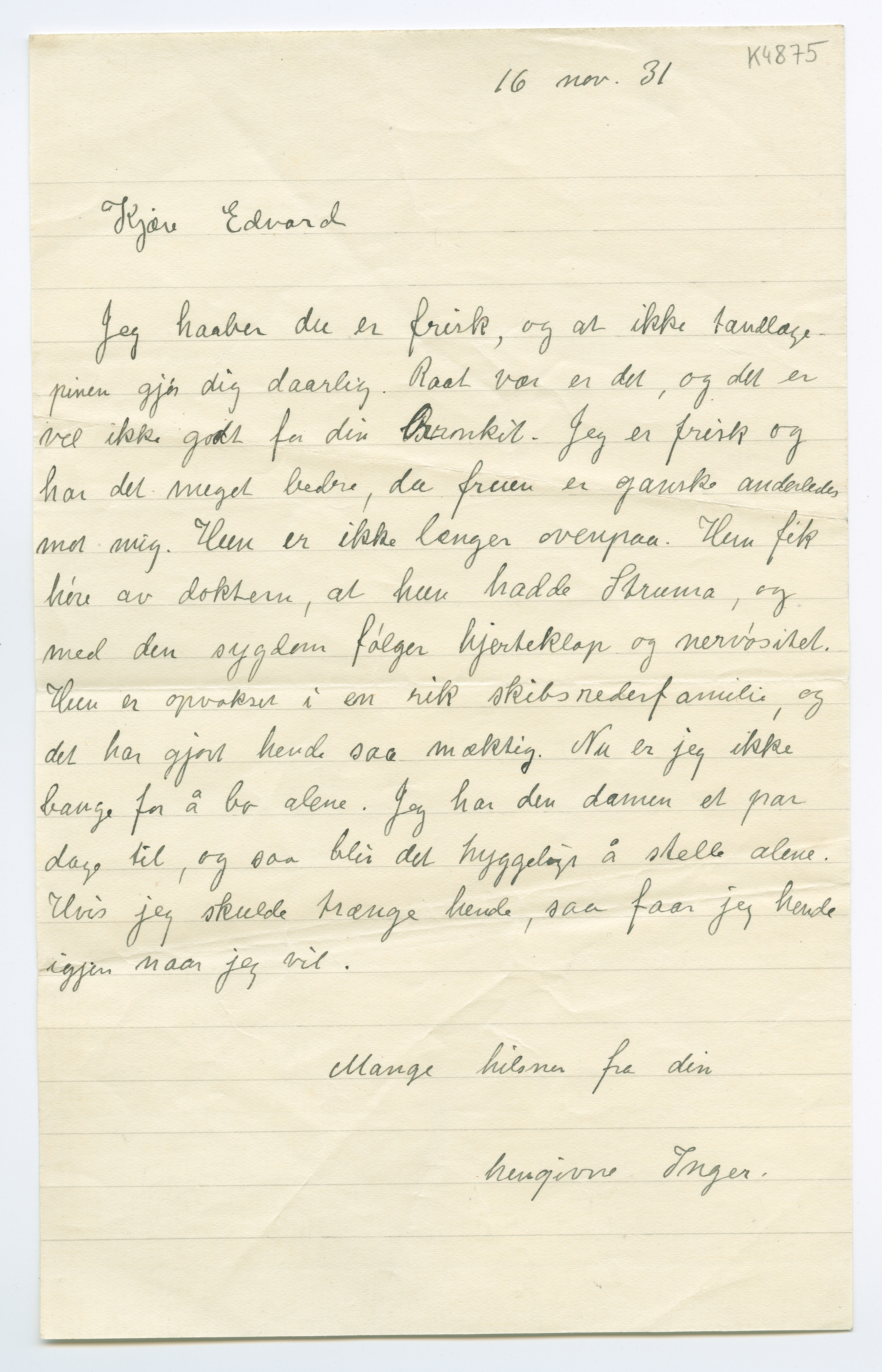 MM K 4875, Munchmuseet. Datert 16.11.1931. Brev fra Inger Munch.