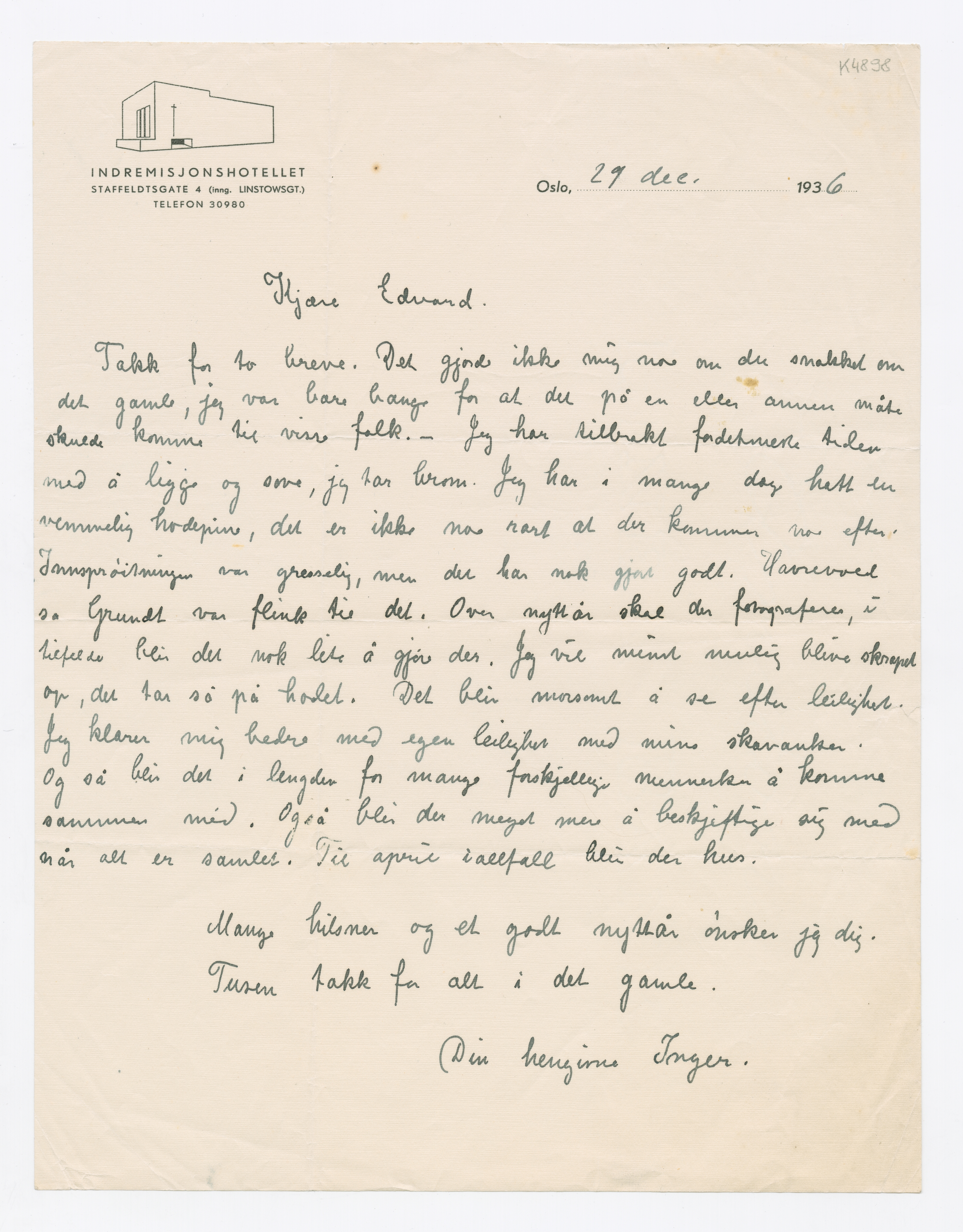 MM K 4898, Munchmuseet. Datert 29.12.1936. Brev fra Inger Munch.