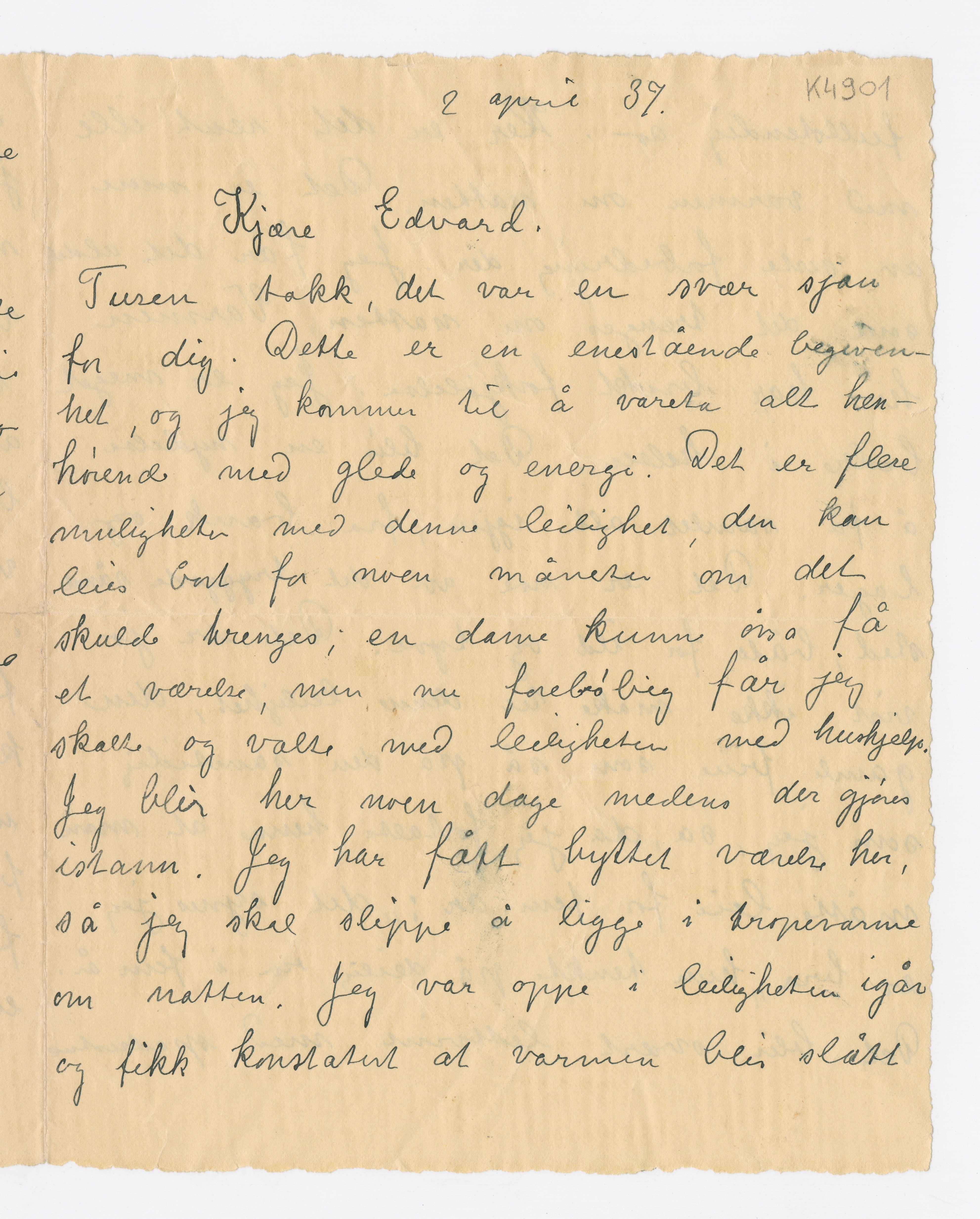 MM K 4901, Munchmuseet. Datert 02.04.1937. Brev fra Inger Munch.
