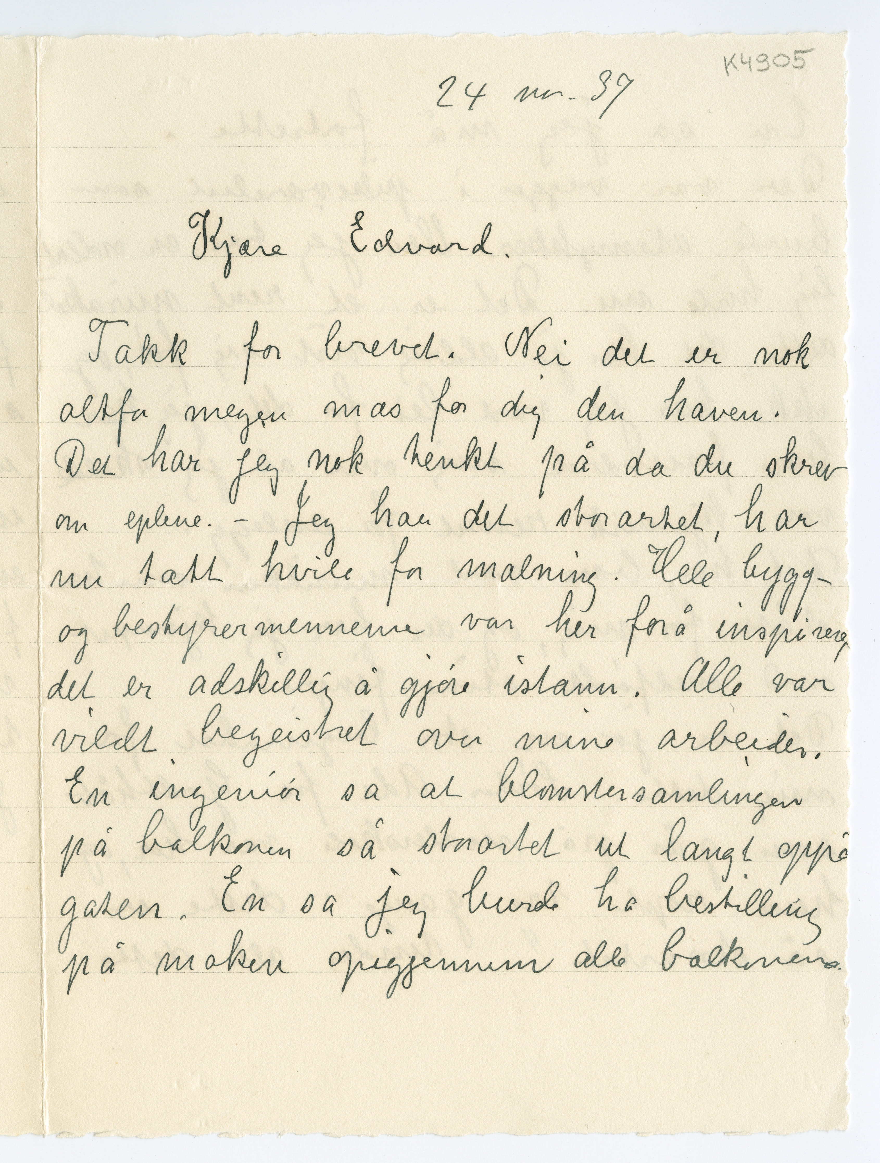 MM K 4905, Munchmuseet. Datert 24.11.1937. Brev fra Inger Munch.