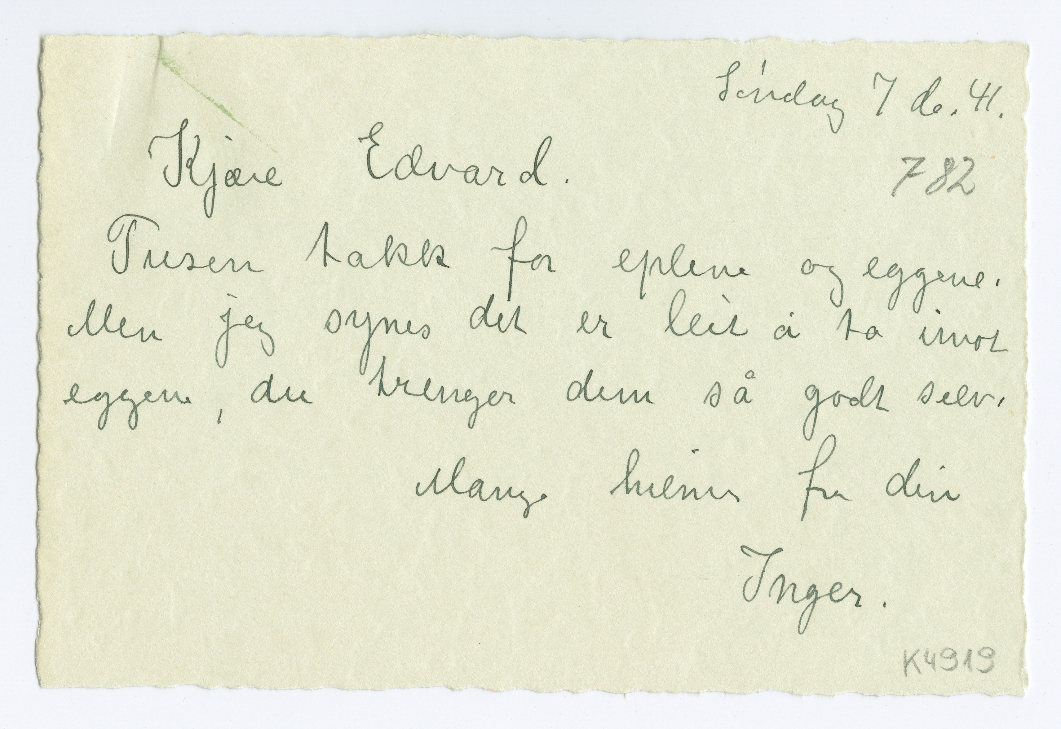 MM K 4919, Munchmuseet. Datert 07.12.1941. Brev fra Inger Munch.