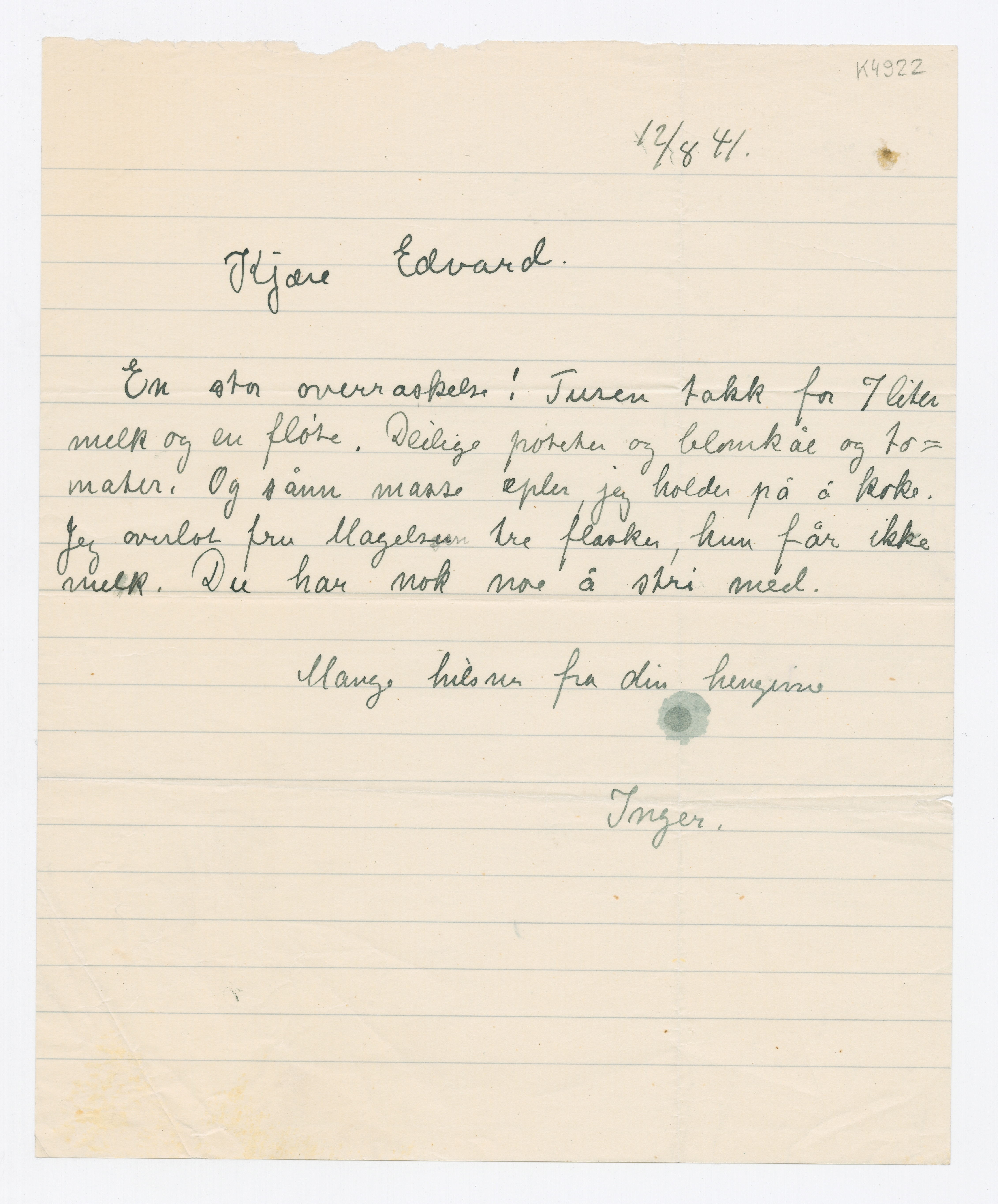 MM K 4922, Munchmuseet. Datert 12.08.1941. Brev fra Inger Munch.