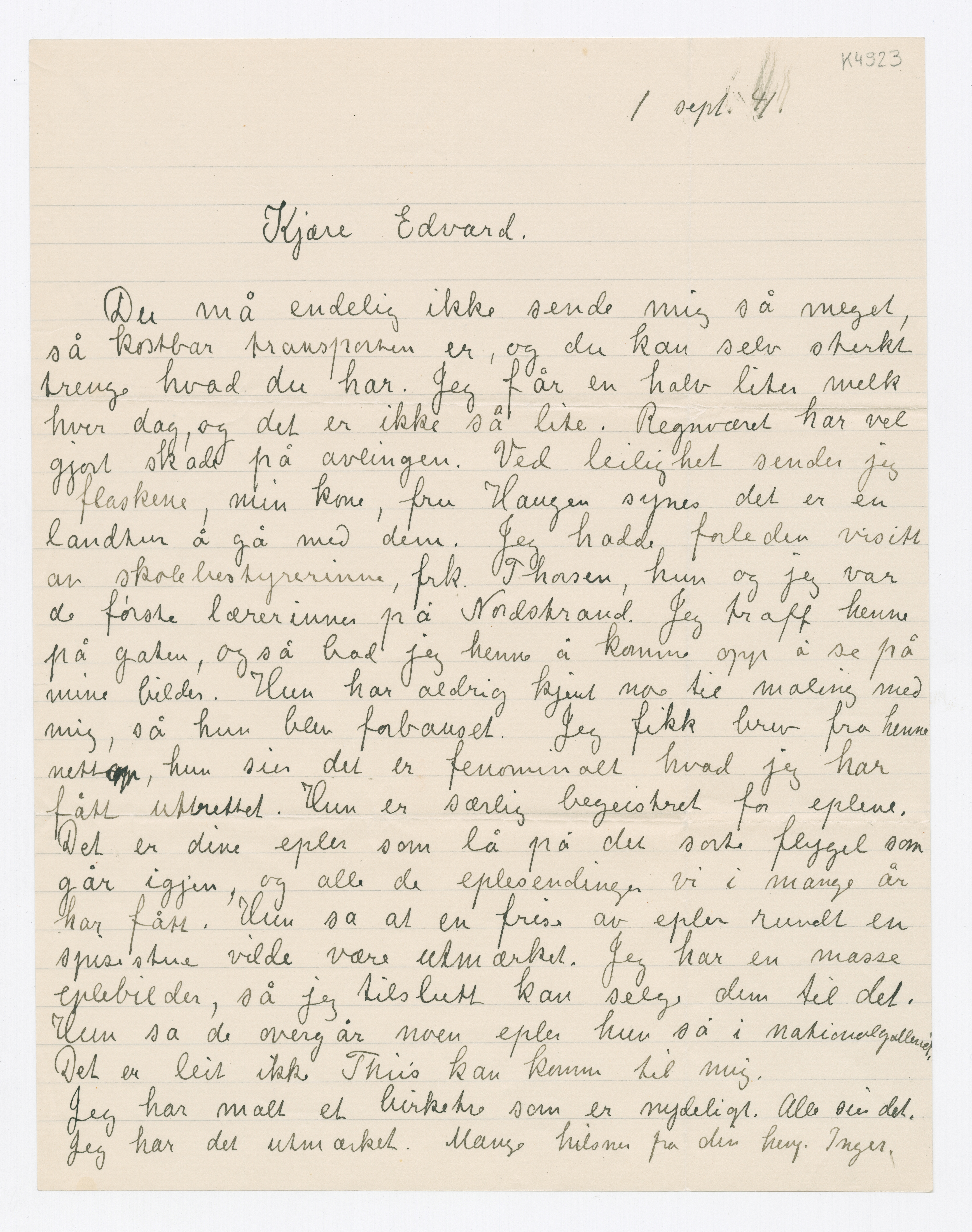 MM K 4923, Munchmuseet. Datert 01.09.1941. Brev fra Inger Munch.
