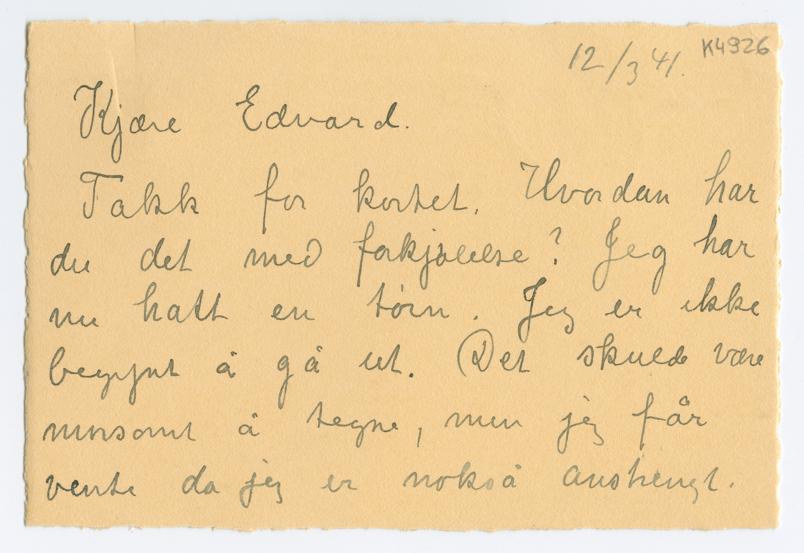 MM K 4926, Munchmuseet. Datert 12.03.1941. Brev fra Inger Munch.