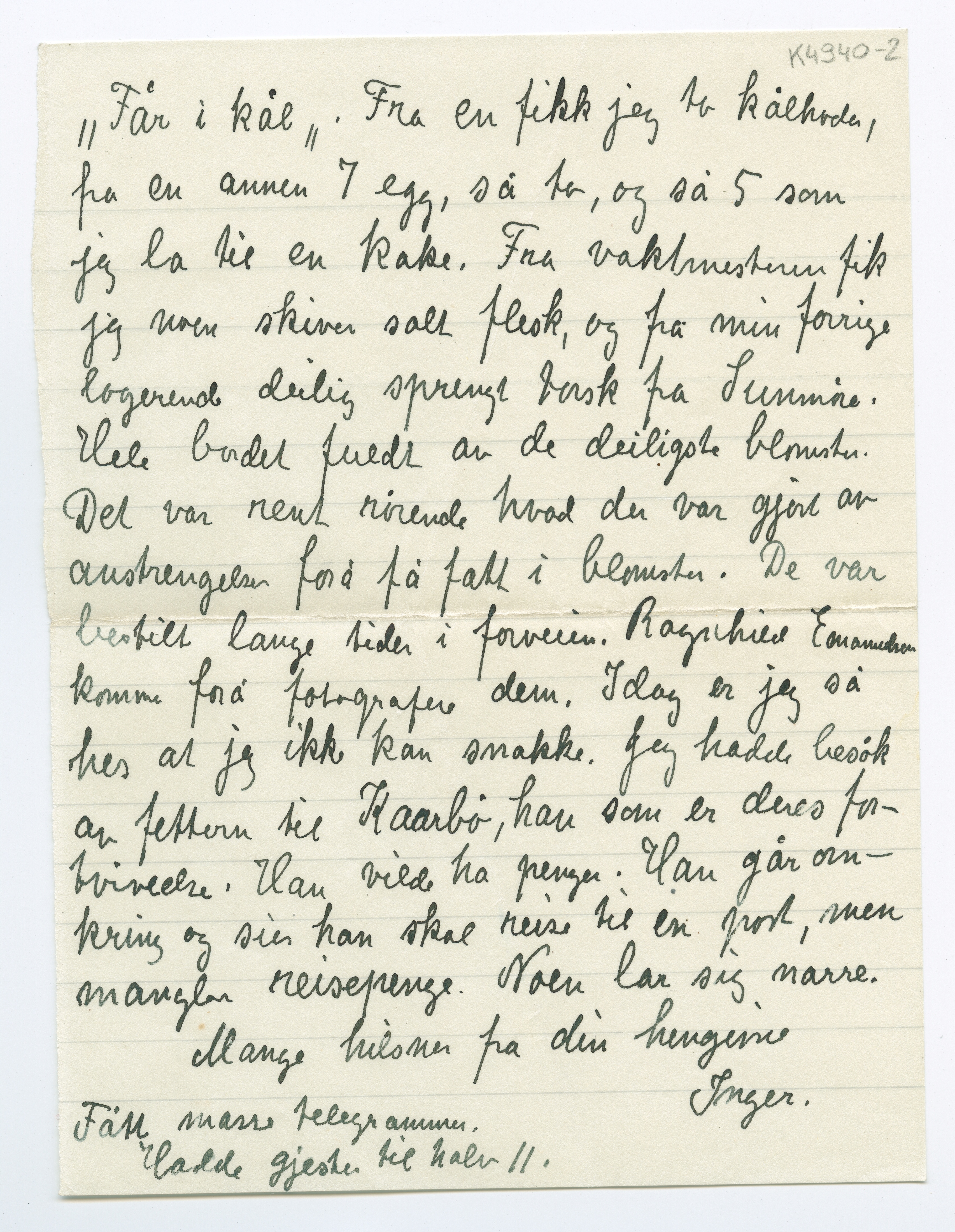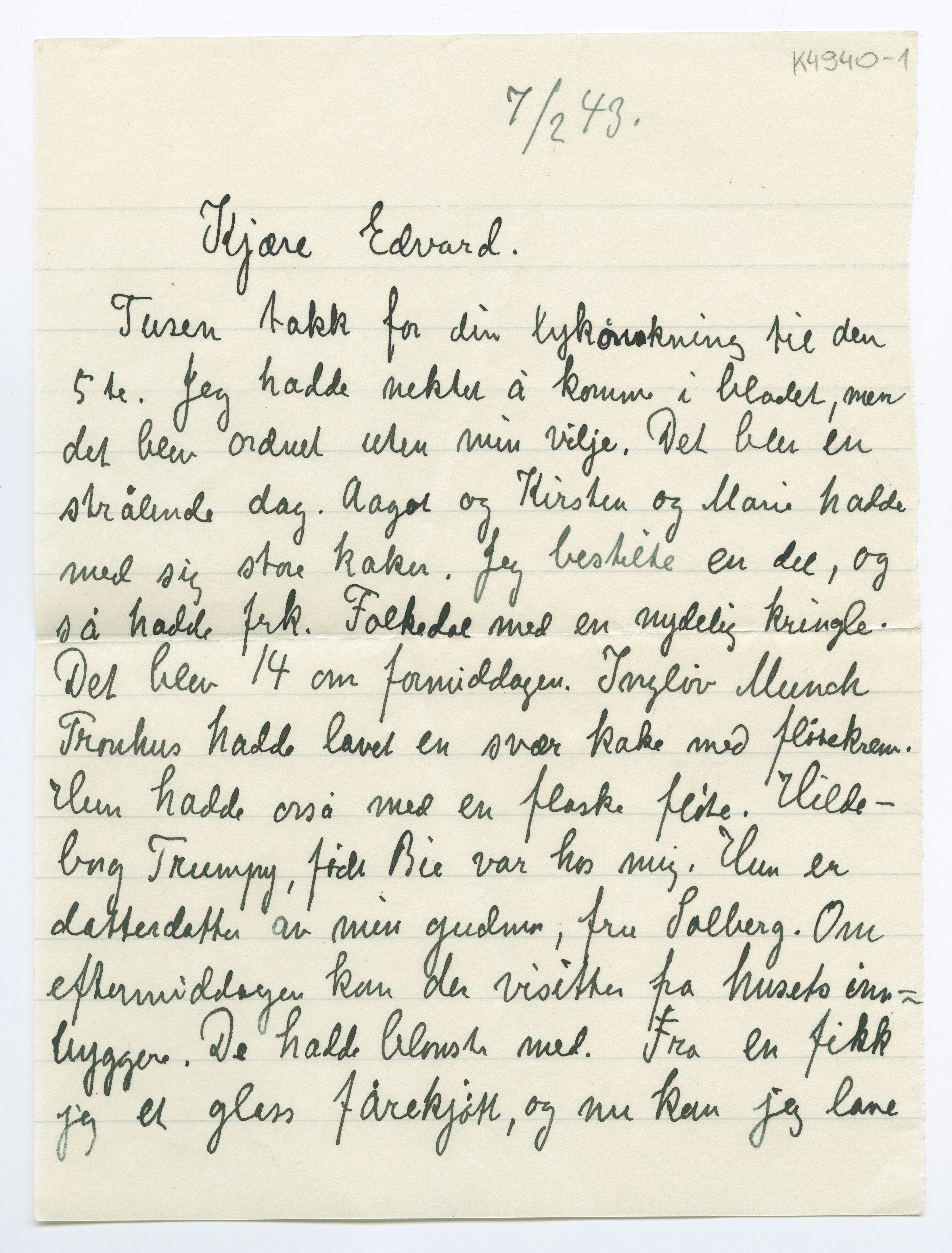 MM K 4940, Munchmuseet. Datert 07.02.1943. Brev fra Inger Munch.