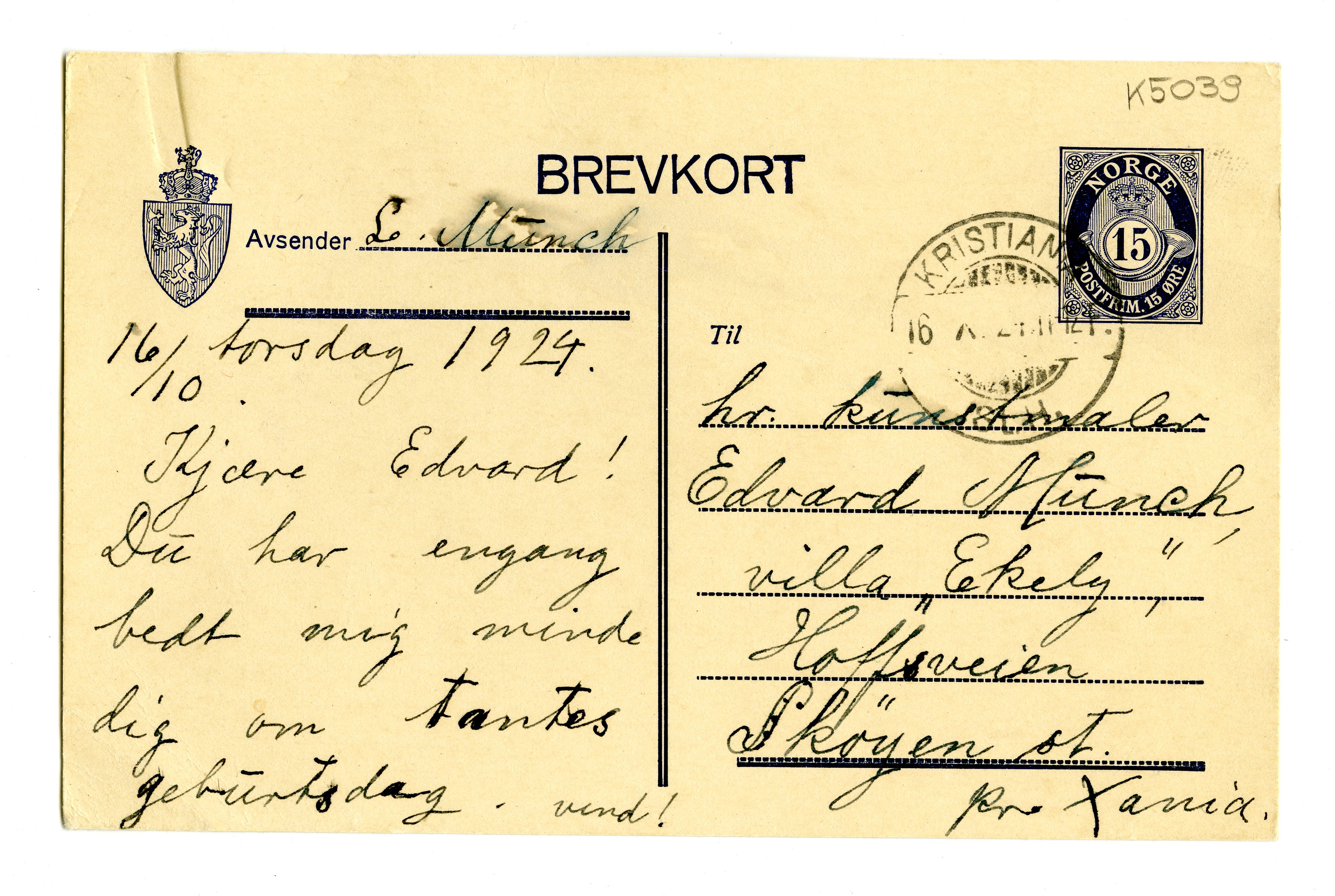 MM K 5039, Munchmuseet. Datert 16.10.1924. Brev fra Laura Munch.